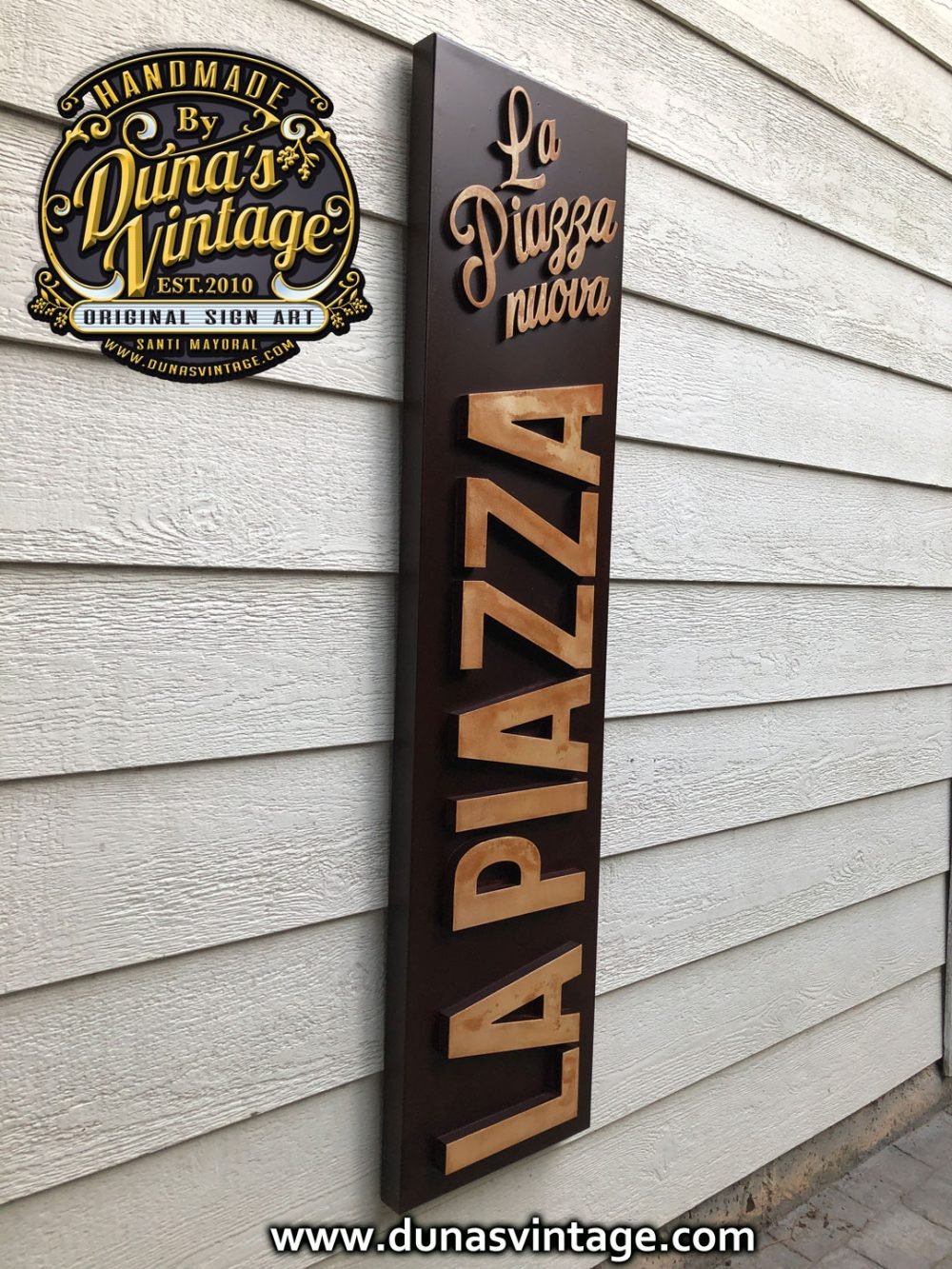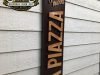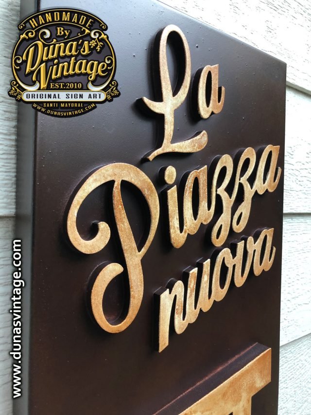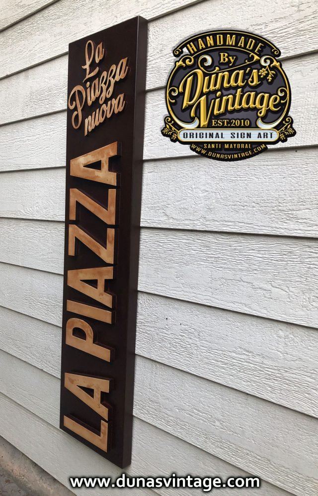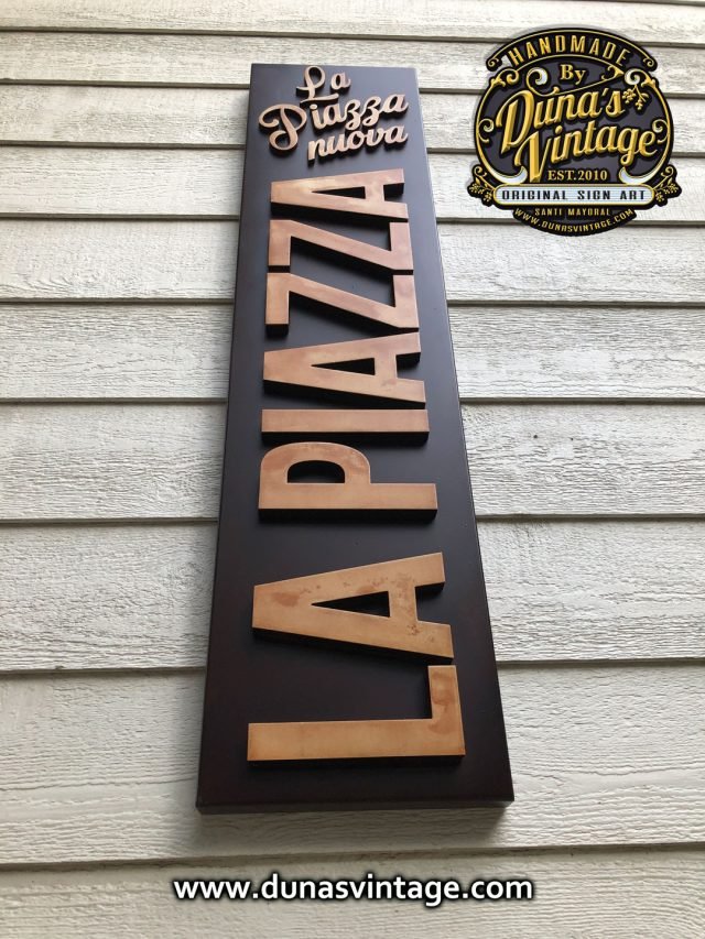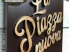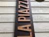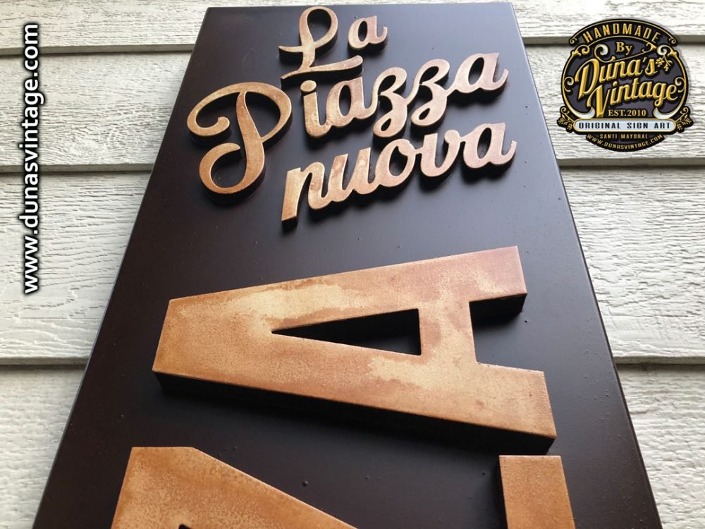 Cartel en Aluminio La Piazza Nuova, este cartel esta trabajado el cajón en aluminio y las letras en PVC de 18mm y el logo en 10mm atornillado a la base y luego con un efecto en Oxido, tamaño 136x32cm.