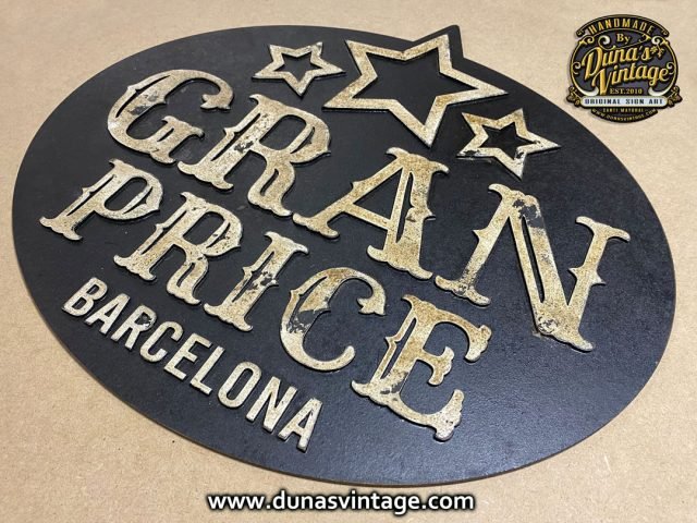 Cartel en DM con relieve de 4mm GRAN PRICE BARCELONA , tamaño 463x430mm.