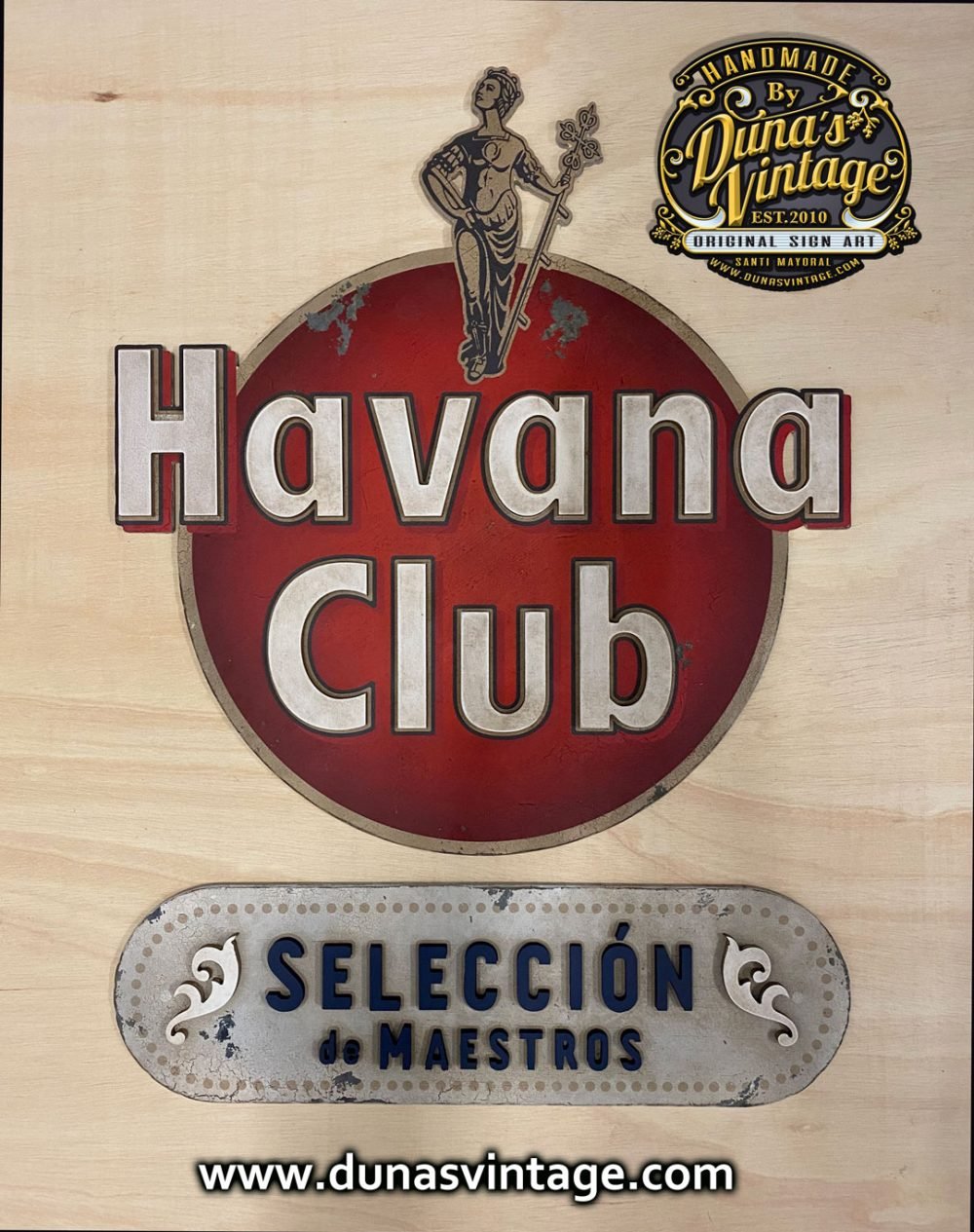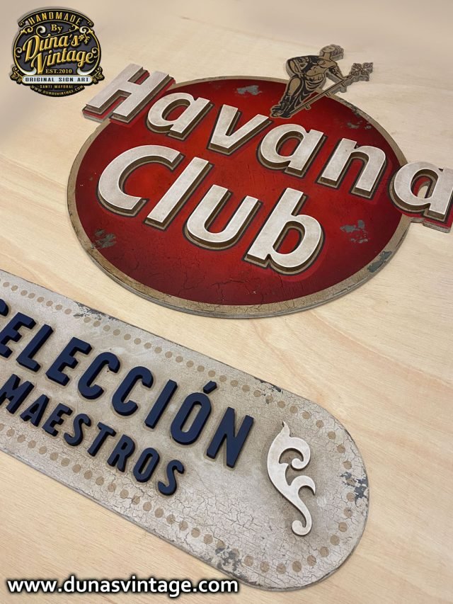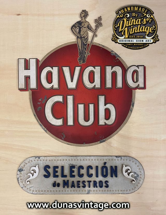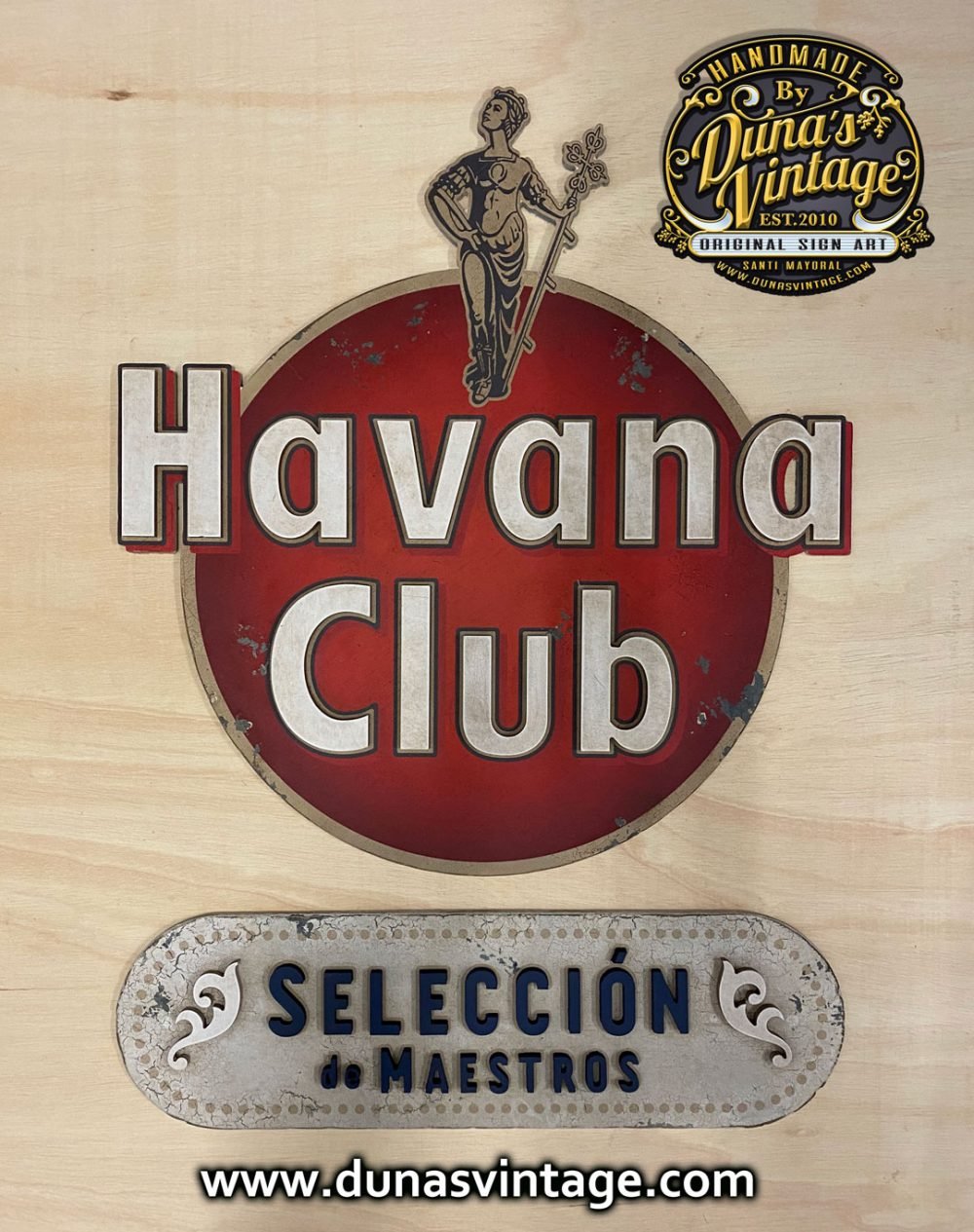 Escudo trabajado en Madera sobre impresión digital con letras en relieve de 19mm y de 10mm, como podéis apreciar cada cartel tiene un acabado diferente para darle un toque más autentico y original. Tamaño Havana Club 700x650mm, Selección de Maestros 650x192mm.