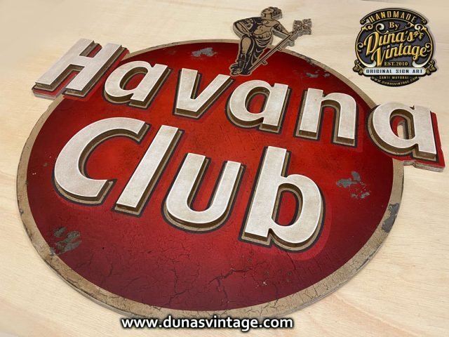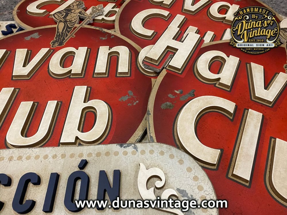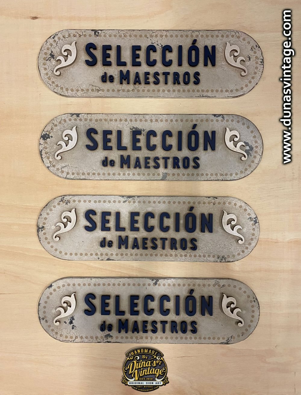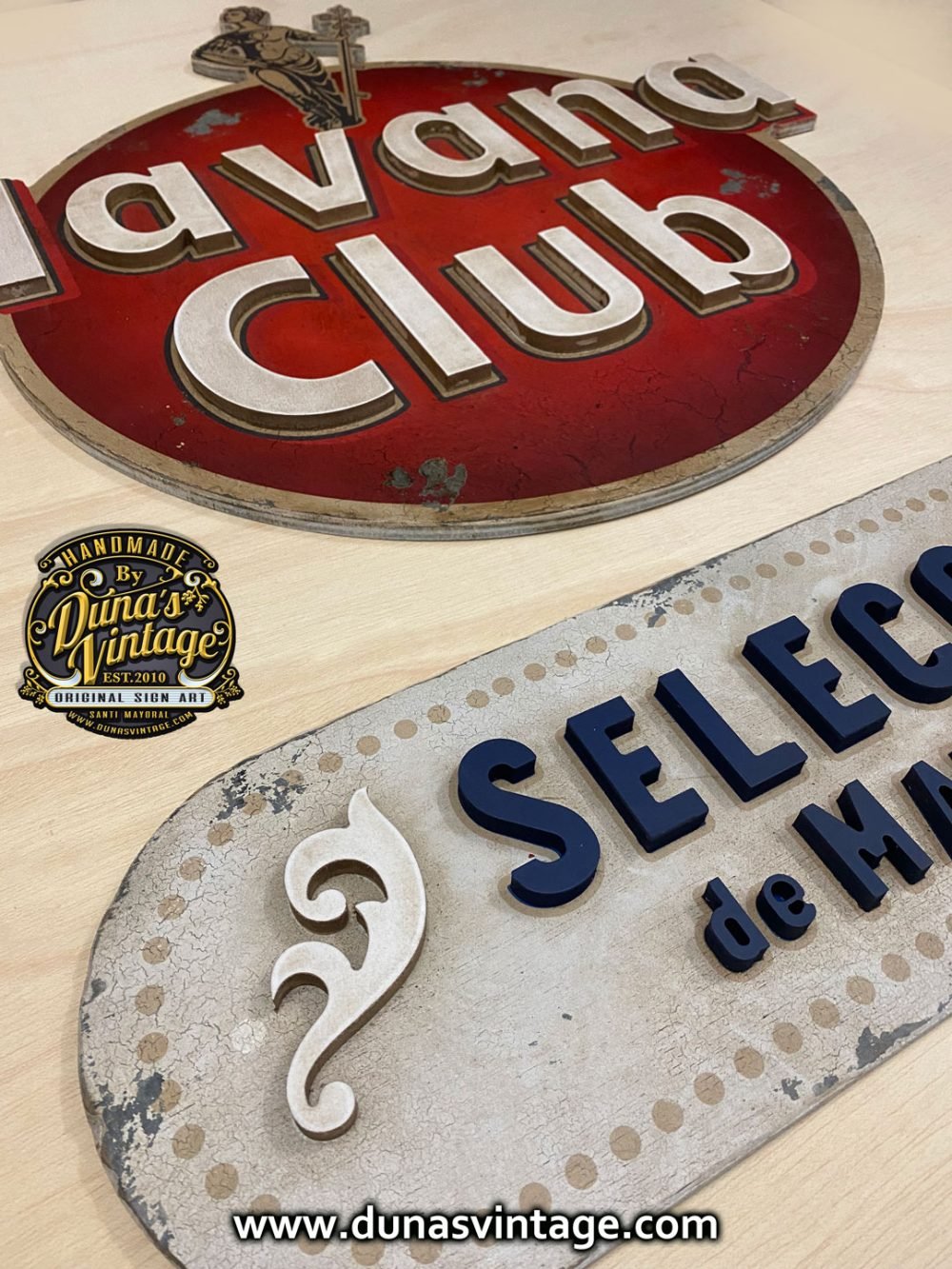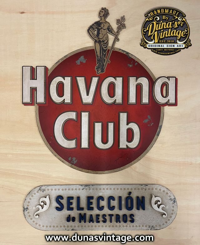 Escudo trabajado en Madera sobre impresión digital con letras en relieve de 19mm y de 10mm, como podéis apreciar cada cartel tiene un acabado diferente para darle un toque más autentico y original. Tamaño Havana Club 700x650mm, Selección de Maestros 650x192mm.
