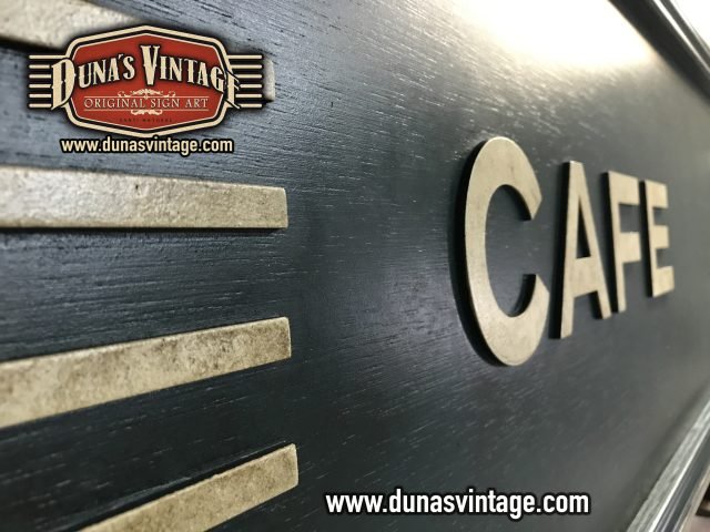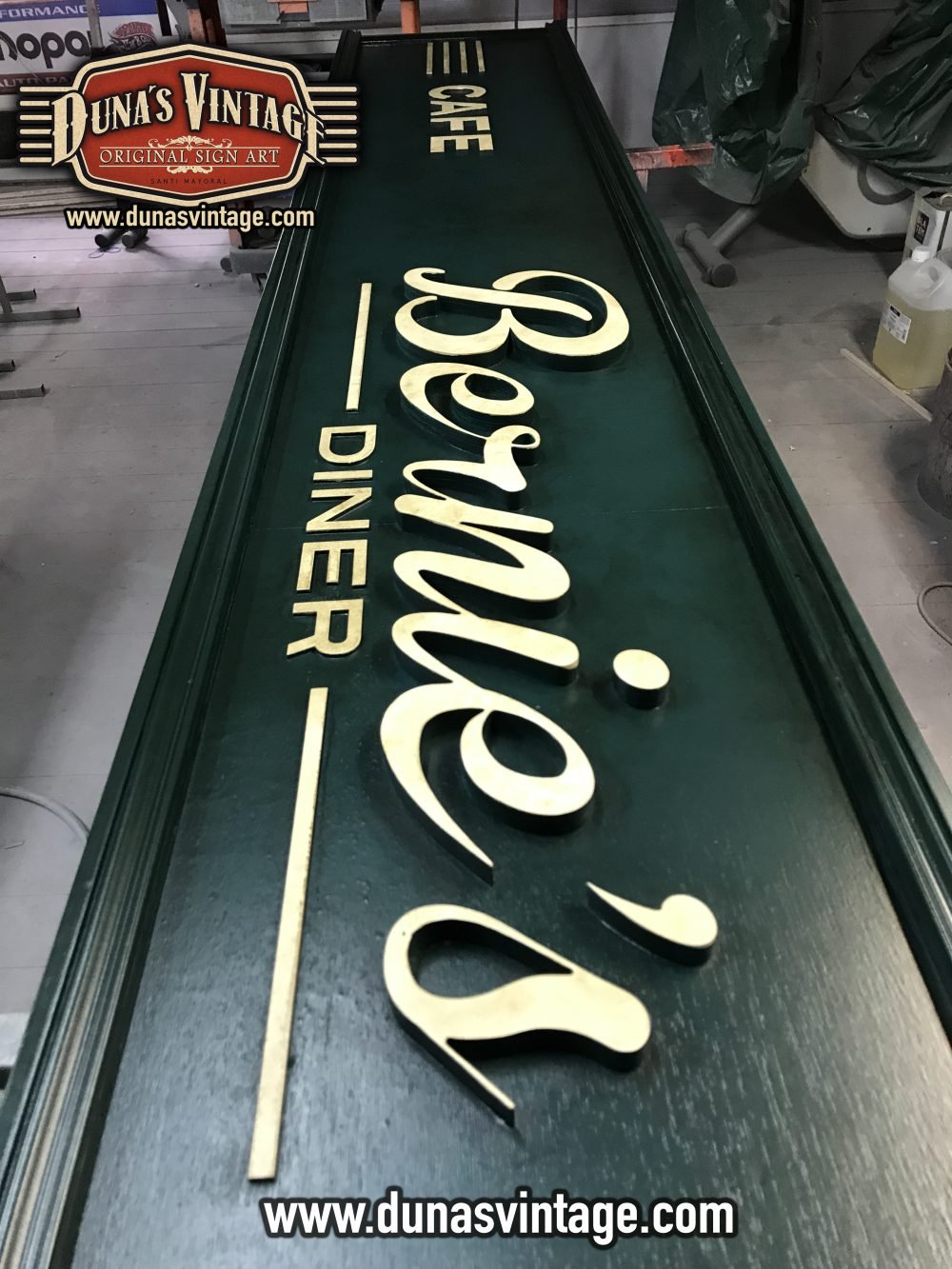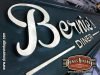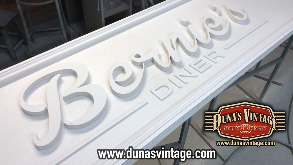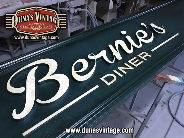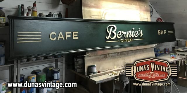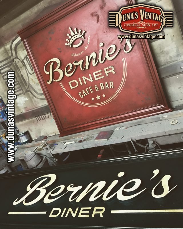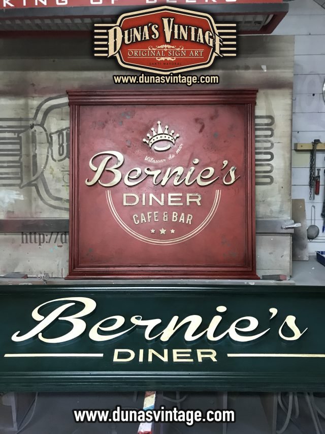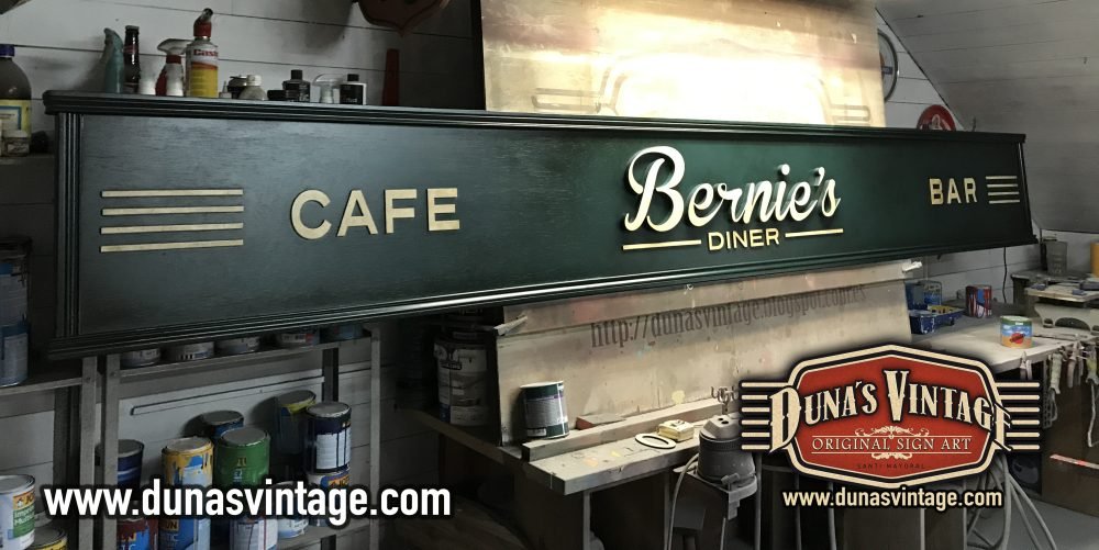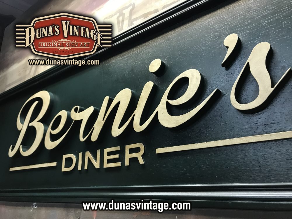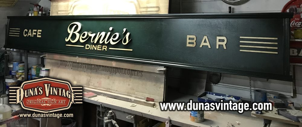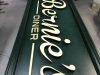 Cartel de Madera Bernie´s Diner Vilassar de Mar BCN, este cartel esta trabajado con madera de 18mm y letras corpóreas de 18mm las dimensiones del cartel son 3600x420mm en este cartel se a buscado un color verde oscuro con toques oscuros para darle una apariencia mas autentica.