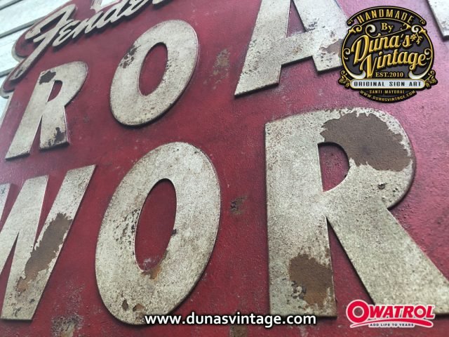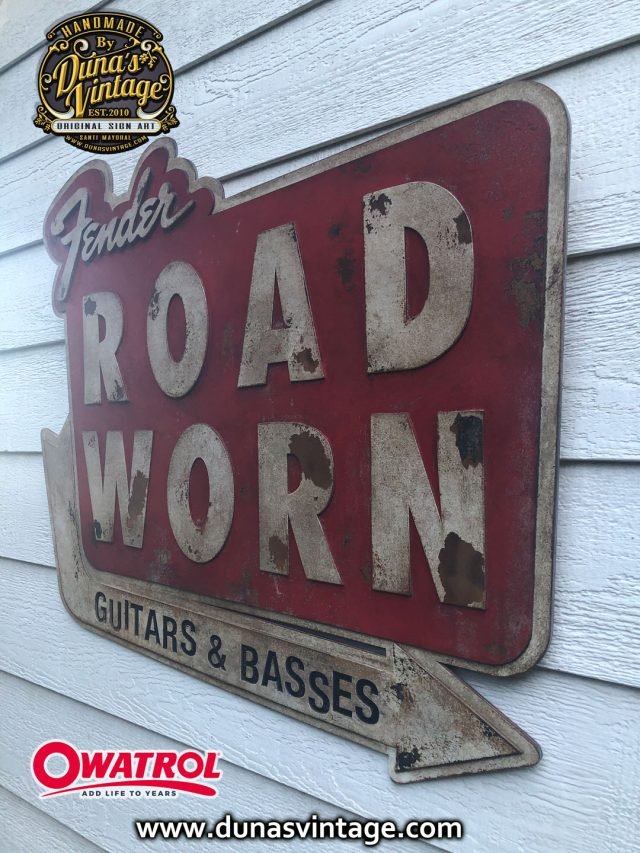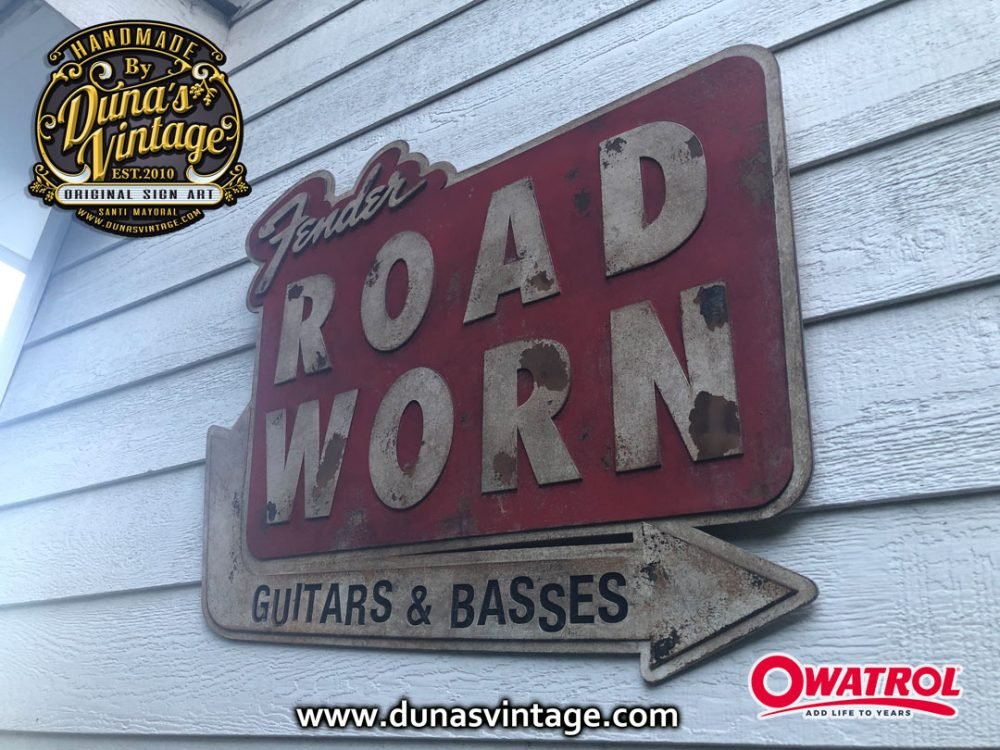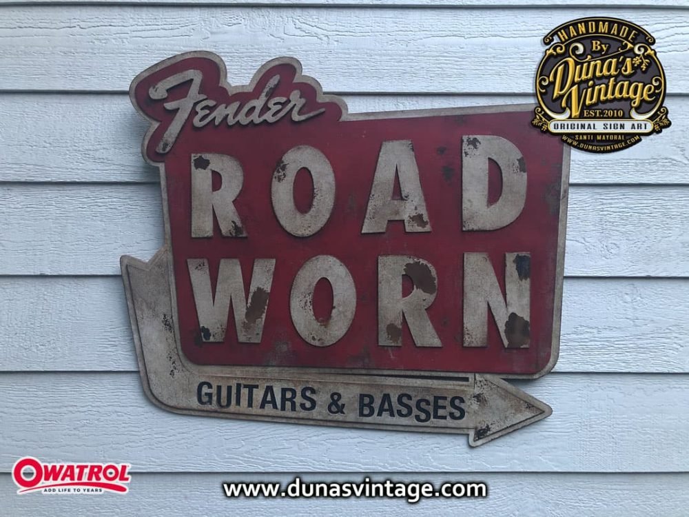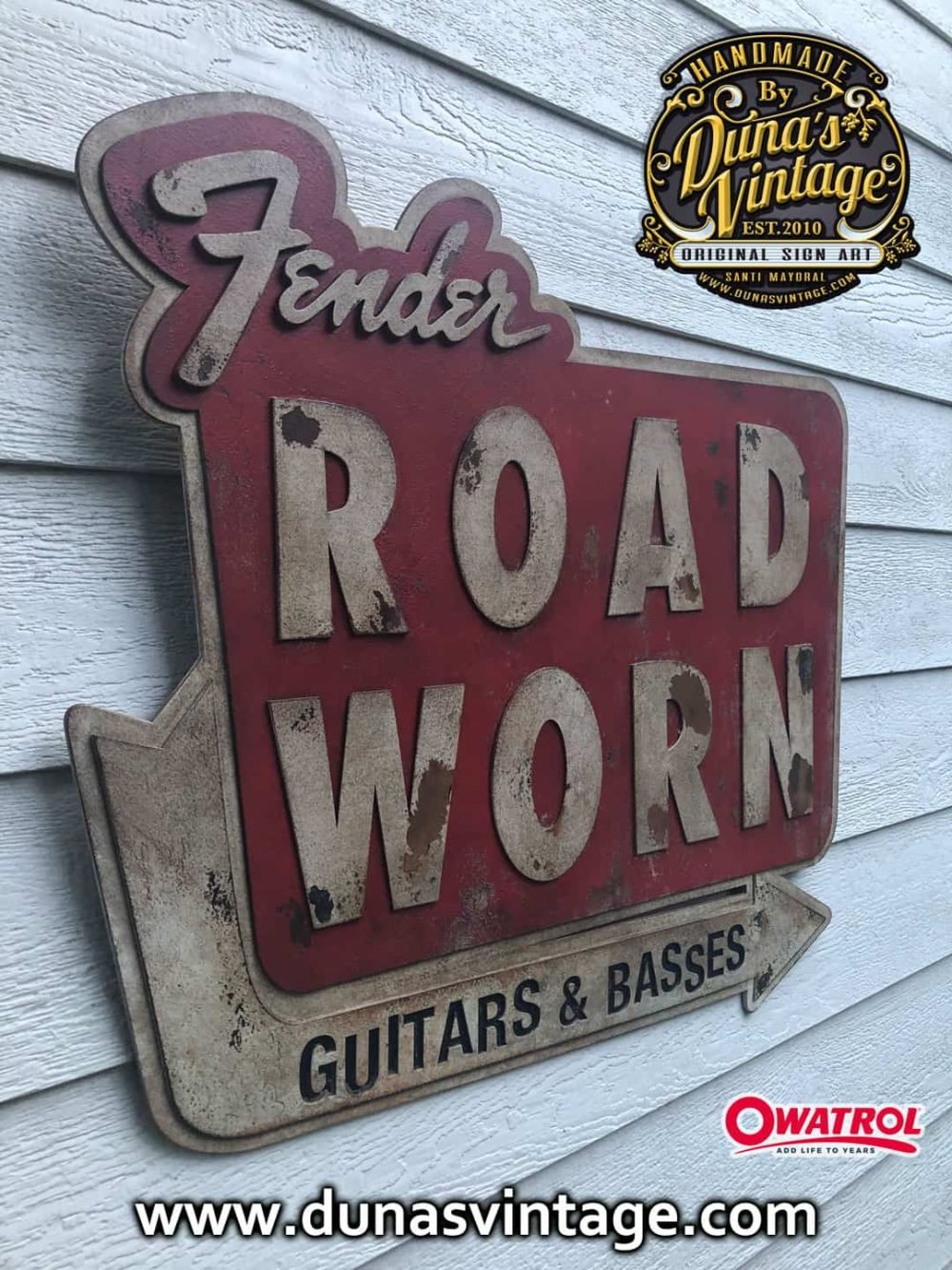 Cartel de Madera en DM tamaño 950x78mm, este cartel de Fender Road Worn se a trabajado en tres alturas de relieve y dándole es aspecto de oxidado de Owatrol y envejecido en la madera.