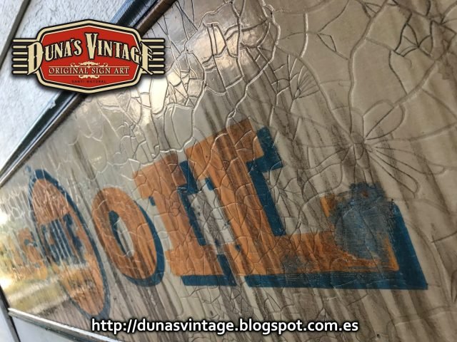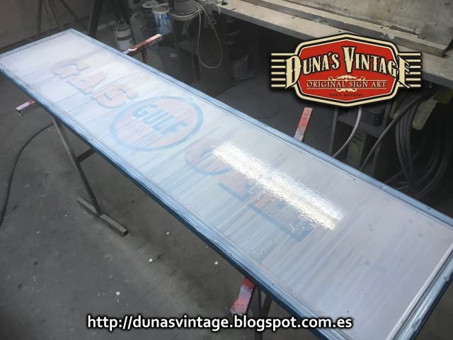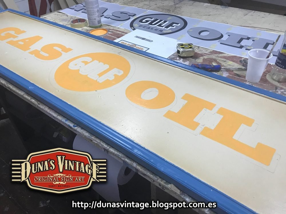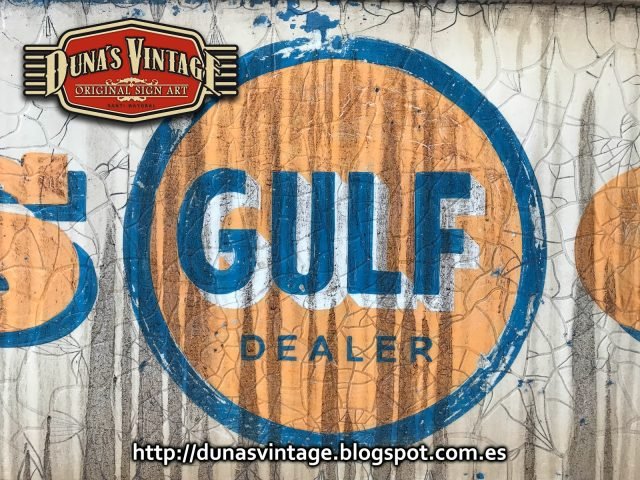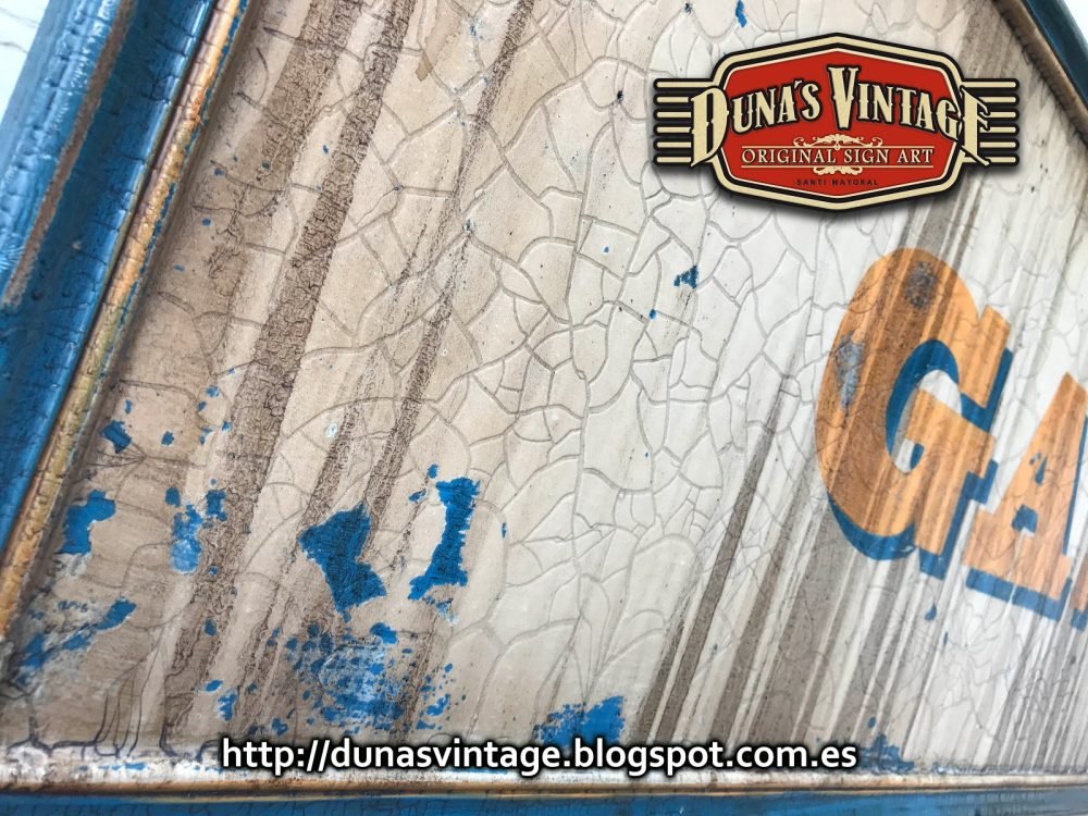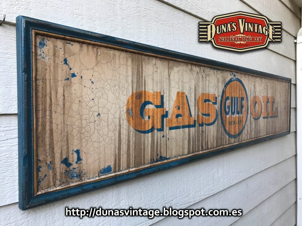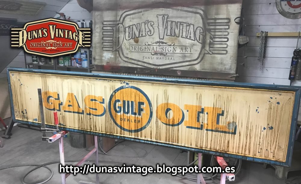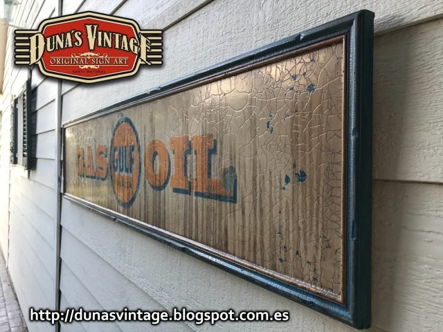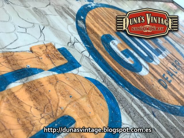 Replica cartel de madera de los años 50´ de la marca Gulf, tamaño 1900x450mm, en este cartel se a trabajado con otro tipo de técnica para conseguir un acaba mas autentico