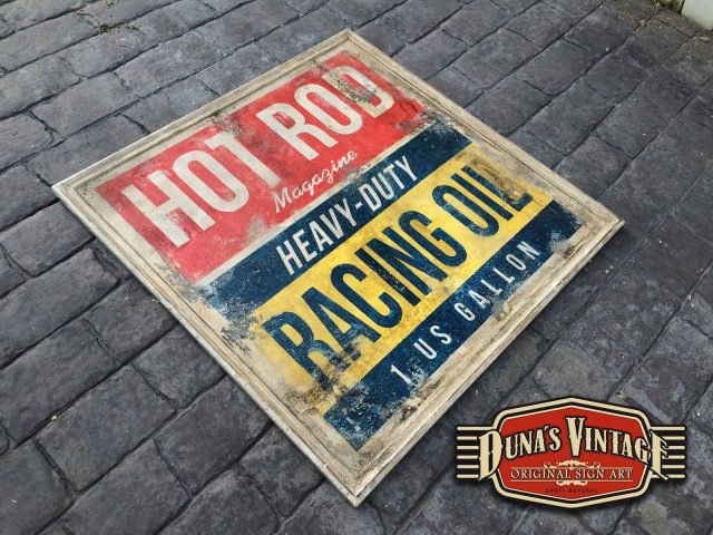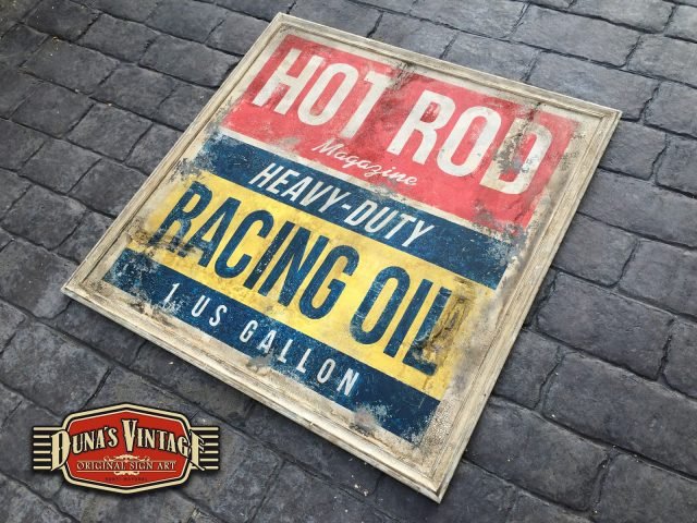 Encargo para Madrid, Cartel HOT ROD RACING OIL Heavy-Duty tamaño 850x850mm, este cartel esta tratado con el efecto Retro Vintage que Duna´s Vintage emplea en sus carteles. Para conseguir el efecto desgastado se han empleado diferentes capas de pintura y técnicas de envejecido.