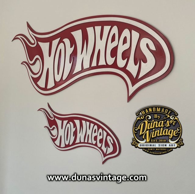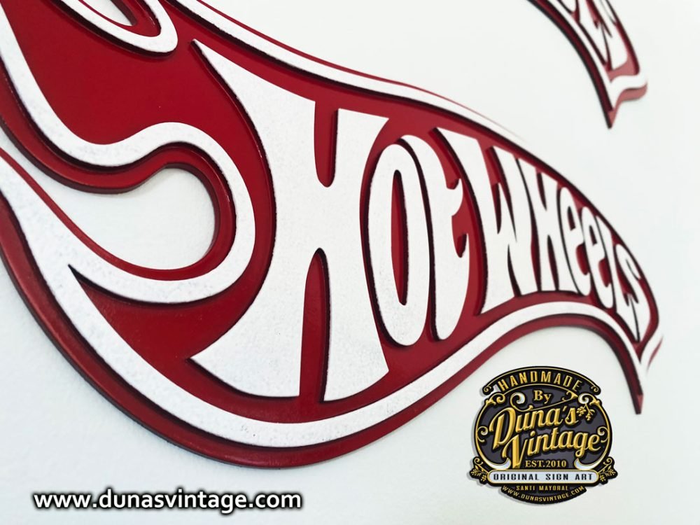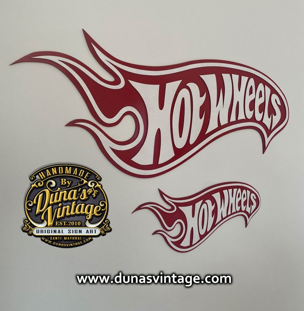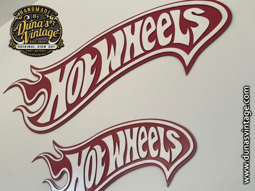 Ya podéis encontrar en la tienda de Duna´s Vintage el cartel de Hot Wheels en relieve y dos tamaños diferentes, se puede fabricar en el tamaño que se quiera. Hay el tamaño más pequeño de 50x20cm que sale por 100€ y el tamaño grande de 95x38cm fabricado en madera DM cortado a láser y pintado a mano, también hay la opción con efecto vintage, más información a dunasvintage@gmail.com