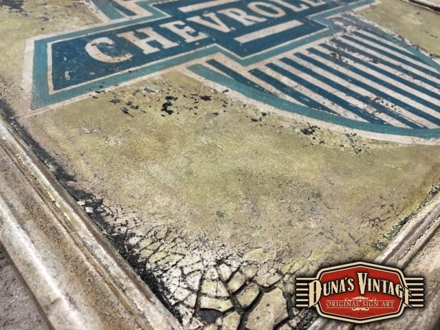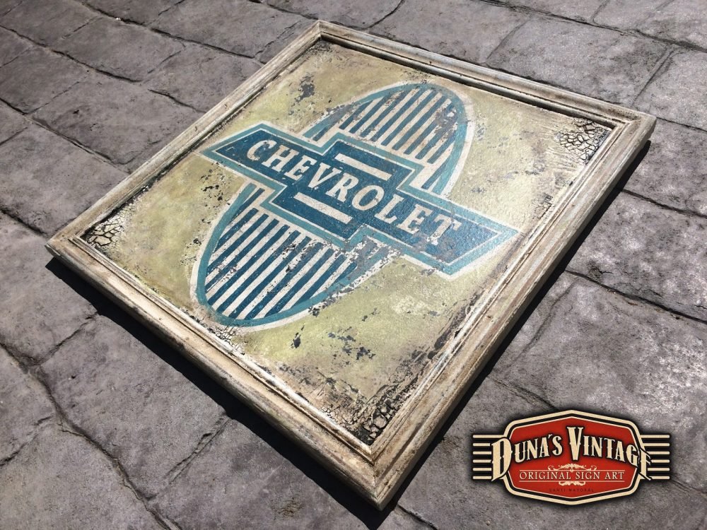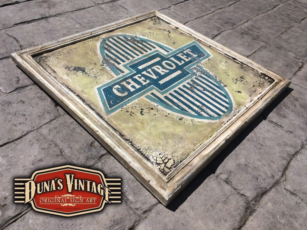 Cartel con el logotipo de Chevrolet del año 1913 tamaño 500x500mm esta trabajado con las técnicas que Duna´s Vintage emplea en sus carteles.
