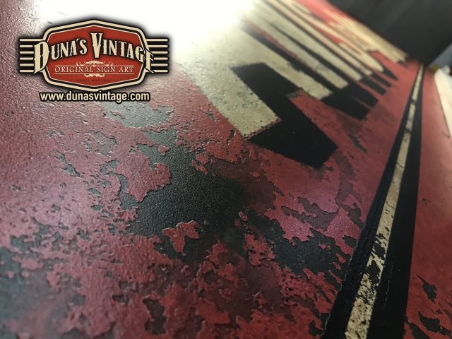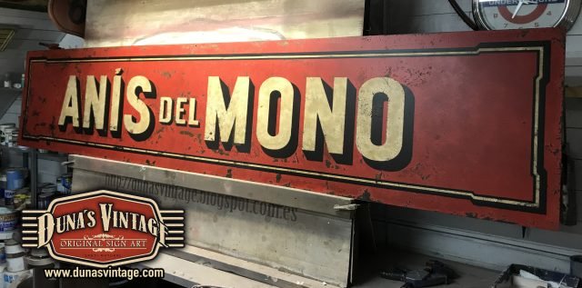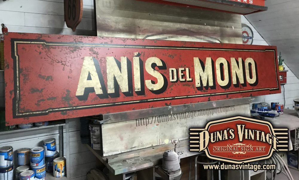 Cartel Metálico de la marca ANIS DEL MONO tamaño 3000x600mm en chapa de 1,8mm y con efecto envejecido para darle la apariencia de chapa antigua de la época.