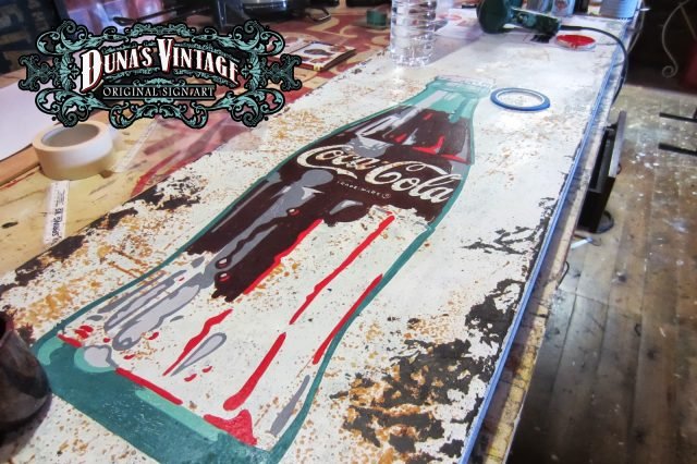 «Coca Cola Better With Coke» tamaño 1500x460mm. Este cartel es una nueva Línea de Duna´s Vintage METAL SIGNS, en este cartel se a trabajado la con plancha de hierro de 2mm de grueso y plegada a 4 bandas, el aspecto que se a querido conseguir es el de un cartel oxidado por el paso de los años. En la fotos podréis apreciar los diferentes procesos que hay que hacer para llegar a conseguir el efecto deseado.