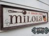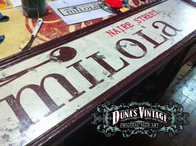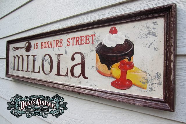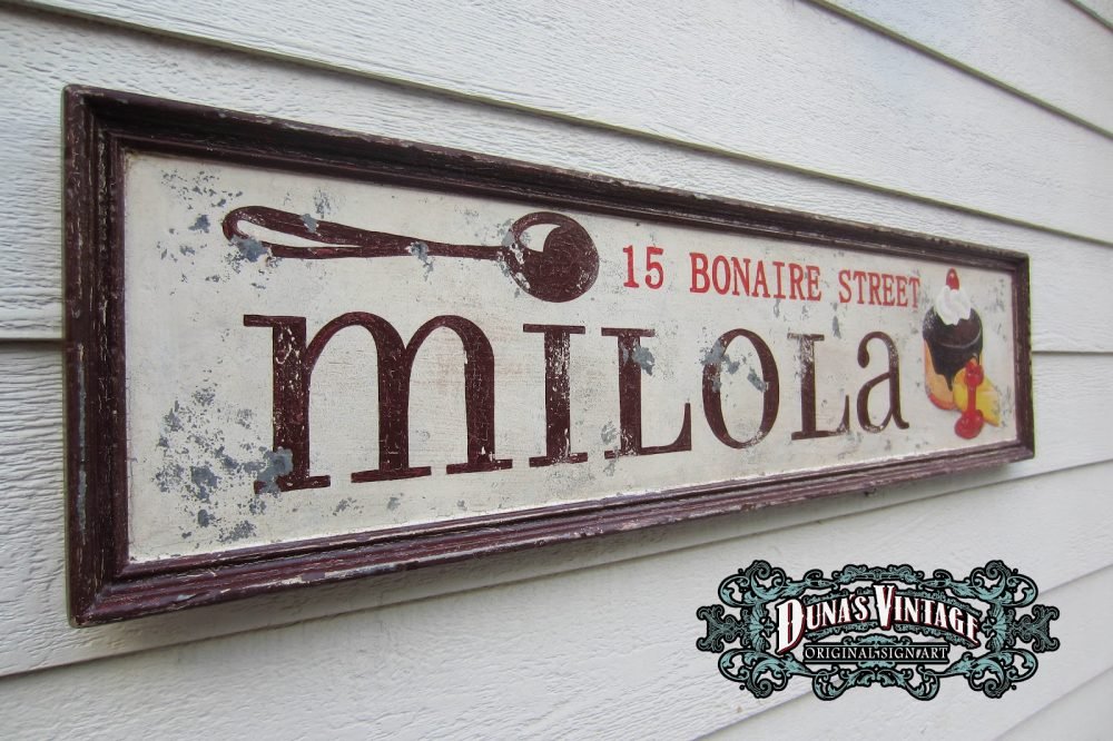 Cartel «MILOLA.» tamaño 1220x230mm. Este cartel esta tratado con el efecto Retro que Duna´s Vintage emplea en sus carteles.