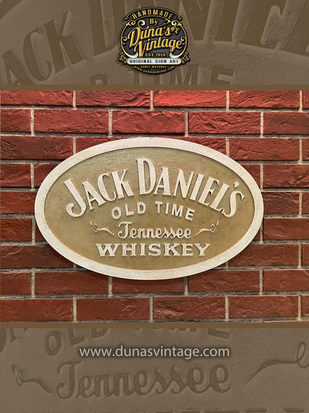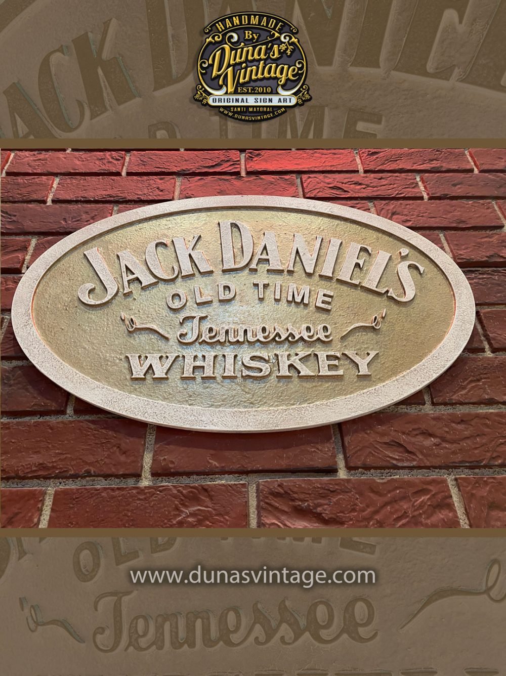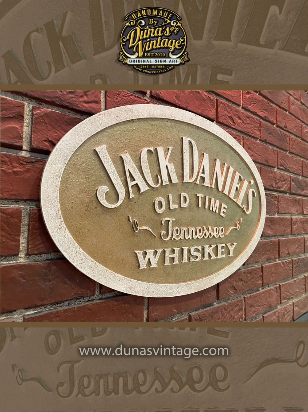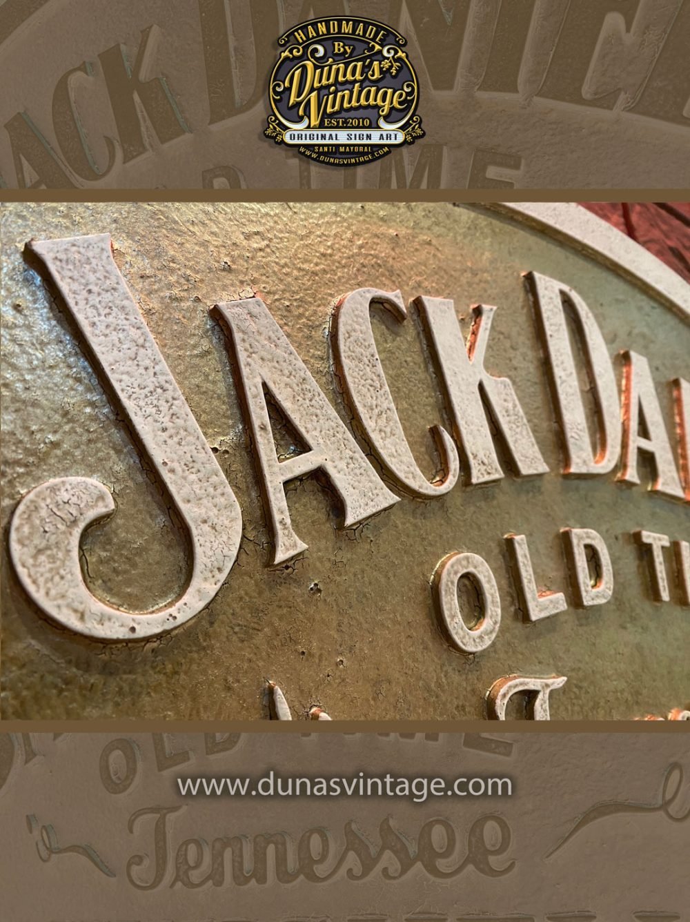 Una pieza única trabajada en madera, inspirada en las clásicas placas metálicas de la mítica marca Jack Daniel’s de Tennessee.Este cartel combina diseño vintage con un cuidadoso trabajo artesanal en relieve, acabado con un efecto envejecido que realza su autenticidad y carácter.Medidas: 59 x 37 cm Disponible en la tienda de Duna’s Vintage: https://dunasvintage.com/stock-carteles/Ideal para amantes del whiskey, decoración de bares, espacios temáticos o coleccionistas de carteles con historia.