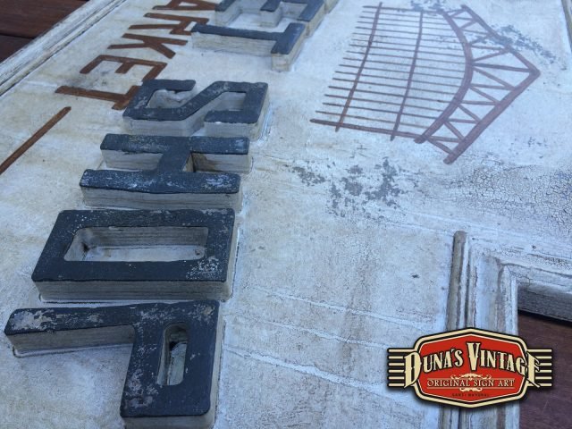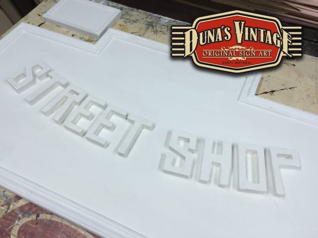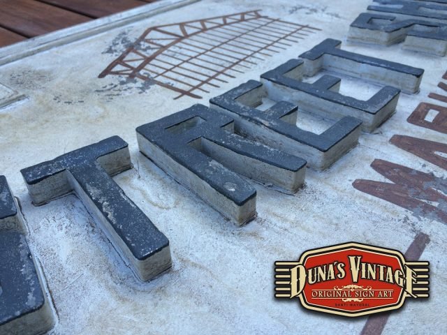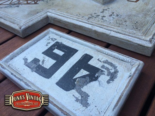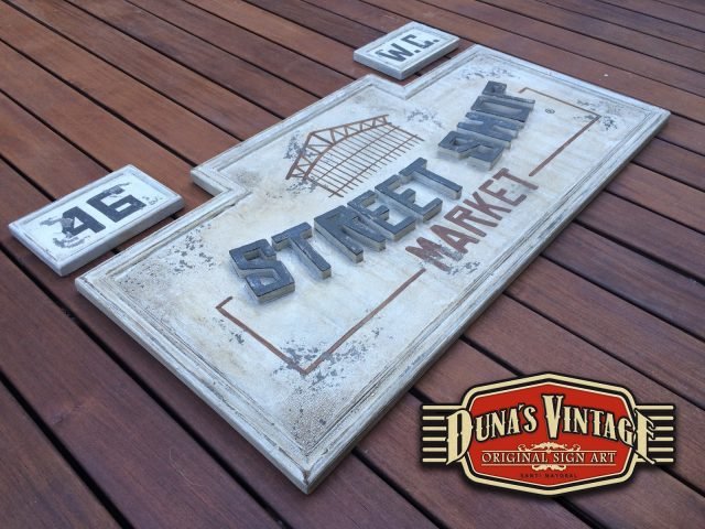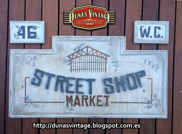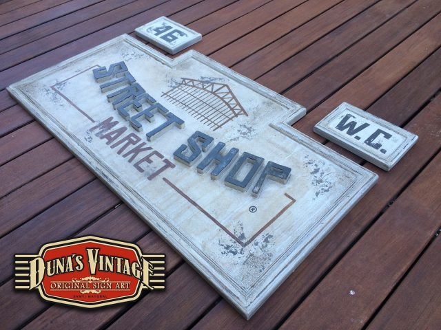 Carteles en madera para STREET SHOP MARKET, Tamaño 500x1000mm acompañado de un cartel para el numero y otro para el W.C. de 150x100mm, El cartel grande esta trabajado con letras en relieve de 18mm de grosor y con el efecto que Duna´s Vintage emplea en sus carteles.