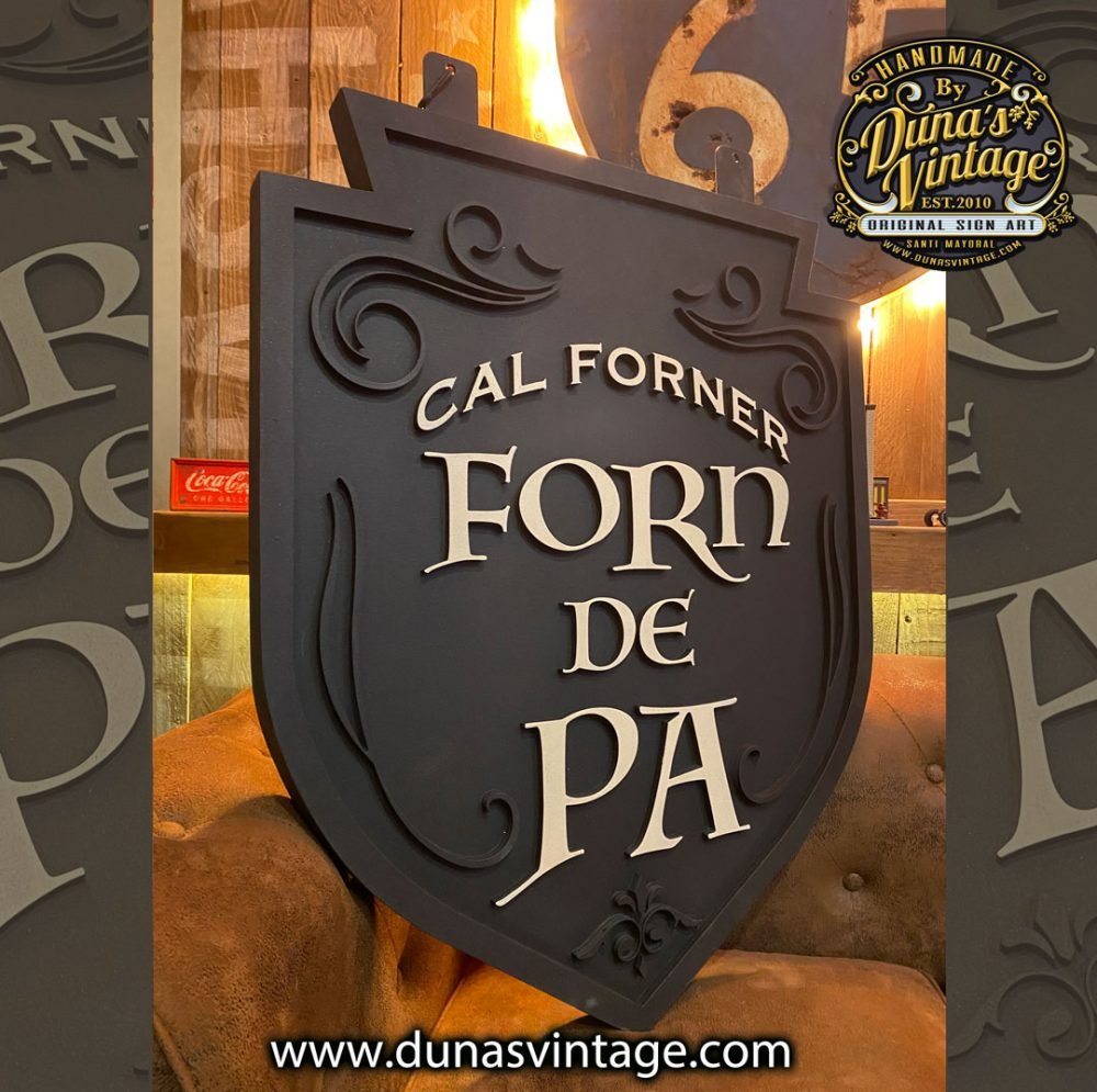 Este cartel tipo banderola este trabajado en PVC de alta densidad con relieve a dos caras y pintado a mano, para darle un toque mas auténtico el cliente compro el soporte de hierro forjado el tamaño del escudo es de 80x65mm el resultado a quedado muy bien siendo un cartel en PVC.