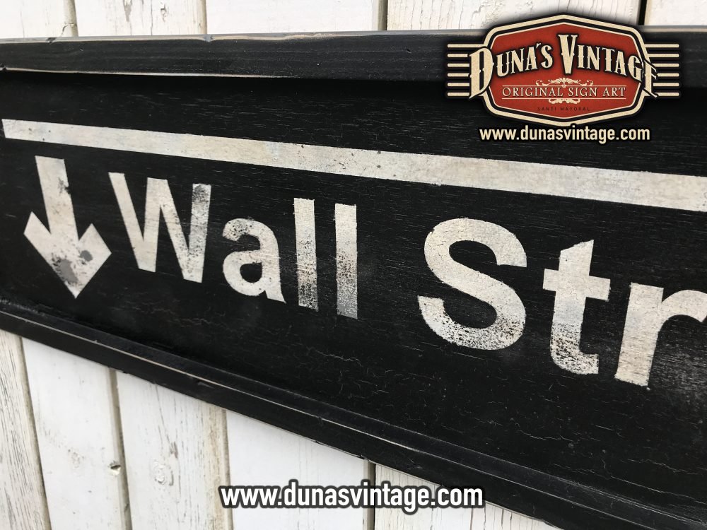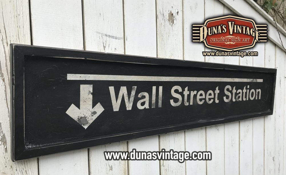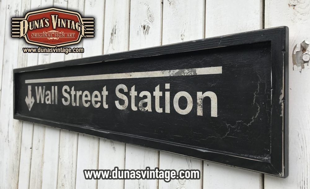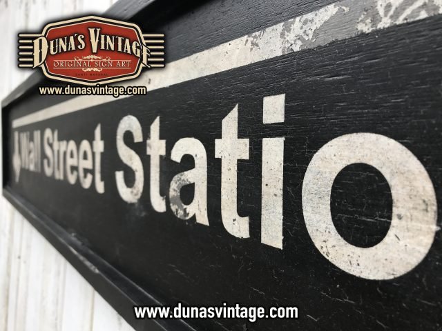 Cartel de madera de 15mm pintado a mano con efecto envejecido para darle la apariencia de viejo y desgastado por el tiempo Ref. Wall Street Station tamaño 1500x300mm.