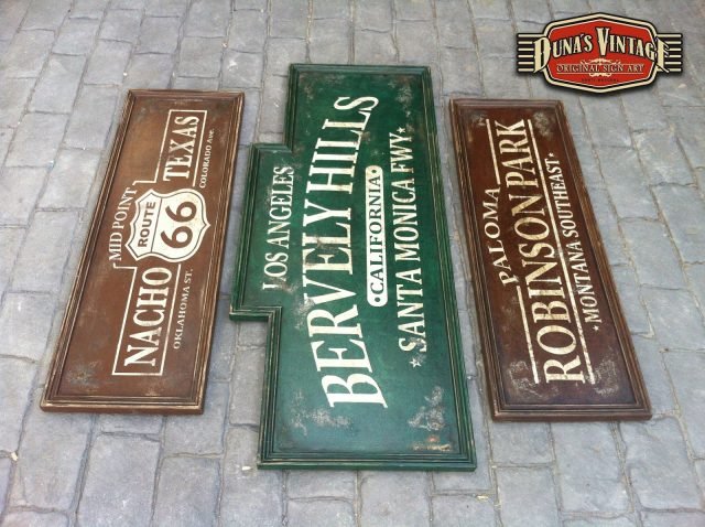 Conjunto Carteles Bervely Hills, Tamaño 1220x500mm. Route 66, tamaño 950x320mm, Robinson Park, Tamaño 950x320mm, este trabajo es para Pilar de Cantabria. Estos carteles estan tratados con el efecto Retro que Duna´s Vintage emplea en sus carteles.