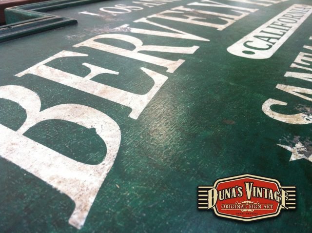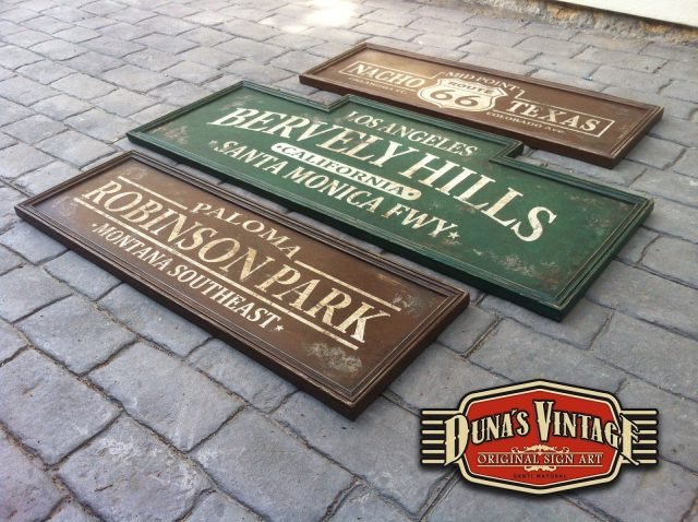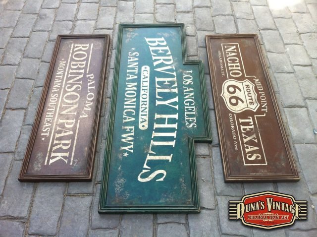 Conjunto Carteles Bervely Hills, Tamaño 1220x500mm. Route 66, tamaño 950x320mm, Robinson Park, Tamaño 950x320mm, este trabajo es para Pilar de Cantabria. Estos carteles estan tratados con el efecto Retro que Duna´s Vintage emplea en sus carteles.