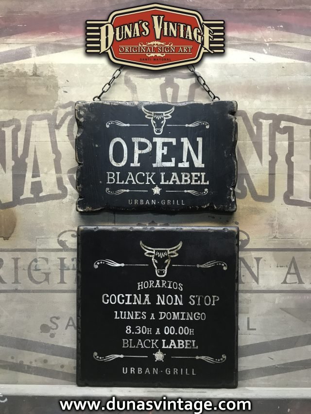 Carteles de Madera para Black Label, Open y Closed Tamaño 300x200mm y cartel Horarios 300x300mm.