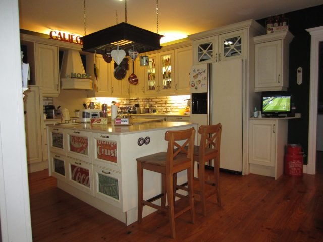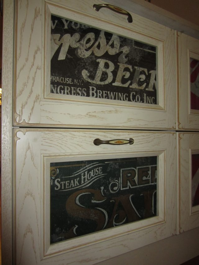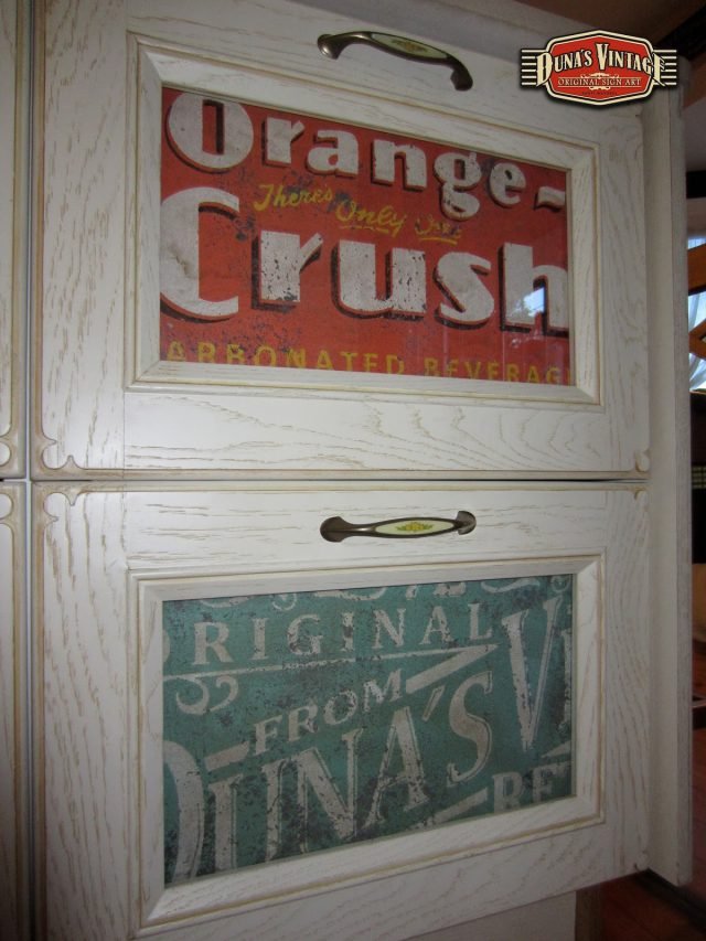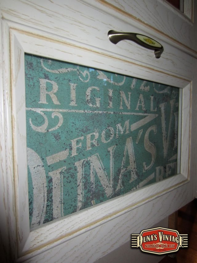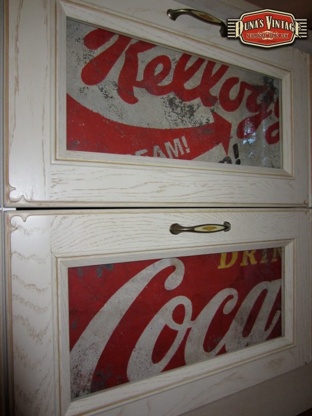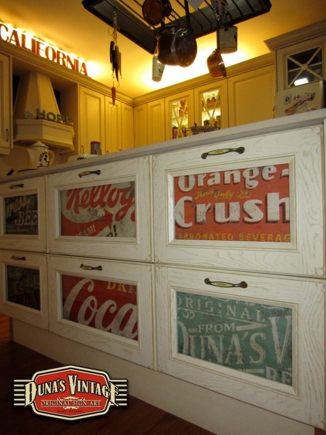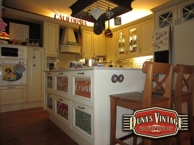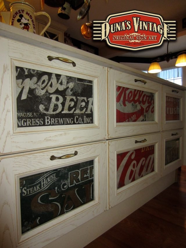 Duna´s vintage os presenta otra aplicación que le podemos dar a los carteles, en estas fotos podemos apreciar la isla de una cocina con seis cajones con cristal, los cuatro cajones de los extremos son de 400x300mm y los centrales de 500x300mm.