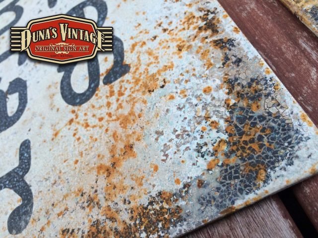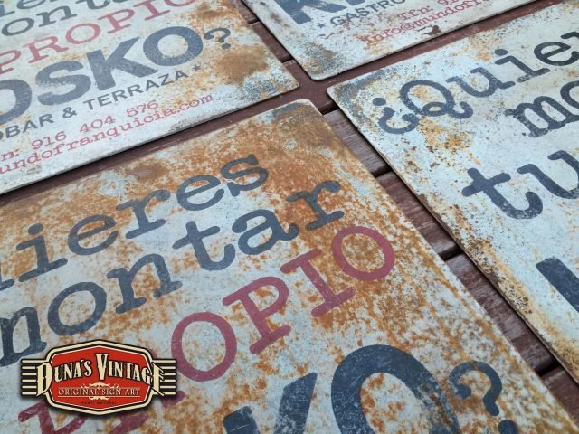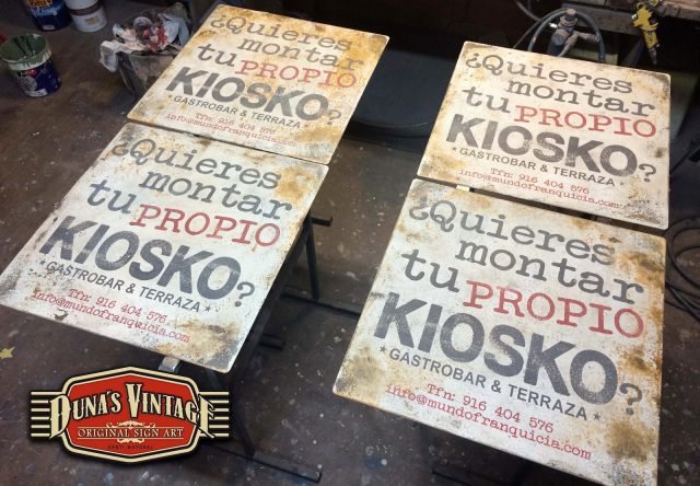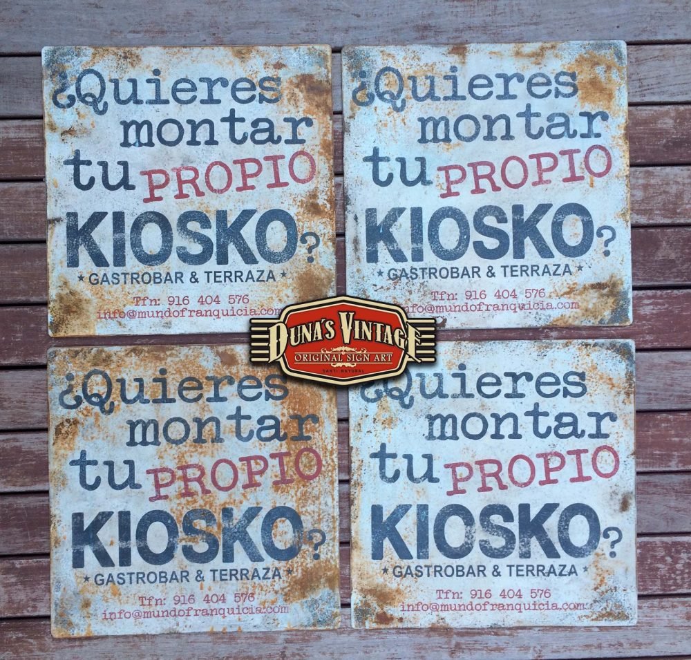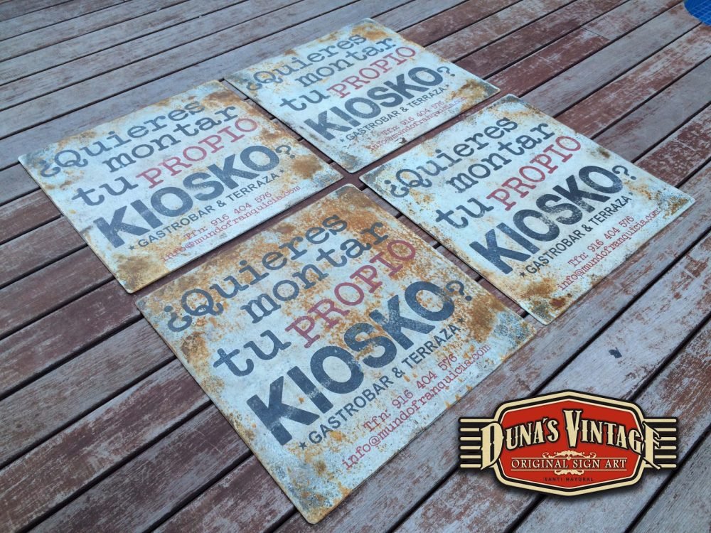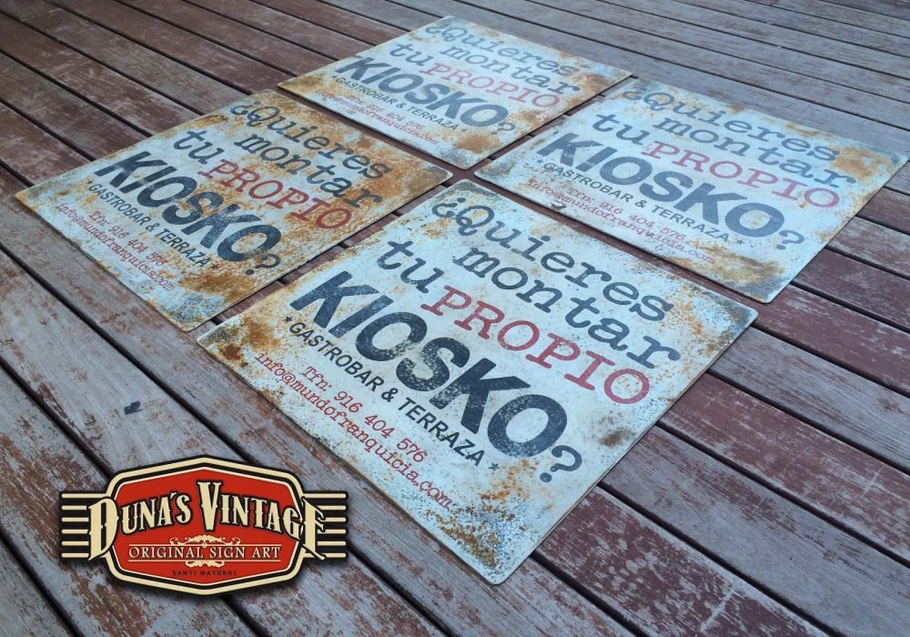 Carteles en Chapa de 2mm para EL KIOSKO Gastrobar & Terraza de las Rozas Madrid, tamaño 500x500mm estos carteles se han trabajado con el efecto oxido que Duna´s Vintage emplea en sus carteles.