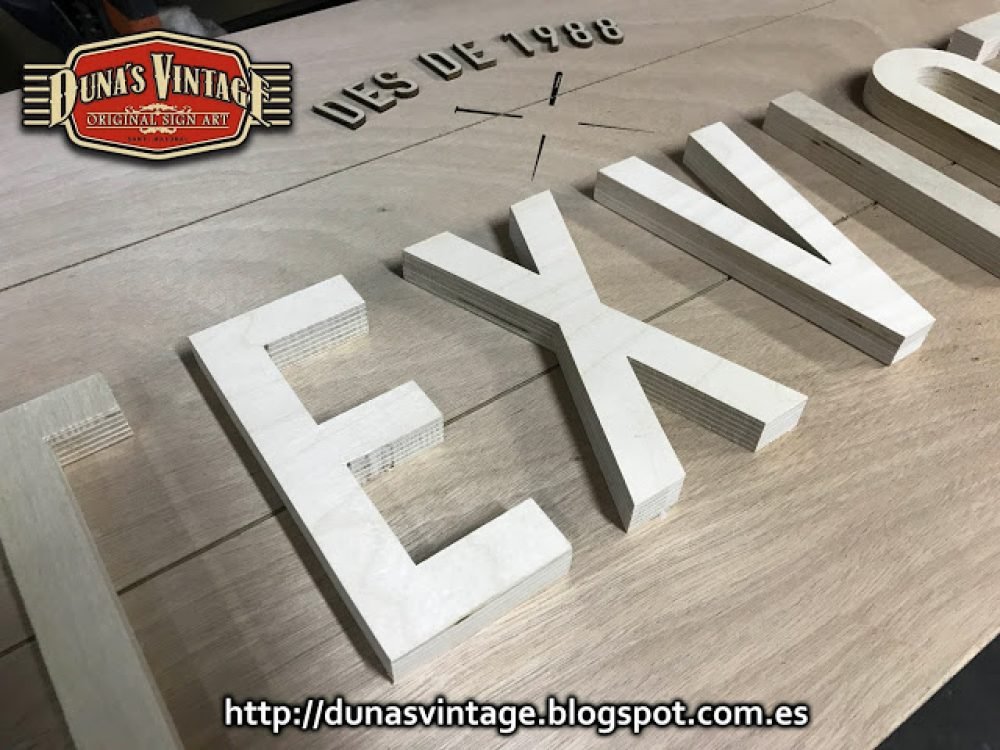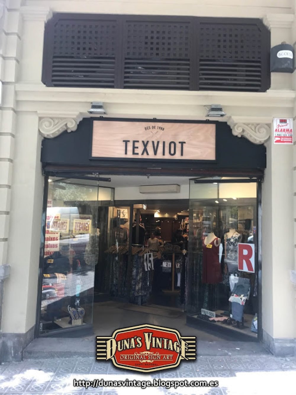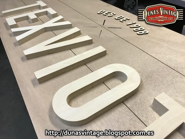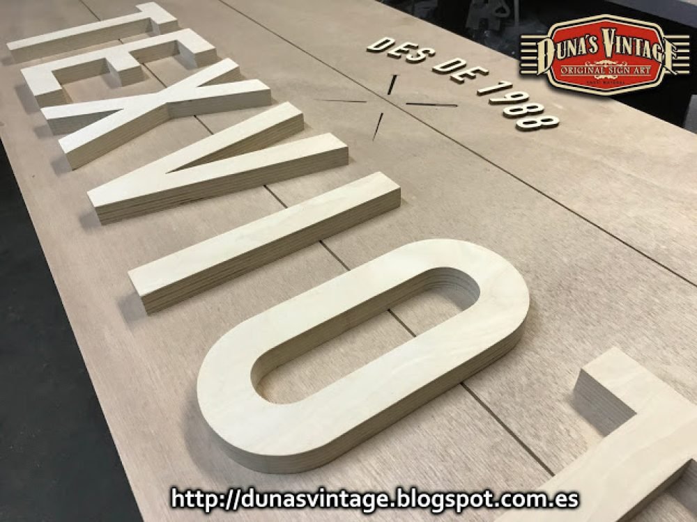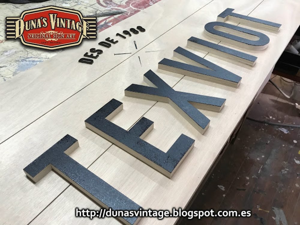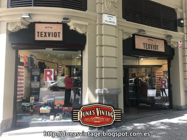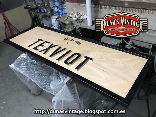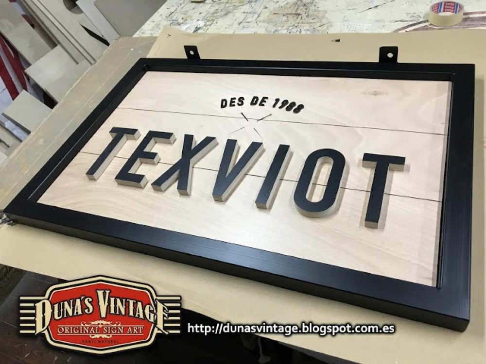 Carteles para la tienda TEXVIOT de Barcelona, Tamaño 1800x600mm y 900x600mm, estos carteles están trabajados con madera y estructura metálica de 40mm, el marco pintado en negro satinado y la base del cartel esta trabajado y las letras en madera de 18mm especial para exterior, se le han dado 4 capas de barniz transparente para su protección.