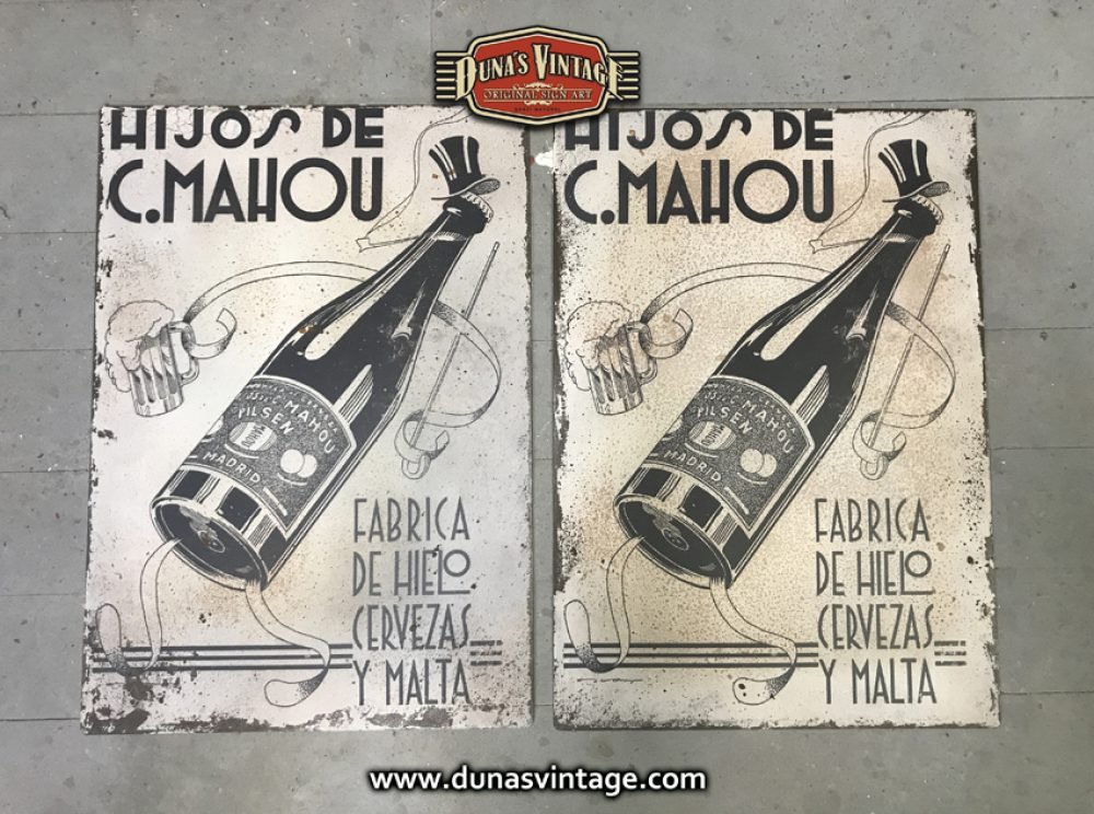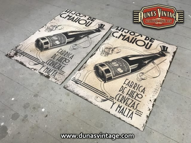 Chapas Metálicas de 2mm de espesor, estas chapas para Mahou Cervezas son imágenes Vintage, en este caso es impresión digital pero dando a cada chapa un aspecto envejecido de oxido para darle un aire viejo y desgastado, con este efecto logramos que la imagen antigua con el acabado oxidado parezca una chapa rescatada de hace muchos años, el tamaño de las chapas es de 42x50cm.