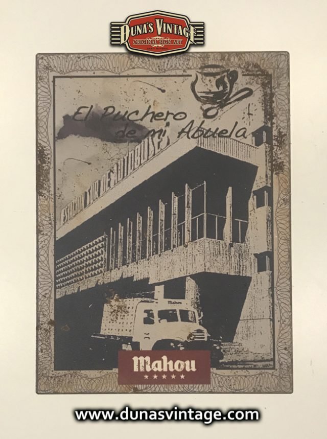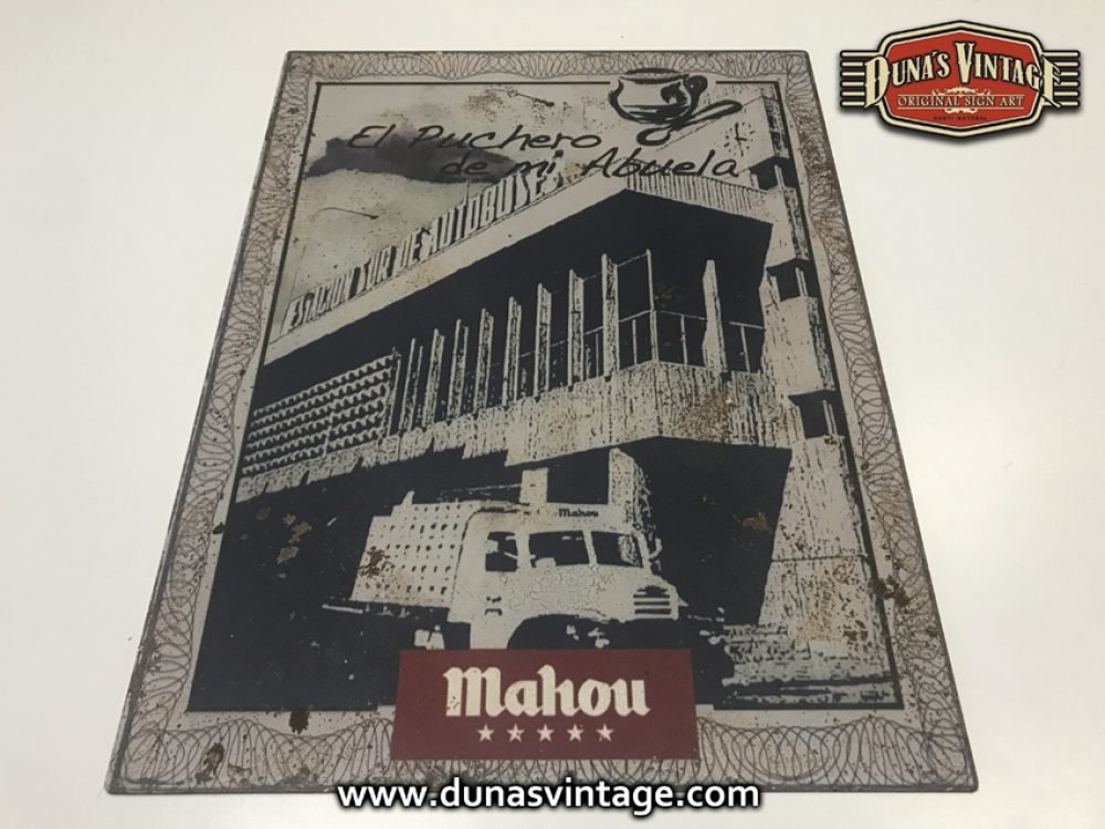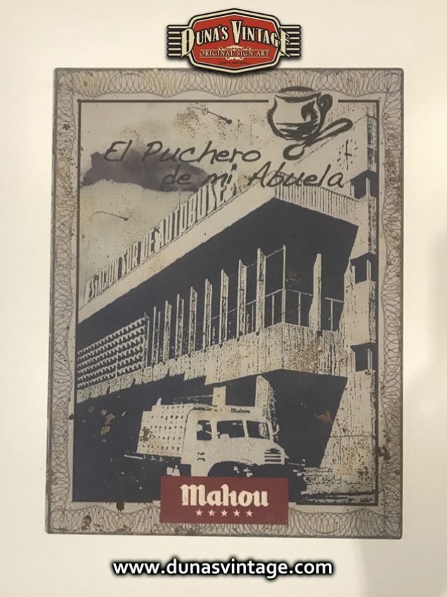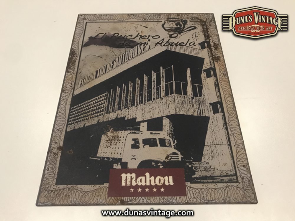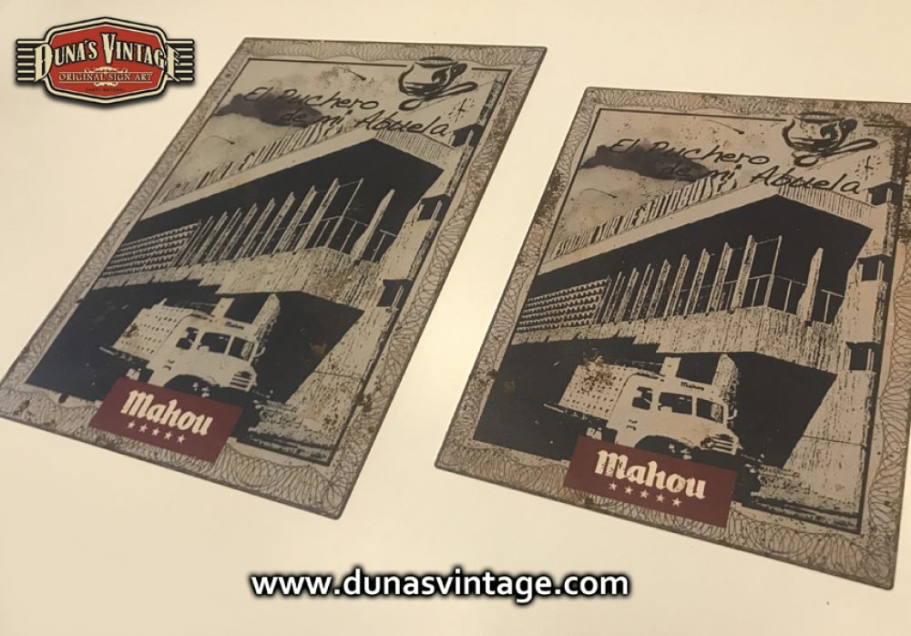 Chapas Mahou el Puchero de mi Abuela, chapas metálicas de 1,8 de espesor tamaño 35x47cm y 45x60cm acabado Vintage con impresión digital sobre chapa.