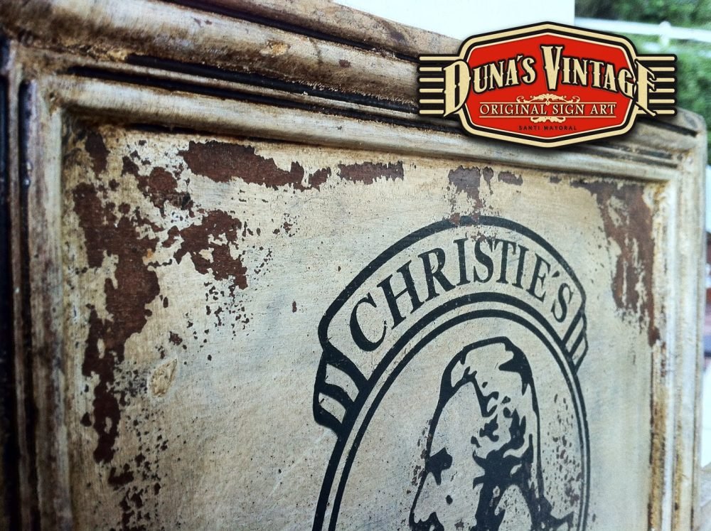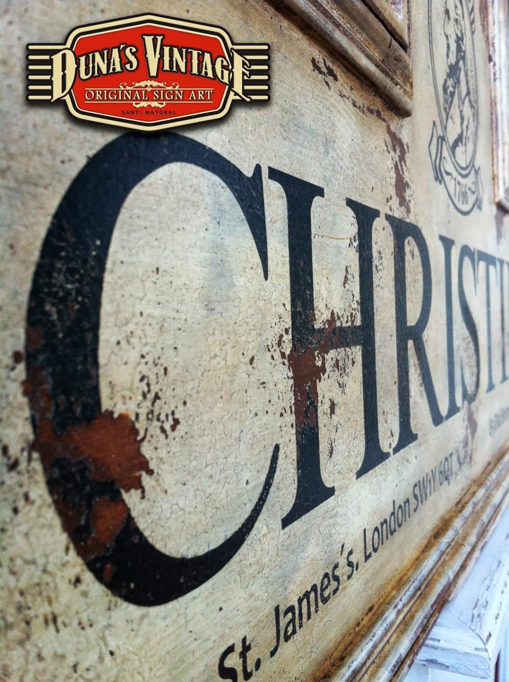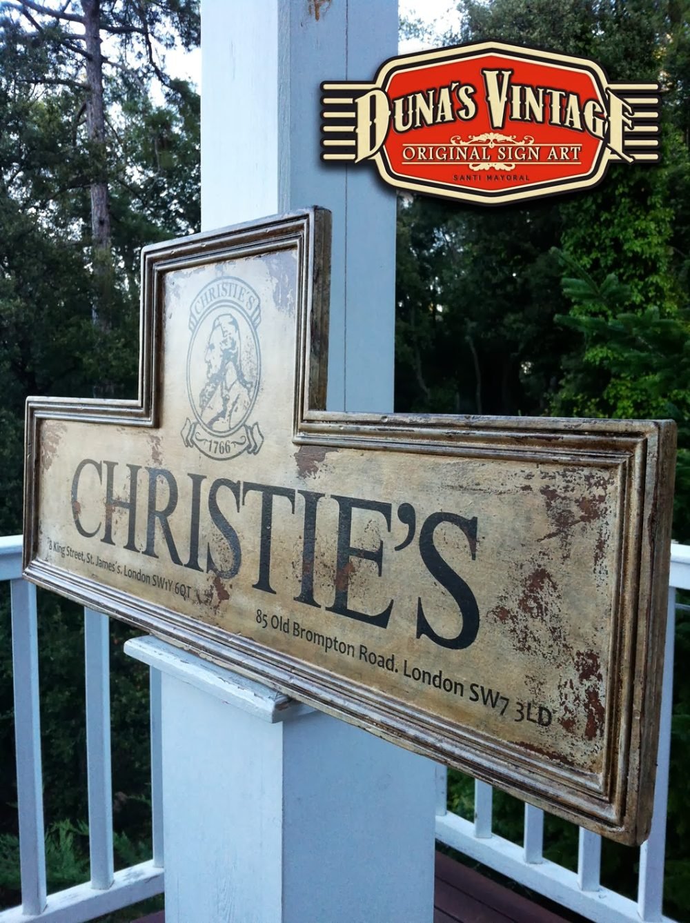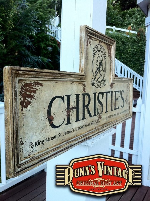 Cartel «CHRISTIE´S».Tamaño 900x400mm. Este cartel es de una casa de subastas muy importante a nivel internacional. Este cartel esta tratado con el efecto Retro que Duna´s Vintage emplea en sus carteles pintados a mano. (Hay algunos carteles que se han vendido pero se pueden hacer otros iguales o personalizados con el texto que se quiera). Duna´s Vintage.