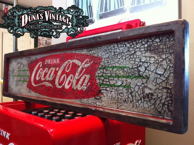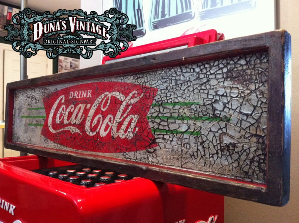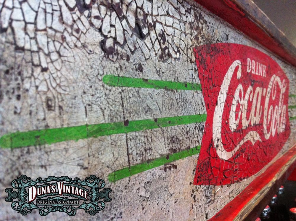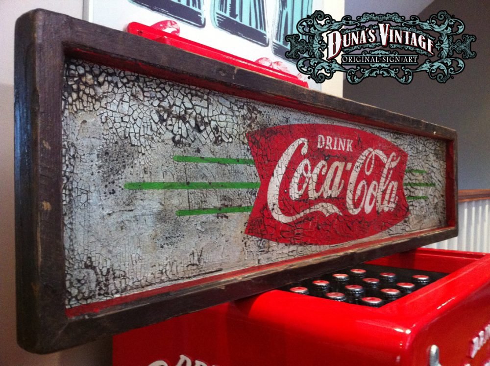 Cartel «Coca Cola Drink» tamaño 900x220mm. Este cartel esta tratado con el efecto Retro que Duna´s Vintage emplea en sus carteles pintados a mano.