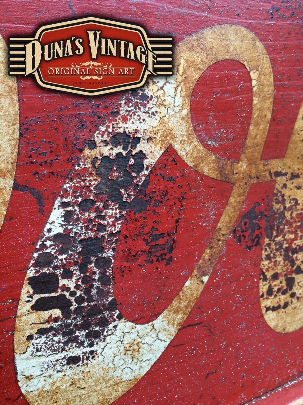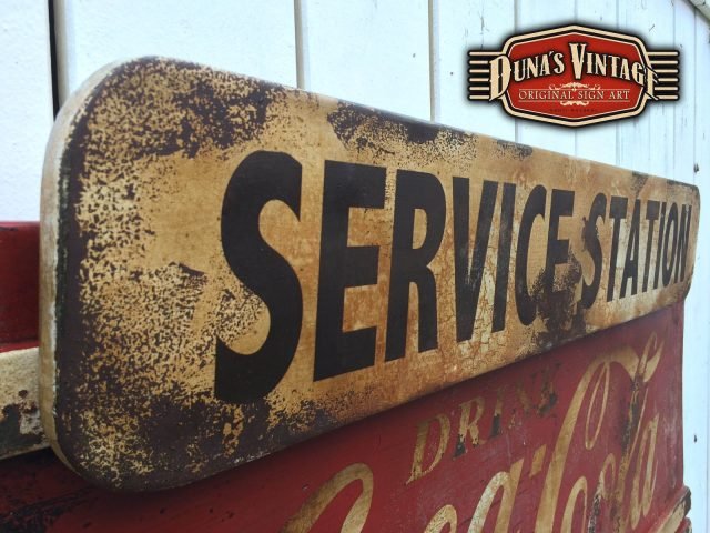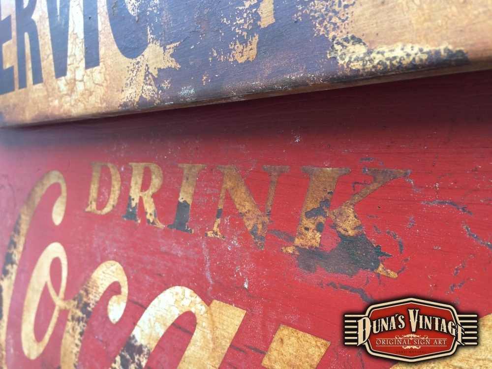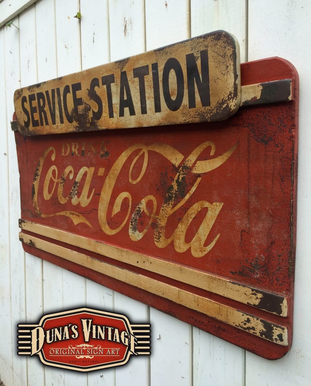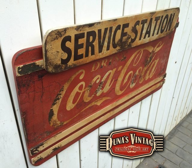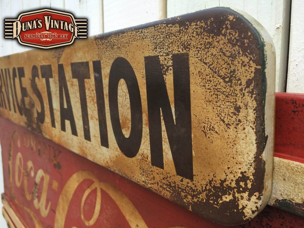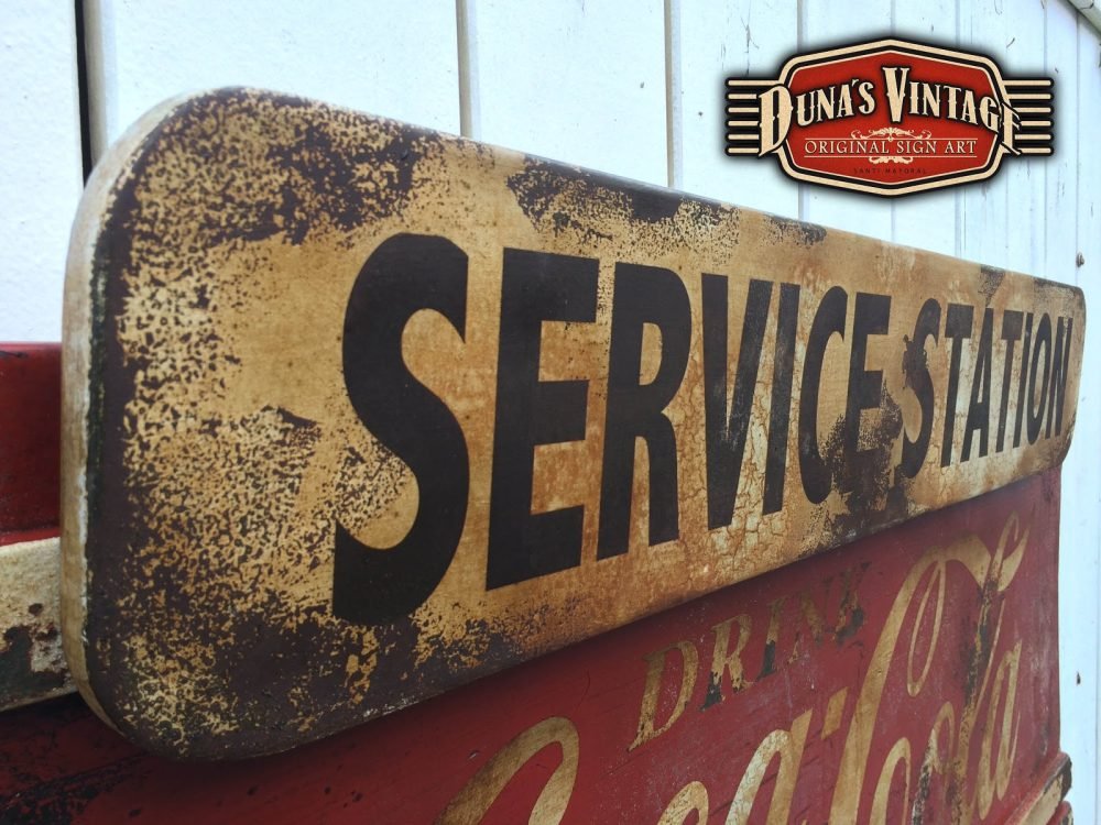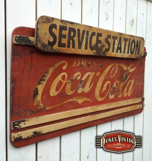 Replica cartel de Coca-Cola Service Station, tamaño 1200x690mm este cartel es el típico cartel que podíamos encontrar en las gasolineras de los años 50´ esta trabajado en madera y con el efecto de oxido para darle una apariencia mas autentica.