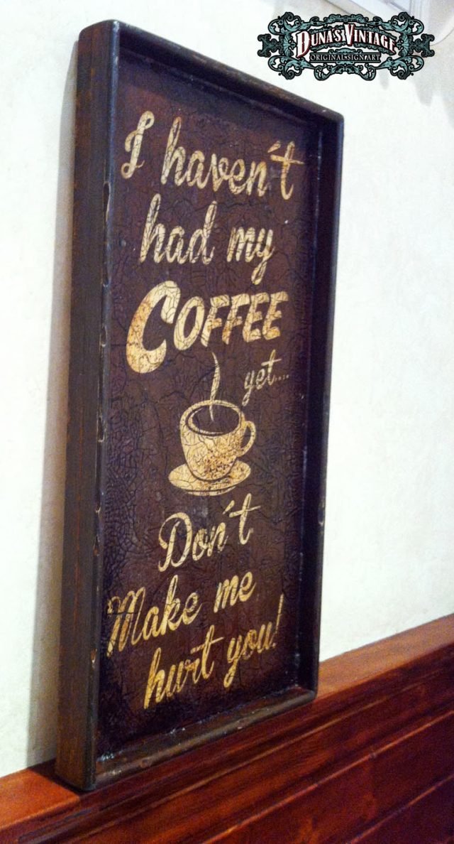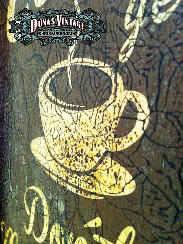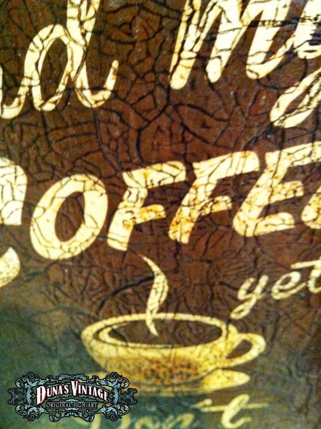 Cartel «Coffee Sign».Tamaño 440x350mm. Este cartel esta tratado con el efecto Retro que Duna´s Vintage emplea en sus carteles pintados a mano. (Hay algunos carteles que se han vendido pero se pueden hacer otros iguales o personalizados con el texto que se quiera). Duna´s Vintage.