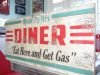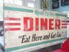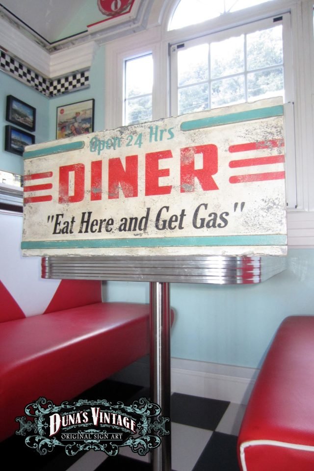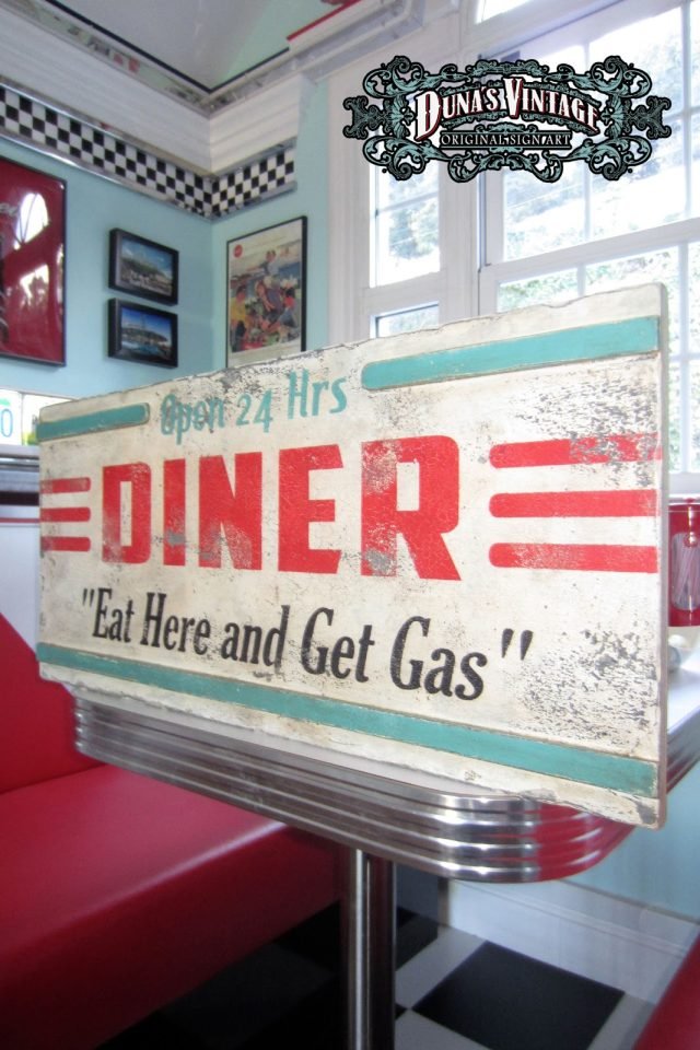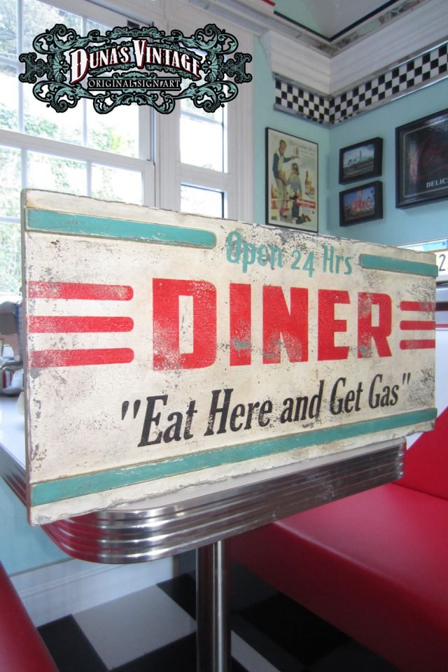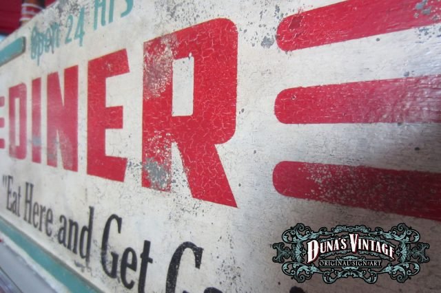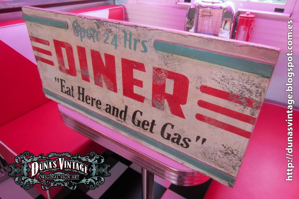 Cartel «DINER 24Hrs» tamaño 700x320mm. Este cartel esta tratado con el efecto Retro que Duna´s Vintage emplea en sus carteles pintados a mano.(Hay algunos carteles que se han vendido pero se pueden hacer otros iguales o personalizados con el texto que se quiera).