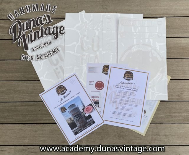 Si estás pensando en comprar un curso completo de Duna´s Vintage Academy, aquí podrás ver que materiales te llegaran a casa con cada curso, como puedes ver viene todo preparado para que puedas crear tus propias obras de arte, desde plantillas, molduras, bombillas etc… Con el curso y el material veras que es muy fácil hacer este tipo de trabajos, Anímate!!!!!