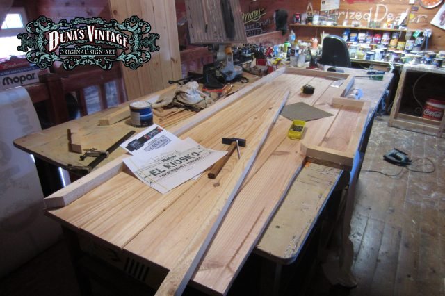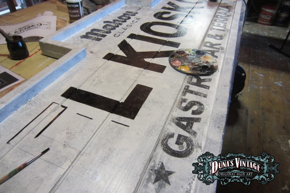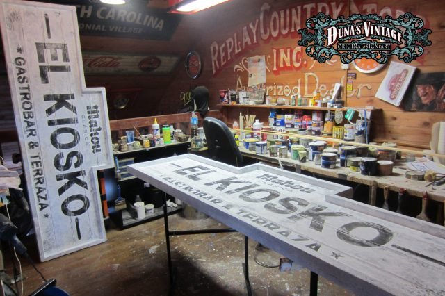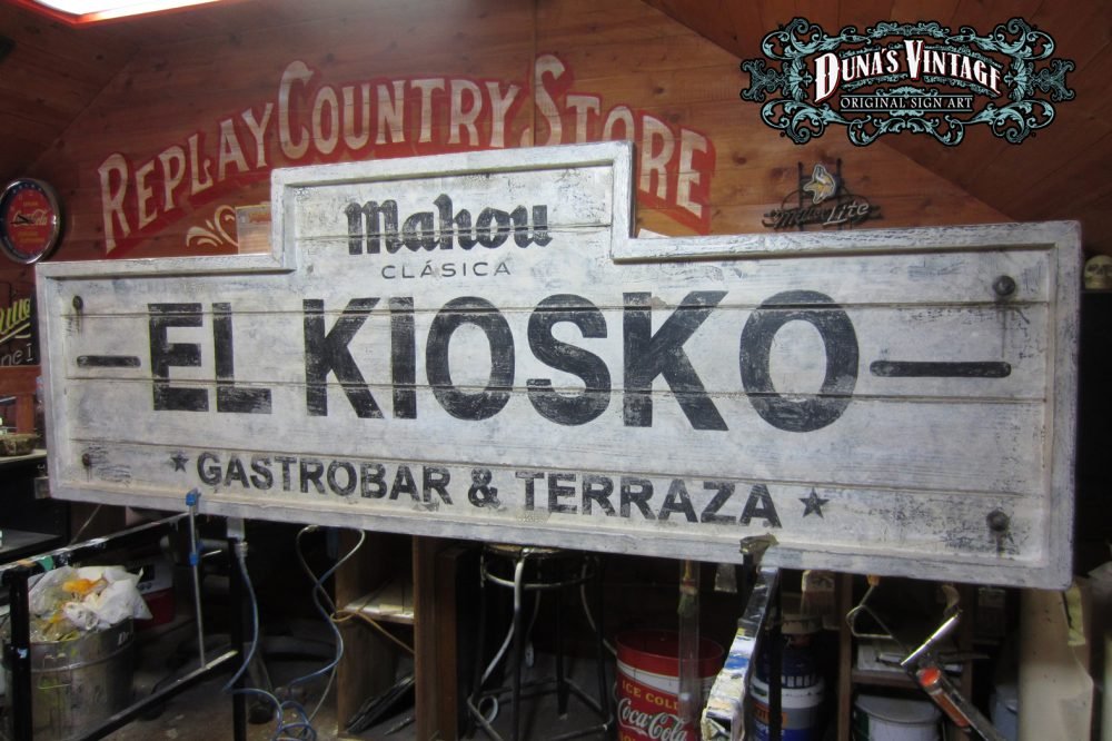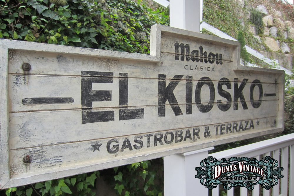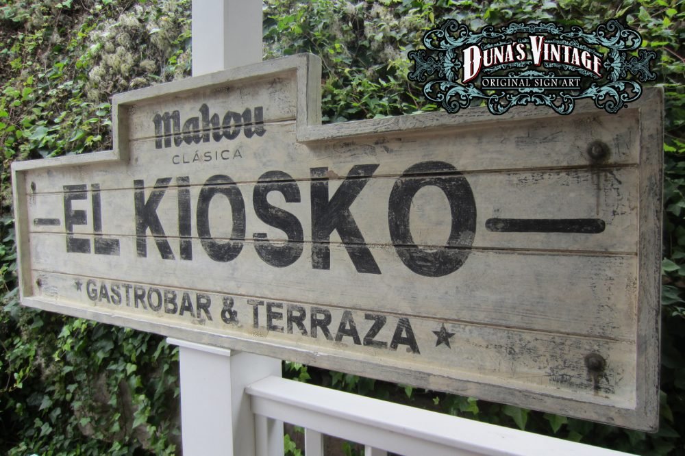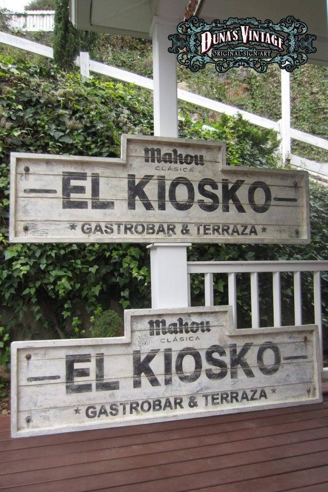 Carteles «EL KIOSKO» tamaño 2000x700mm. Este cartel esta Fabricado en madera de pino de 22mm y tratado con el efecto Retro que Duna´s Vintage emplea en sus carteles pintados a mano.