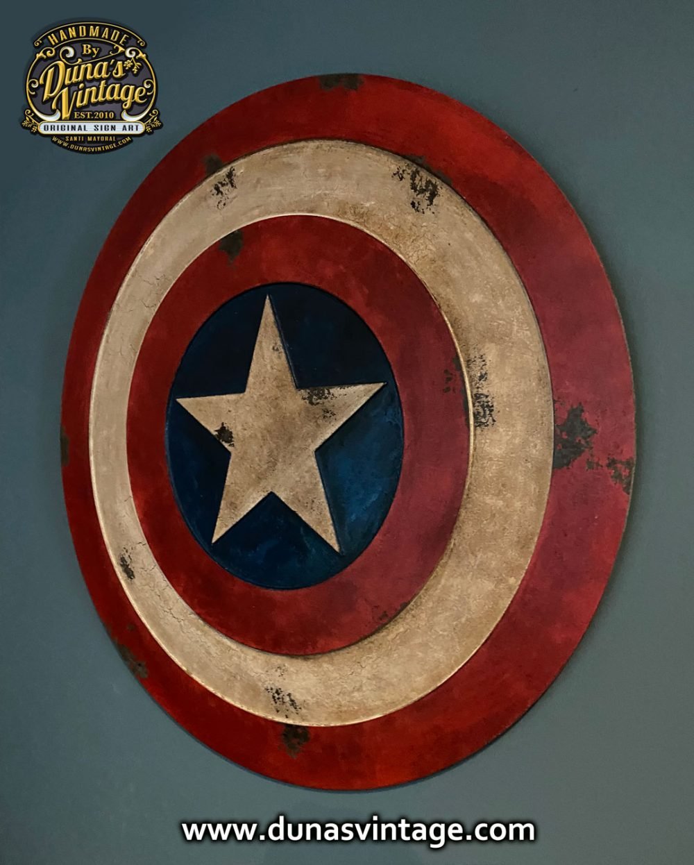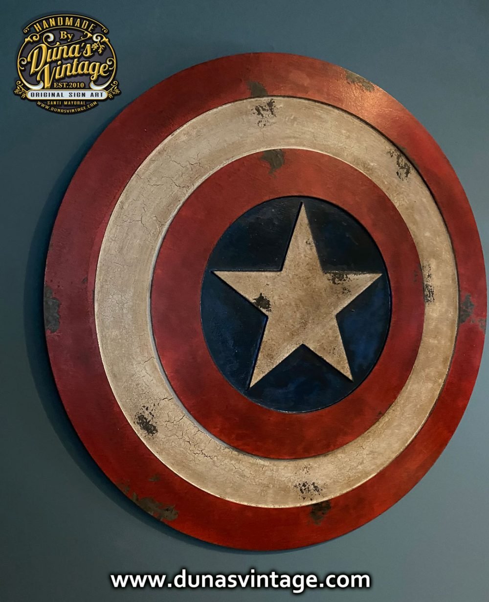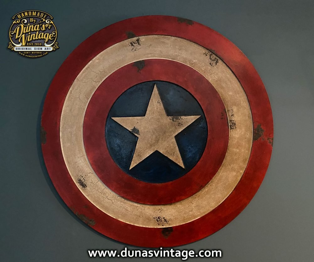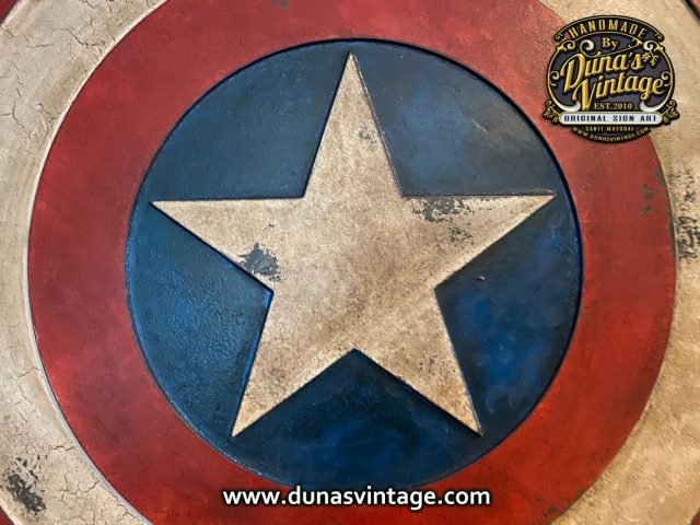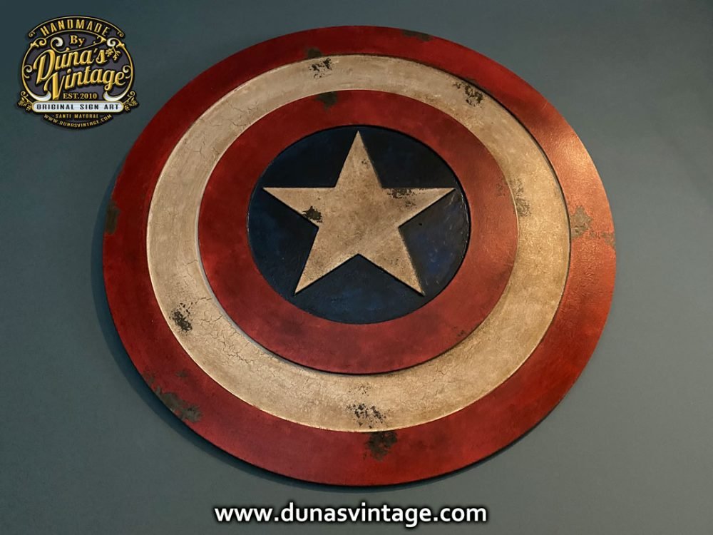 Encargo que se va para Badajoz, Escudo Captain America en relieve y de 65cm de diámetro con acabado vintage.