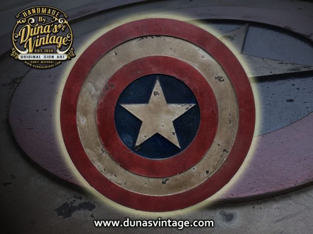 Este escudo fabricado en madera DM y pintado a mano y con acabado envejecido con toques de oxidación, tamaño 65x65cm. Precio 145€.