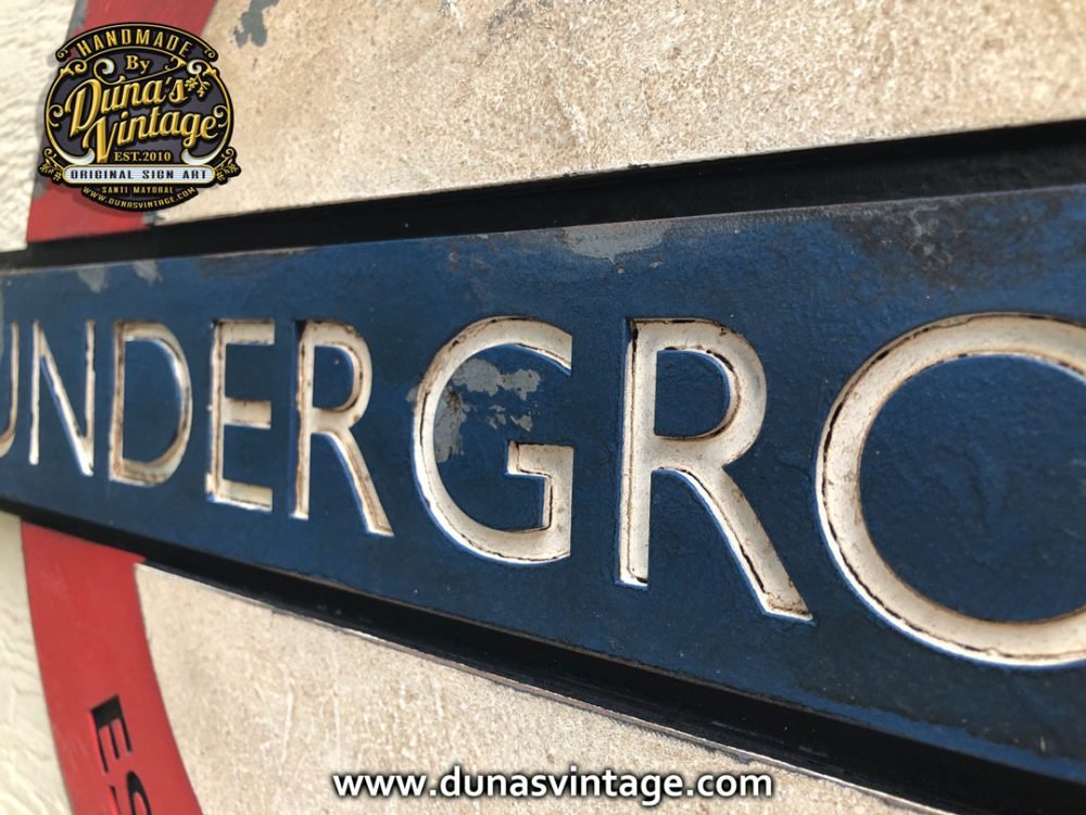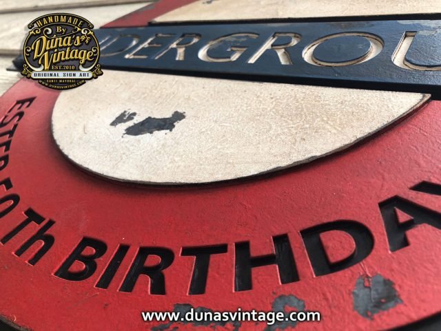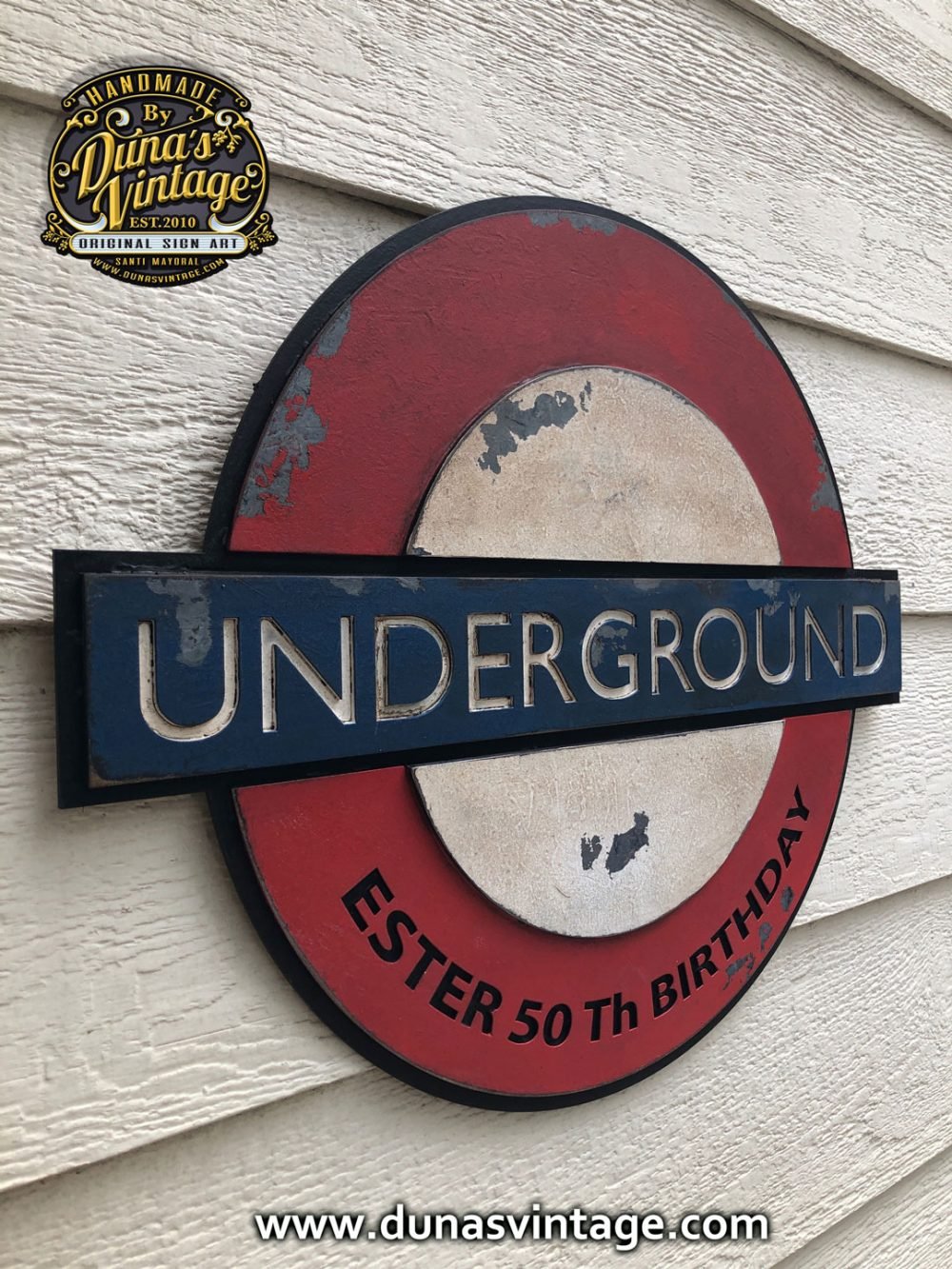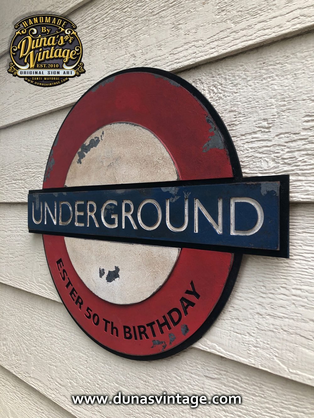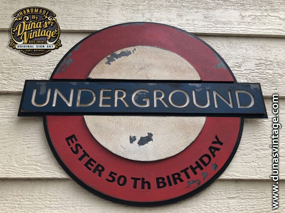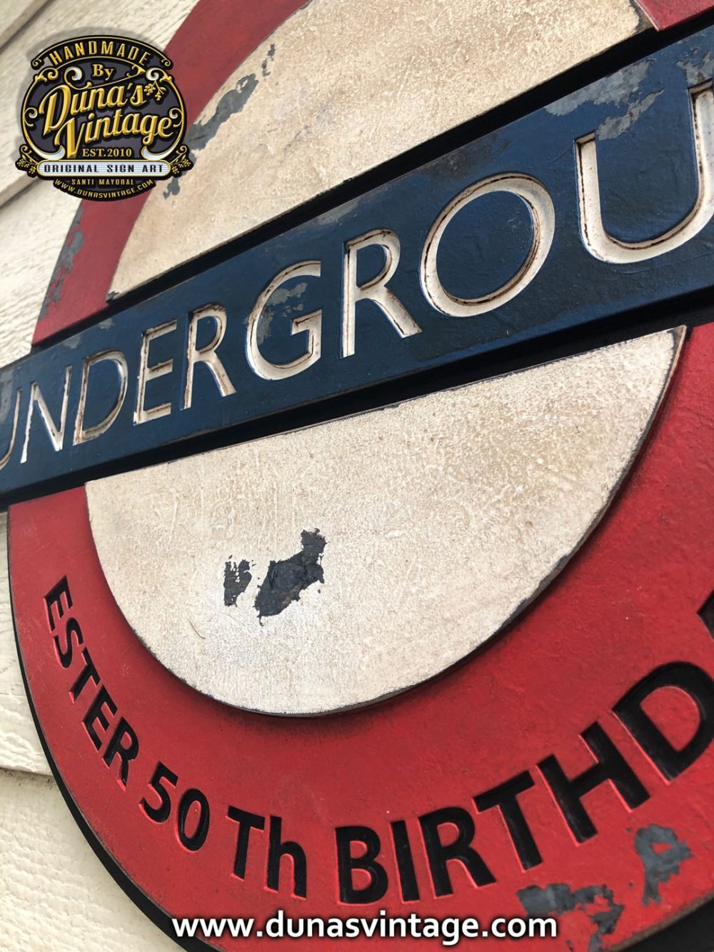 Escudo típico del metro de Londres UNDERGROUND esta vez personalizado para Ester en su 50Th, Cartel en DM cortado a laser en 3 niveles tamaño 575x475mm acabado Vintage.