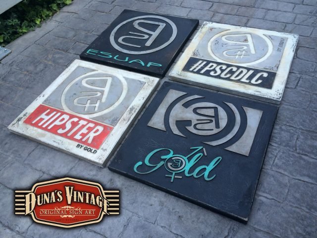 Nuevos carteles para la tienda del centro comercial la Maquinista de Barcelona, el tamaño de cada cartel es de 600x600mm en relieve de 4mm y trabajado con las técnicas que Duna´s Vintage emplea en sus carteles.