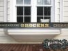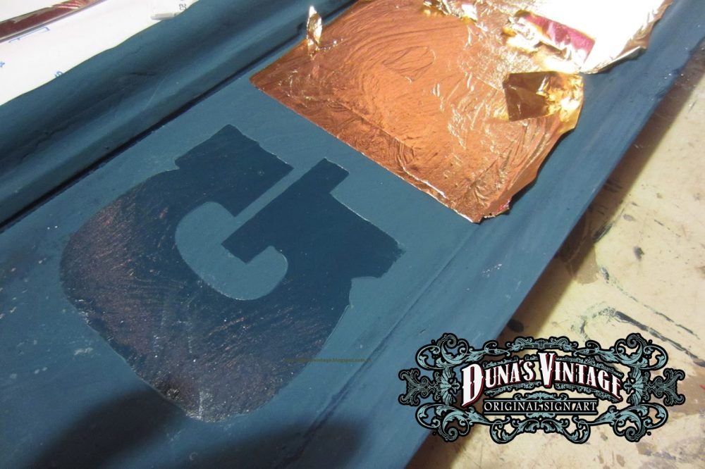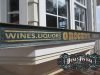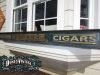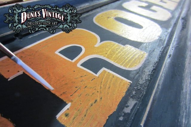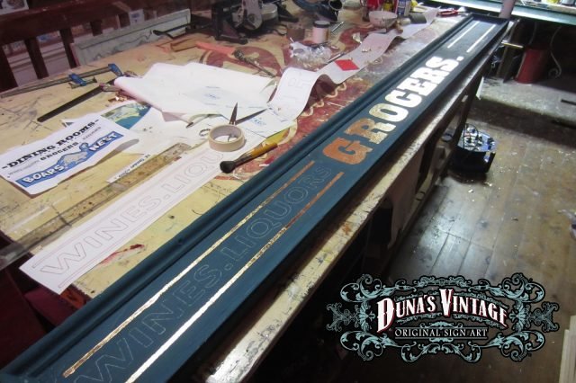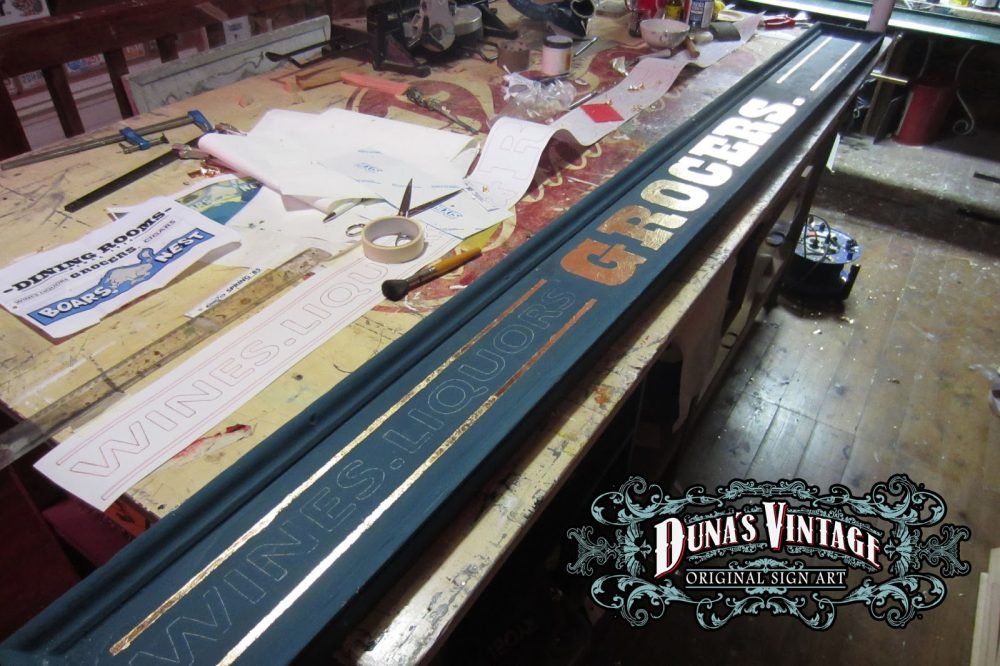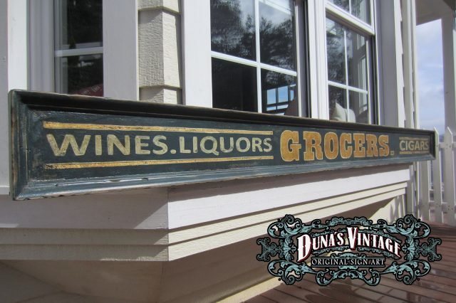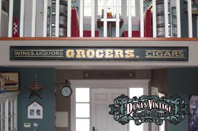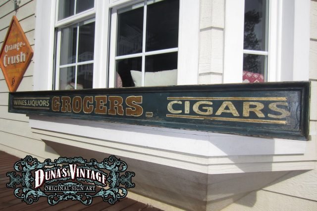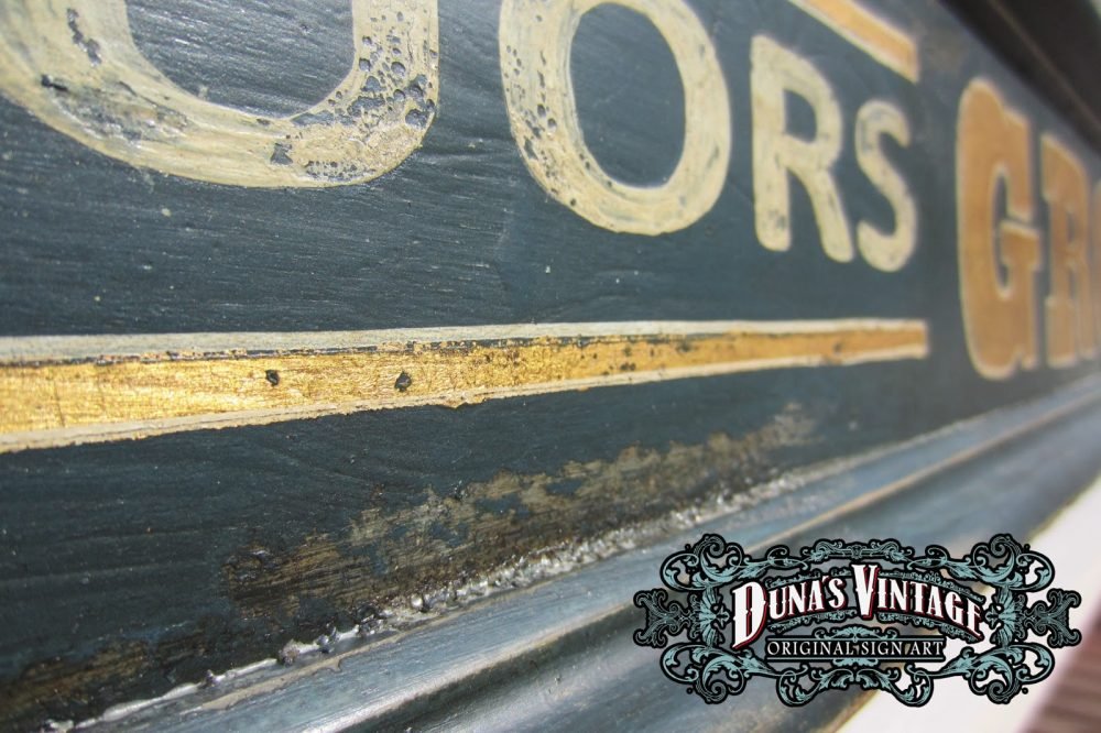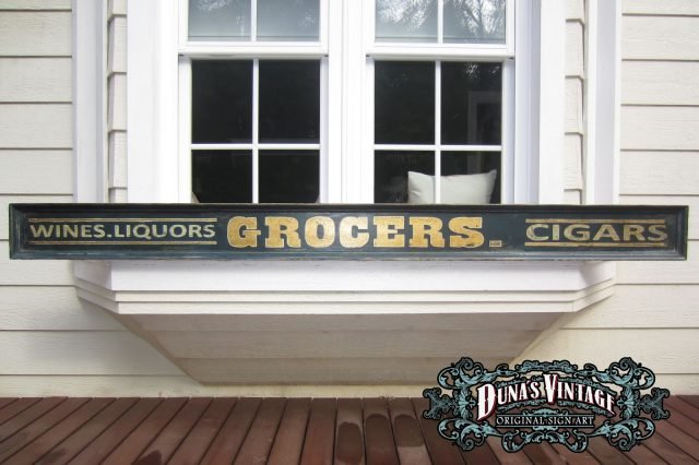 Replica cartel de los años 30. Establecimiento de bebidas y tabaco «GROCERS» tamaño 2300X190mm. En este cartel se han trabajado las letras con Pan de Oro para conseguir el efecto de metalizado, el cartel esta tratado con el efecto Retro que Duna´s Vintage emplea en sus carteles pintados a mano.