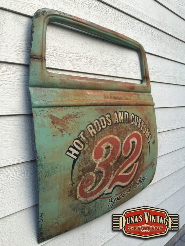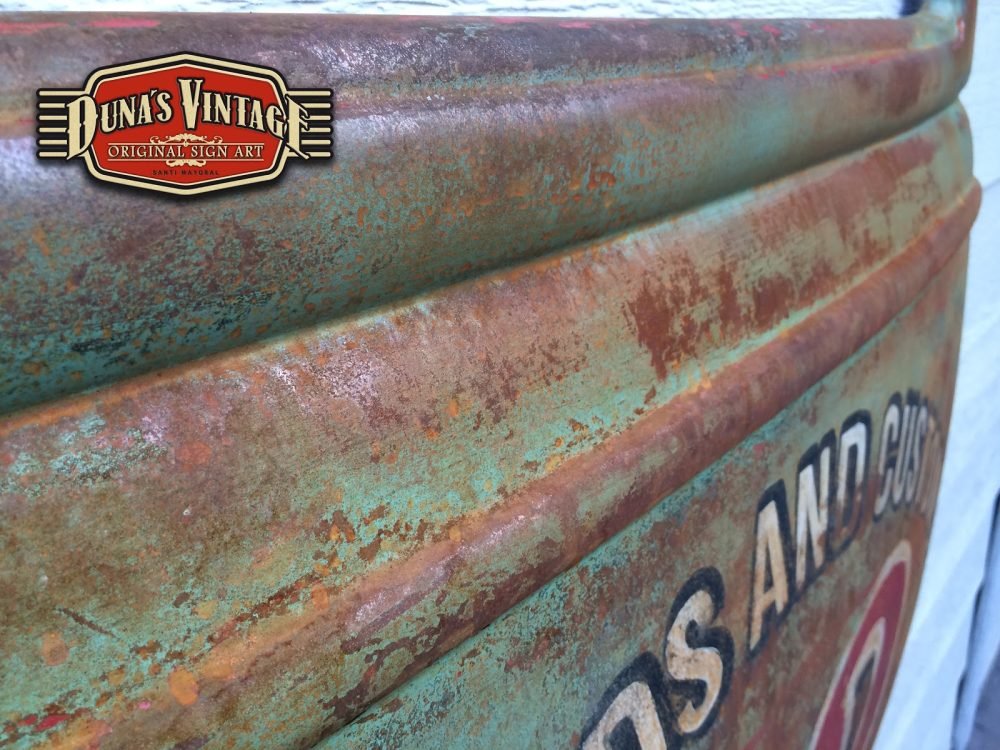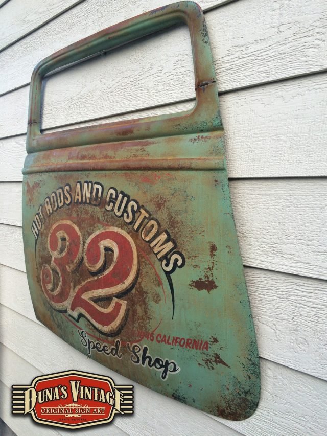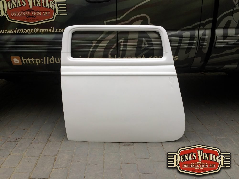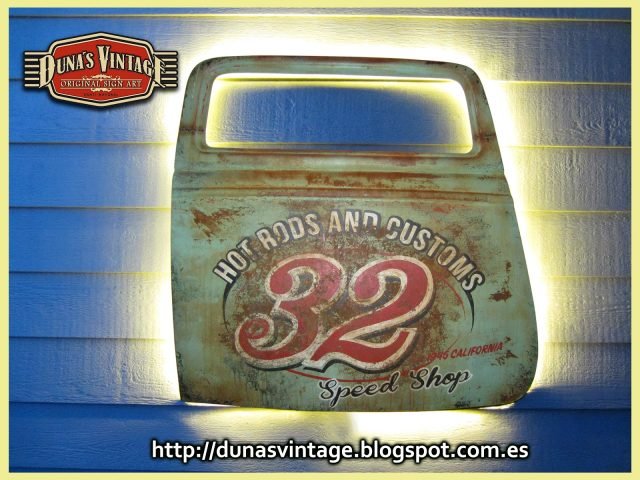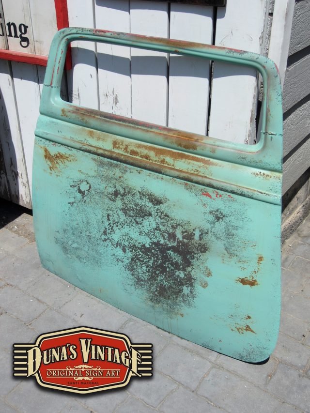 Duna´s Vintage os presenta su ultimo trabajo realizado sobre una puerta de un Ford del 33, la base es una puerta fabricada en fibra de vidrio por la empresa www.rodlineinternational.com como podéis apreciar en las fotos el efecto que se a querido conseguir es el de una puerta de hierro oxidada por los años, podría ser la típica puerta que podríamos encontrar en un granero en estados unidos. Os dejo el paso a paso de cómo se a pintado la puerta son muchas capas de pintura y horas de trabajo para llegar a conseguir el efecto deseado. A parte se le a colocado un soporte y luz trasera para colgar en la pared y darle un toque muy autentico para tu Garaje, Bar, o donde quieras tener un toque muy autentico.