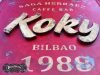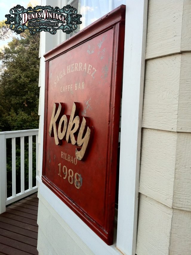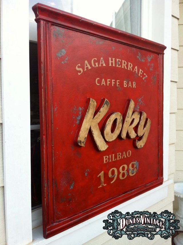 Cartel «KOKY CAFFE BAR BILBAO» tamaño 800x800mm. Este cartel esta tratado con el efecto Retro que Duna´s Vintage emplea en sus carteles pintados a mano. La letras se han trabajado en relieve con madera para darle el efecto de volumen.(Hay algunos carteles que se han vendido pero se pueden hacer otros iguales o personalizados con el texto que se quiera). Duna´s Vintage.