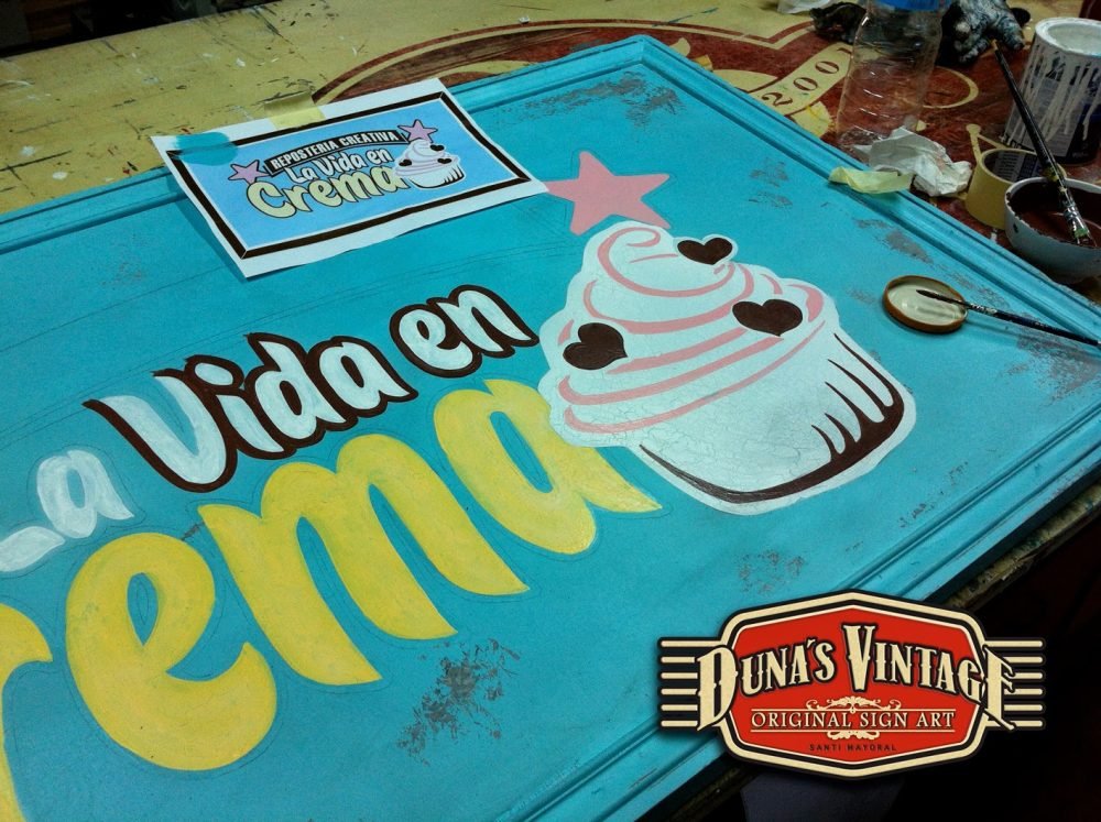 Cartel «La Vida en Crema».Tamaño 1200x700mm. Cartel para nueva pastelería en Burgos, este cartel esta tratado con el efecto Retro que Duna´s Vintage emplea en sus carteles pintados a mano. (Hay algunos carteles que se han vendido pero se pueden hacer otros iguales o personalizados con el texto que se quiera). Duna´s Vintage.