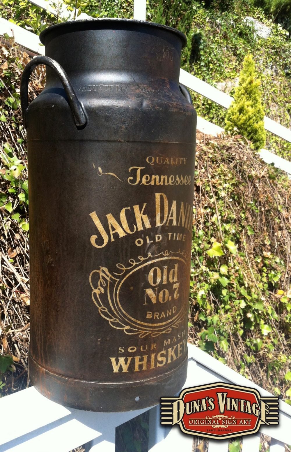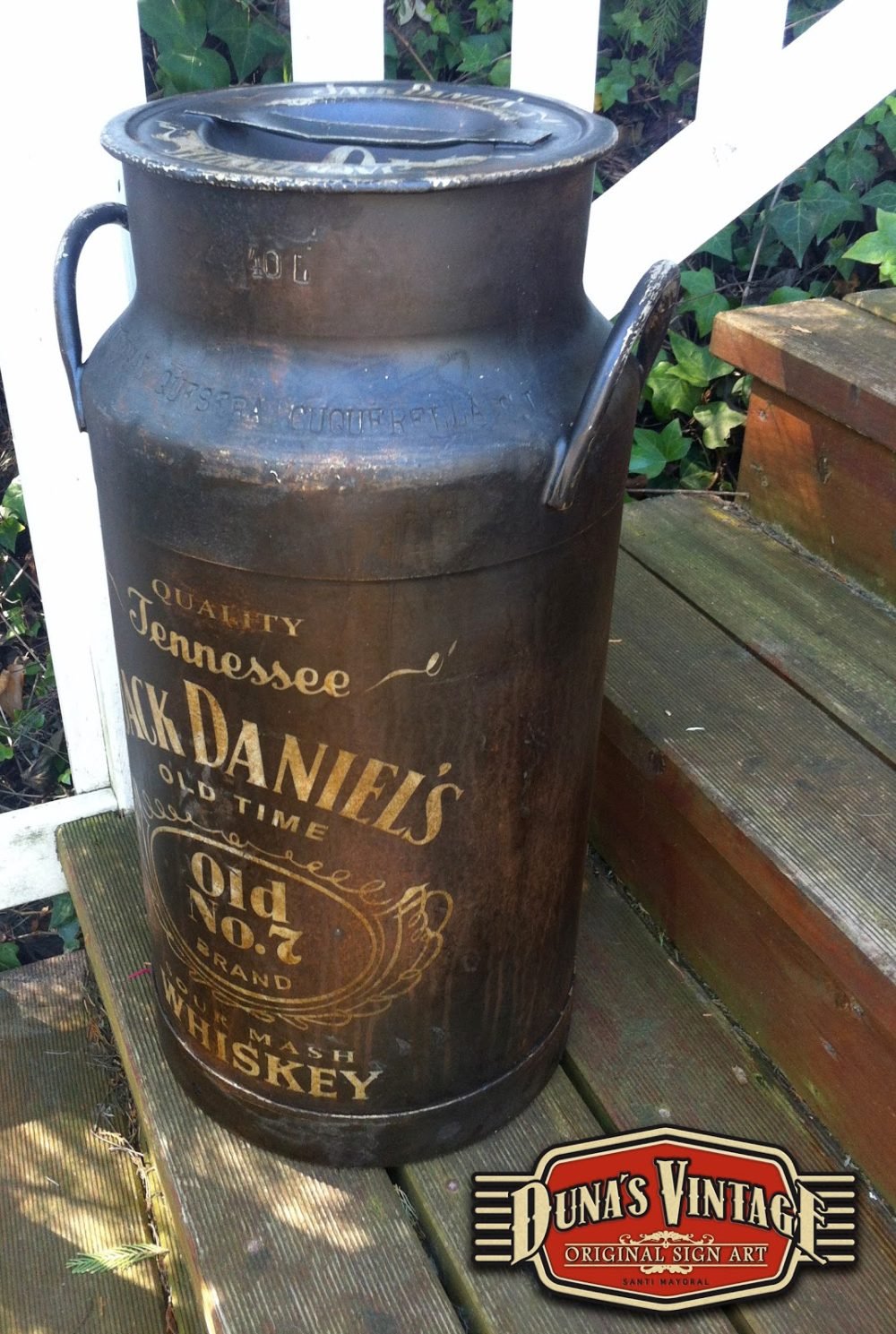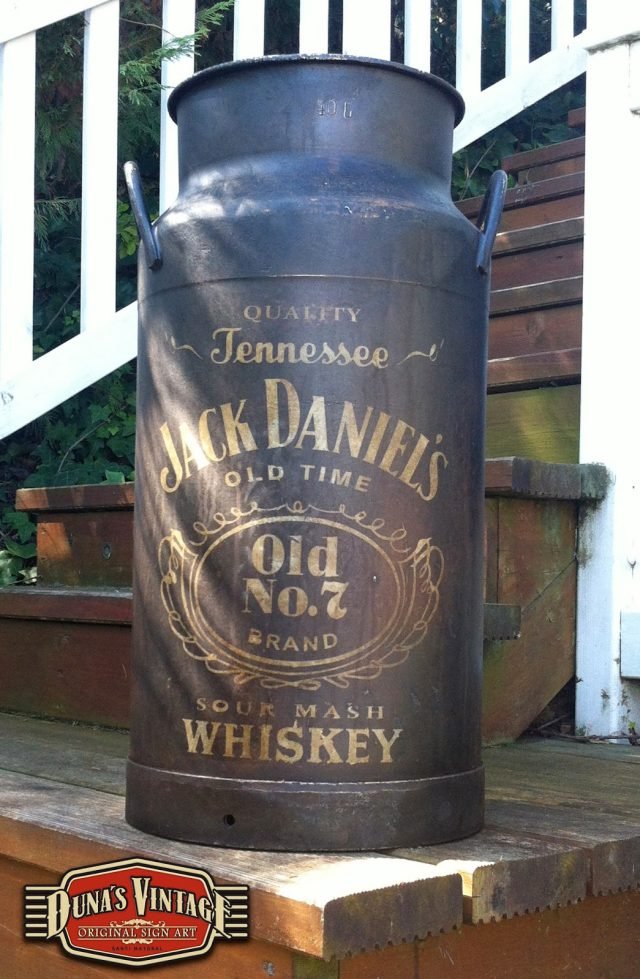 Lechera 40L. Pintada de Jack Daniel´s esta lechera es de aluminio, primero se a oxidado con unos productos especiales y luego se a pintado de color negro y texto blanco y se a activado la oxidación para darle este aspecto. Es un proceso lento pero el acabado final es muy autentico. For Sale 200€