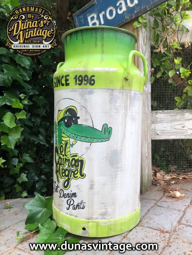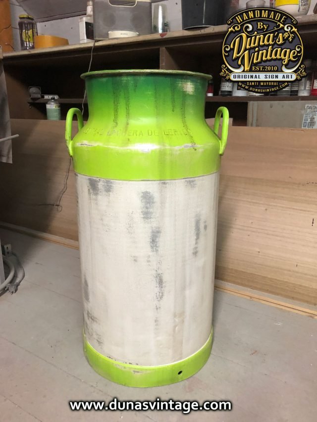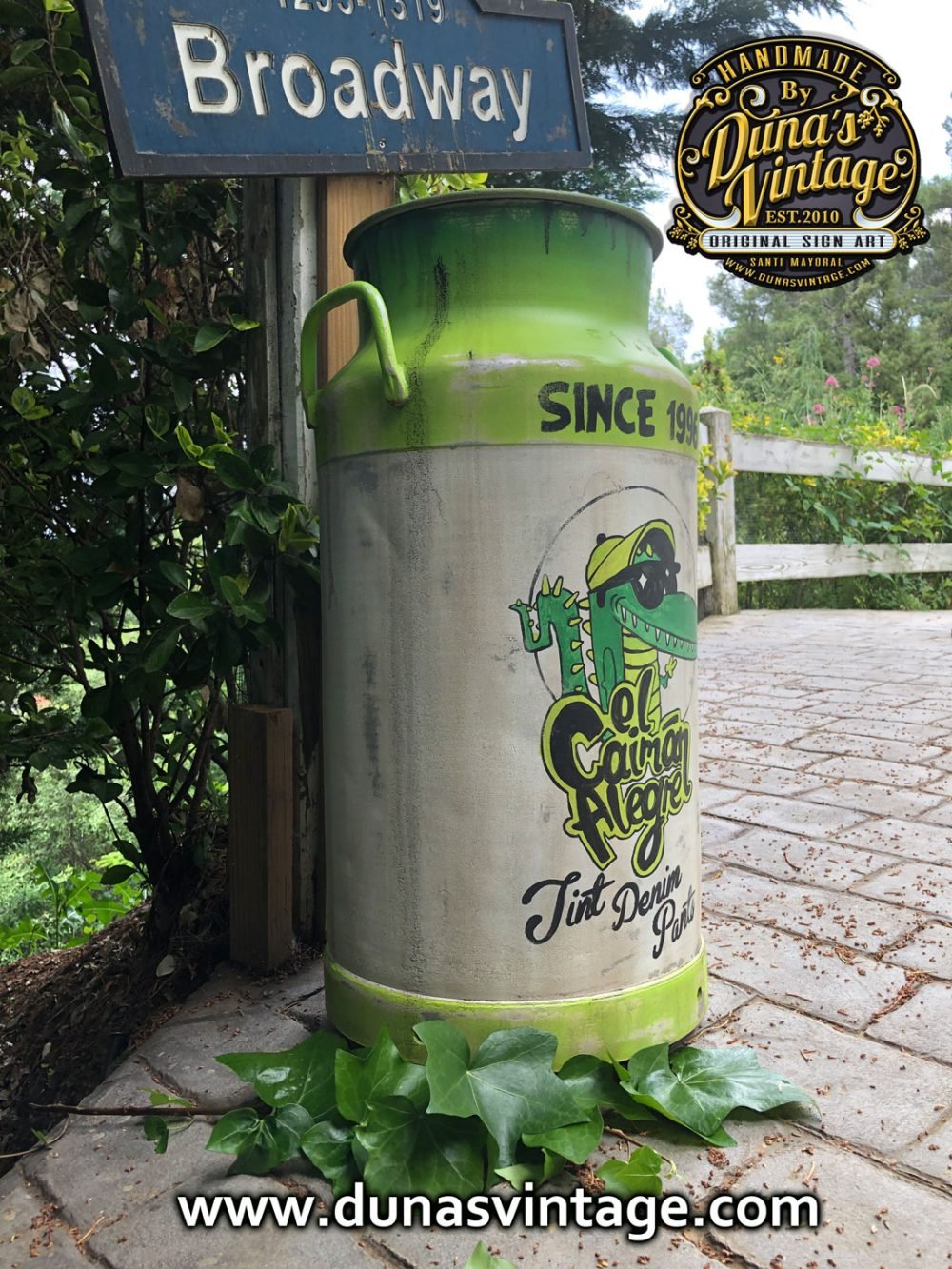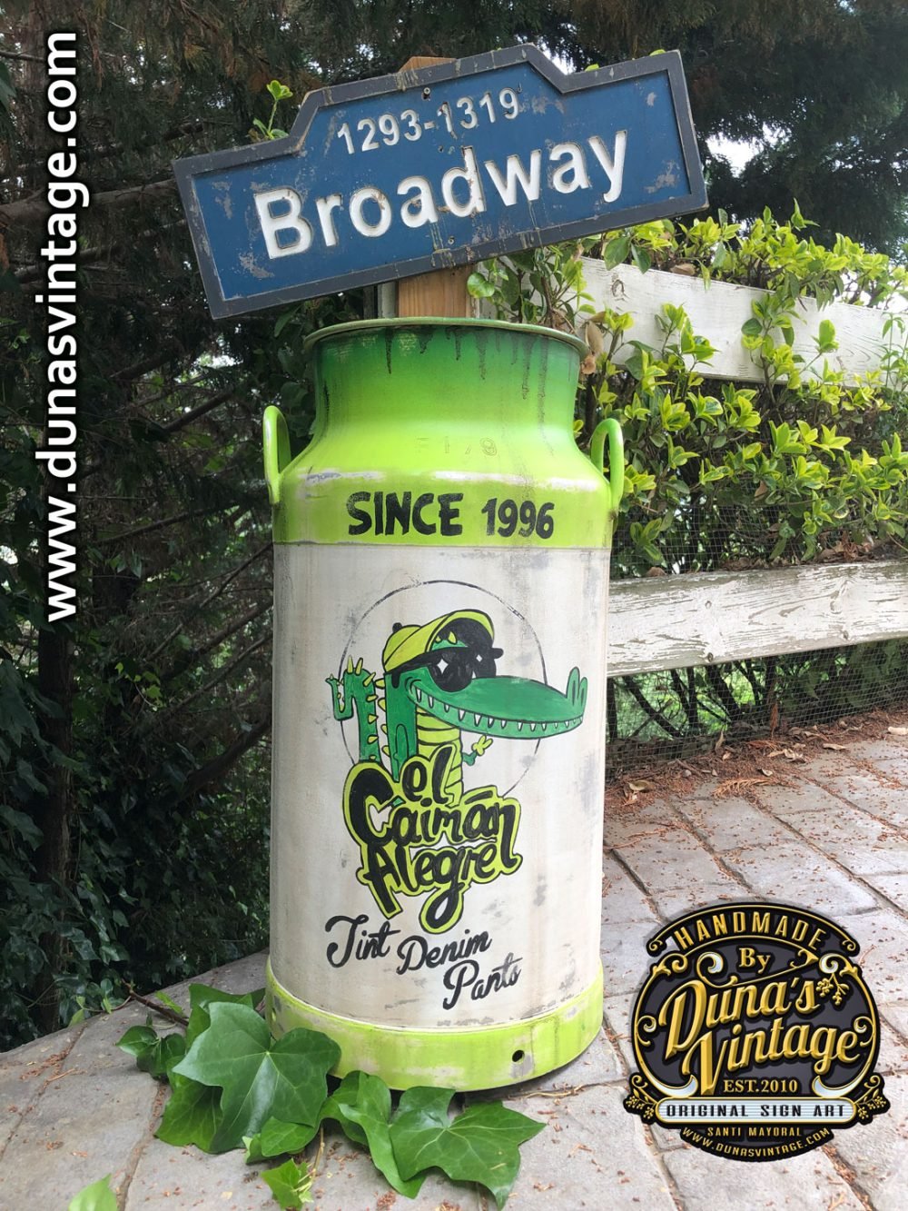 Lechera de Aluminio de 40L pintada para David de la tienda El Caimán Alegre de Barcelona.