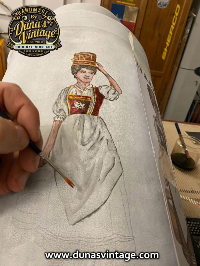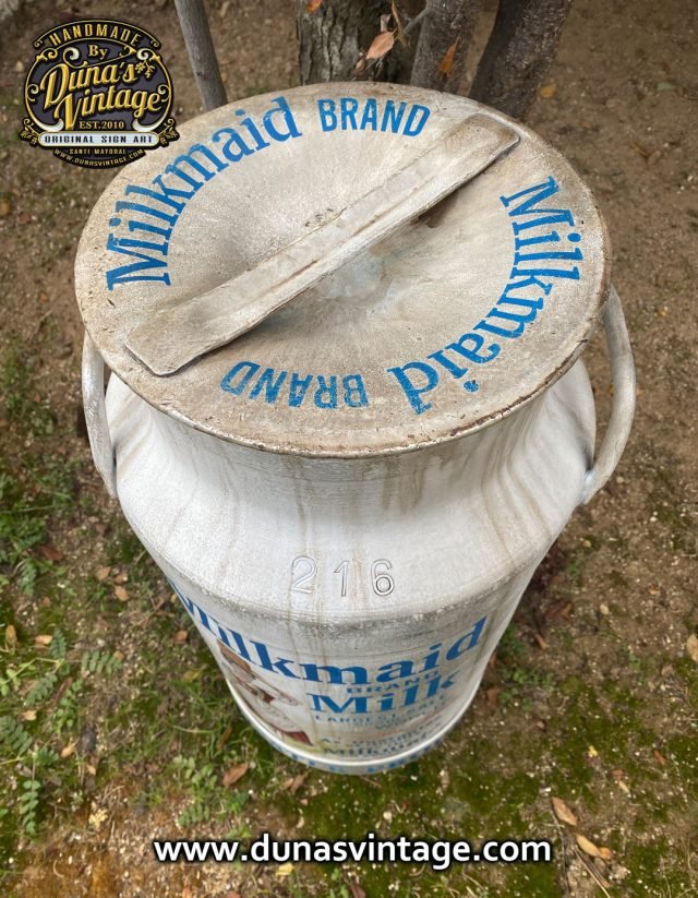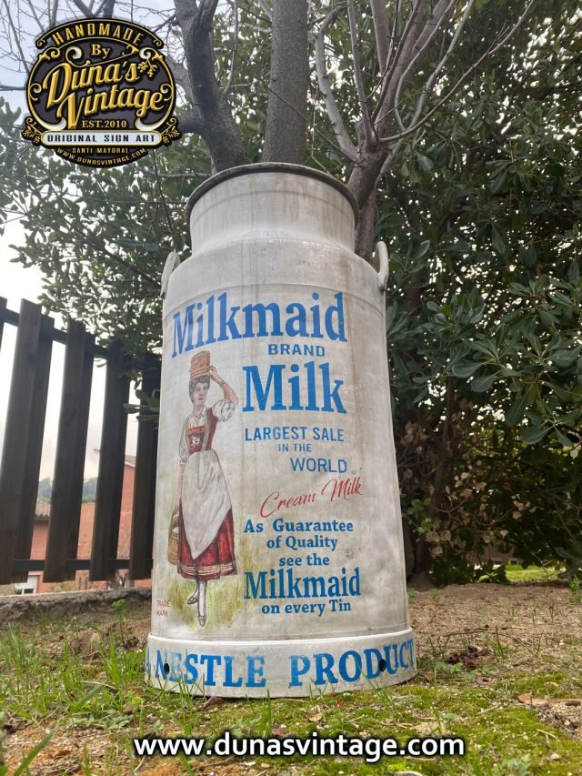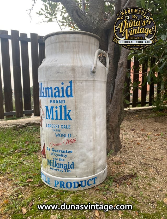 Lechera de Aluminio de 40L. personalizada de la marca Milkmaid Brand Milk con ilustración de la Lechera. A la venta en la tienda de la web de Duna´s Vintage.