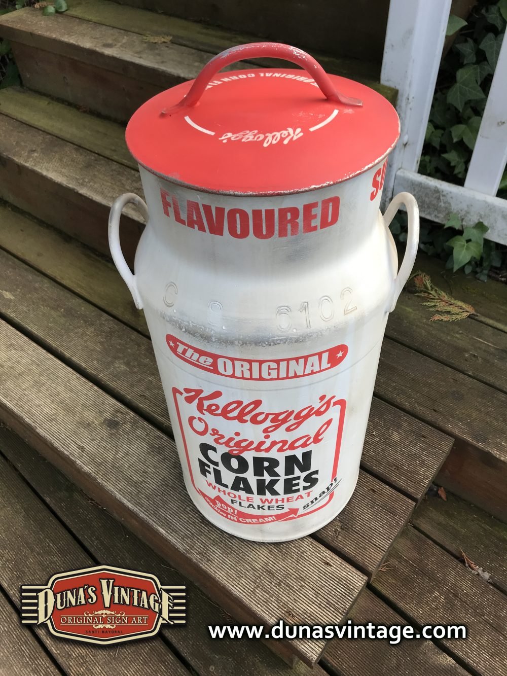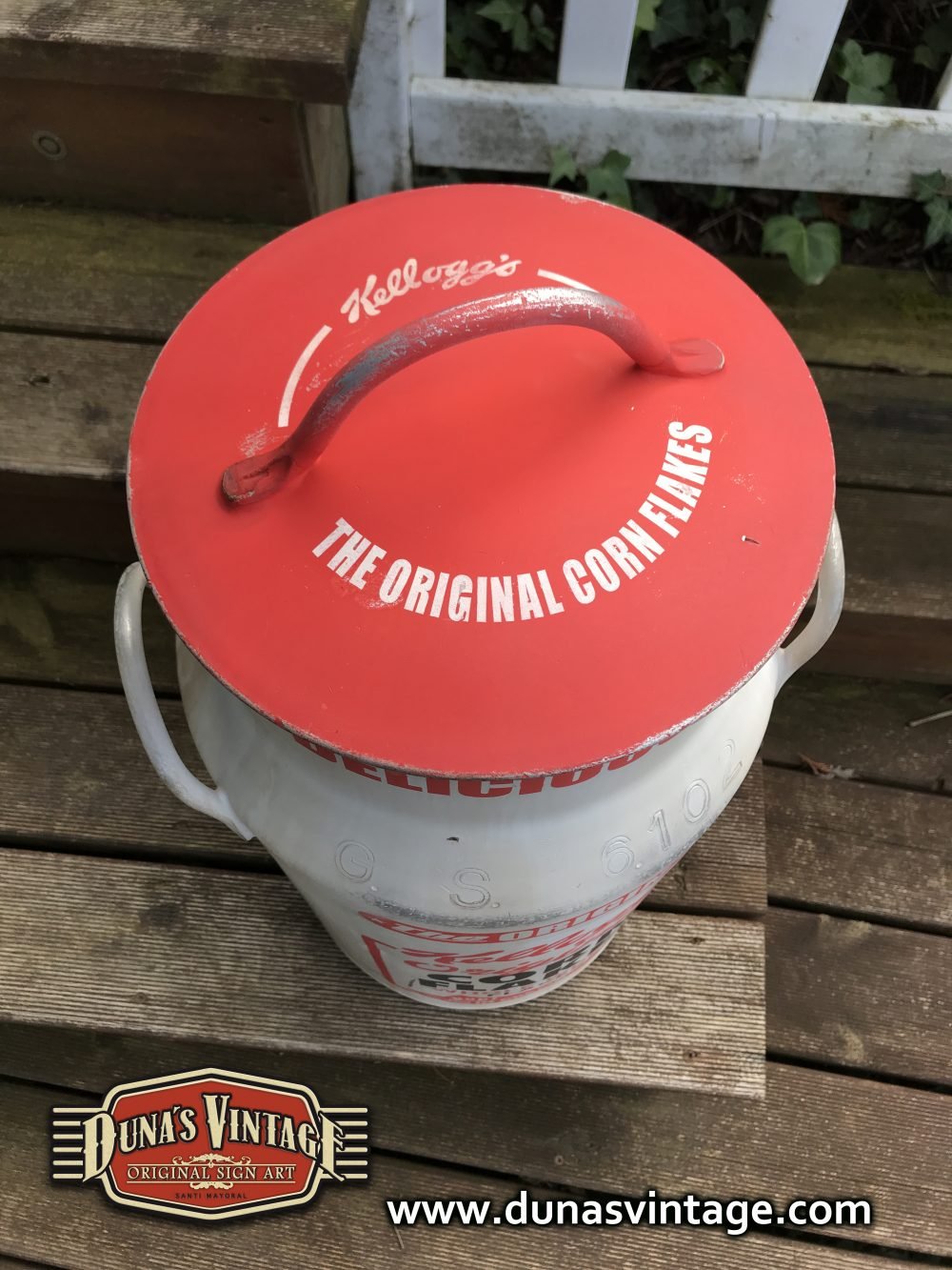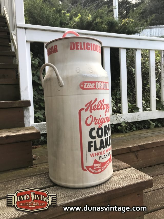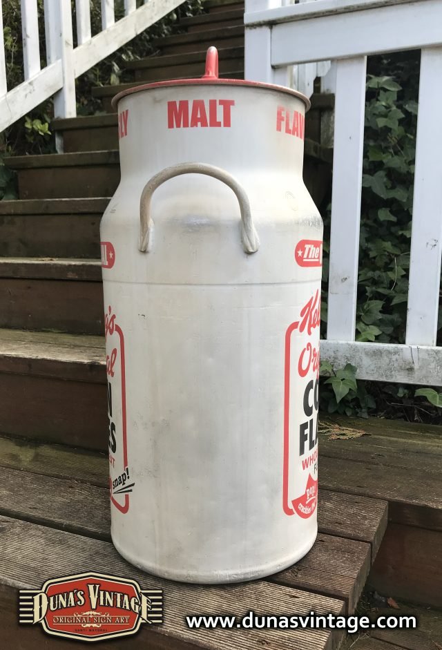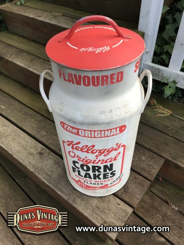 Lechera de aluminio pintada a mano de 40L pintada de la marca Kellogg´s Original, Duna´s Vintage.