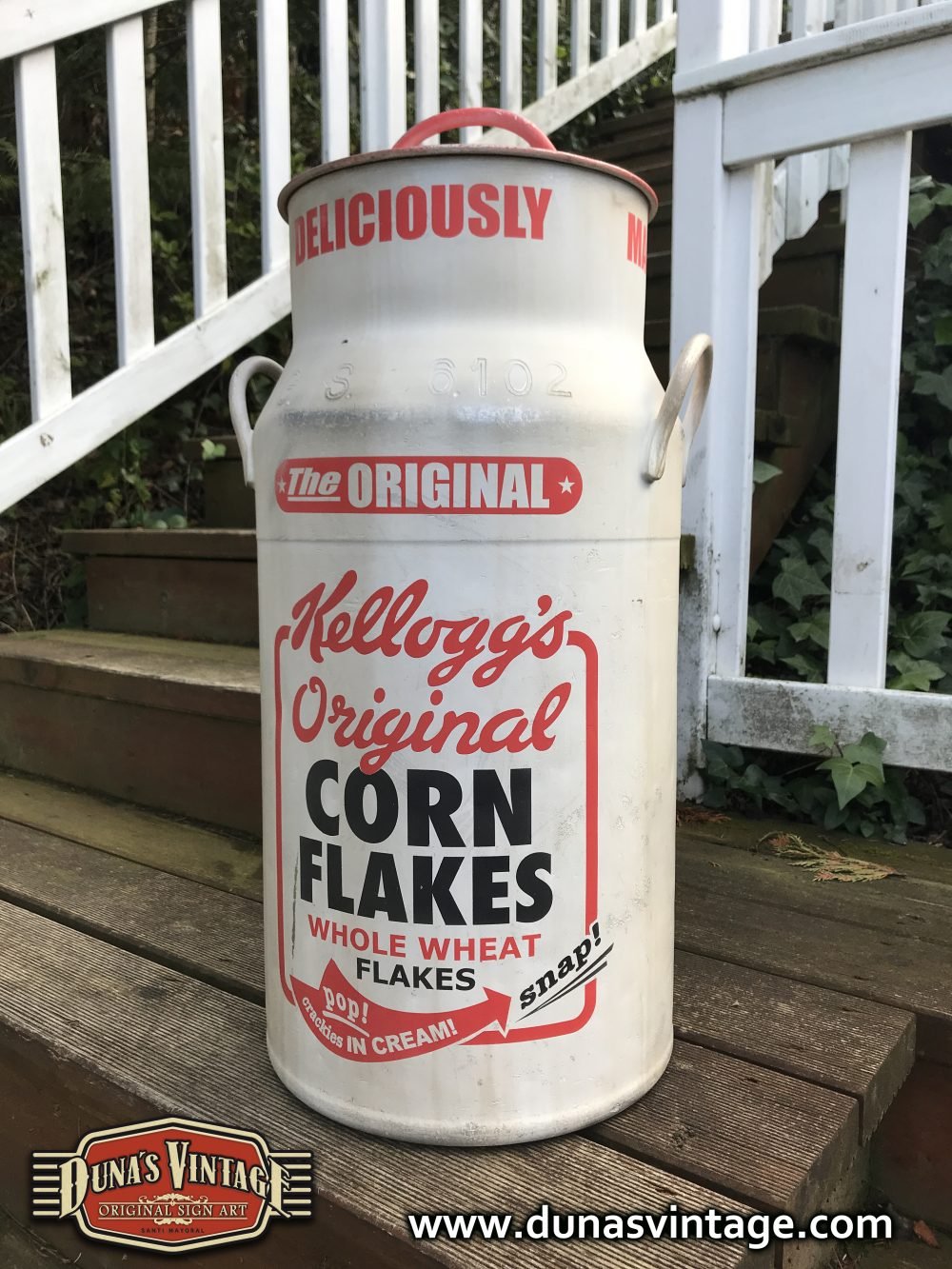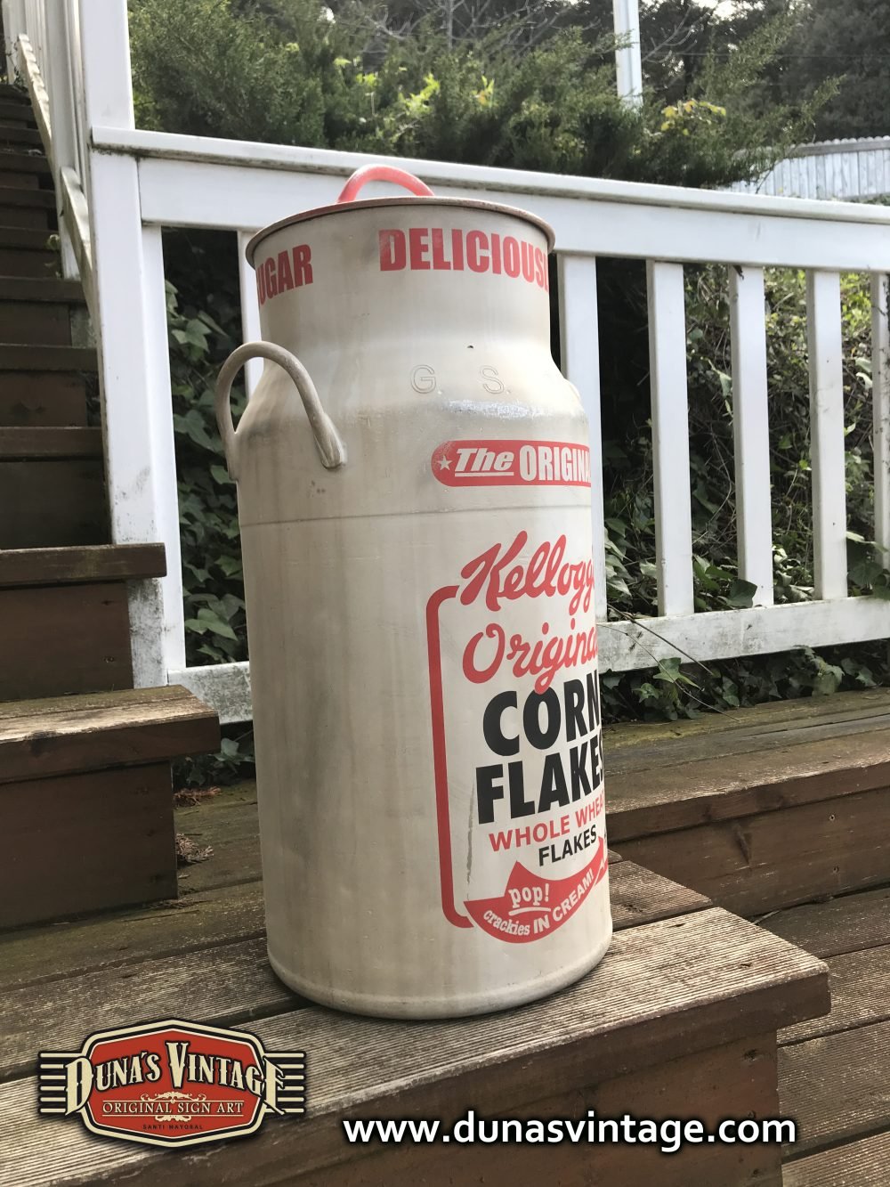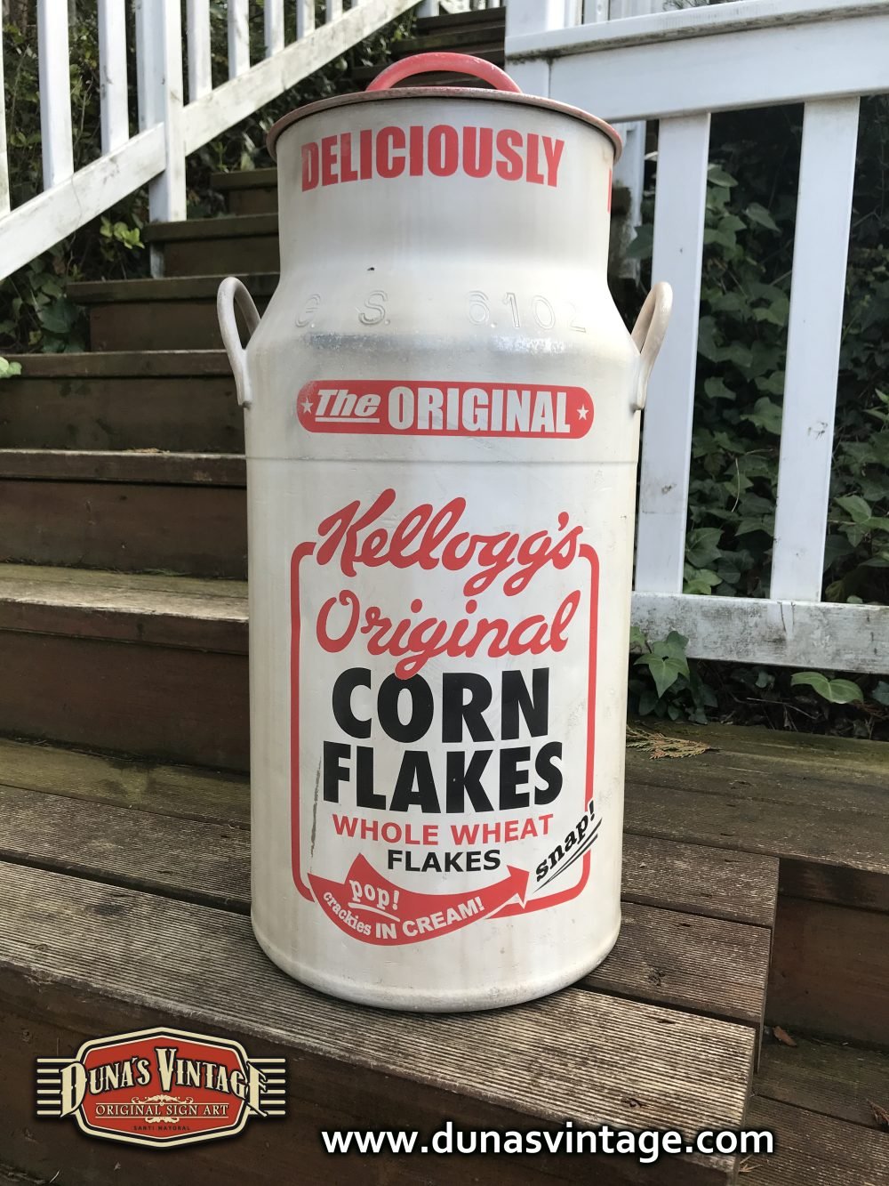 Lechera de aluminio pintada a mano de 40L pintada de la marca Kellogg´s Original, Duna´s Vintage.