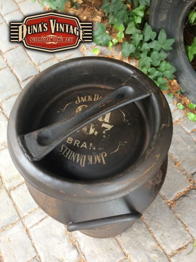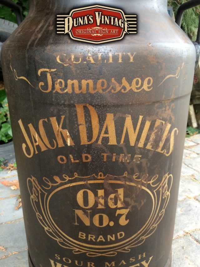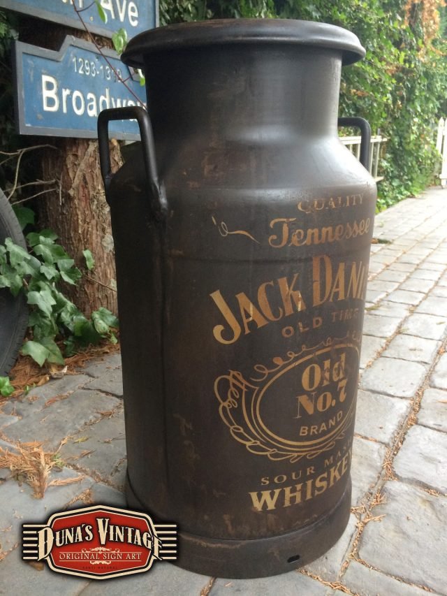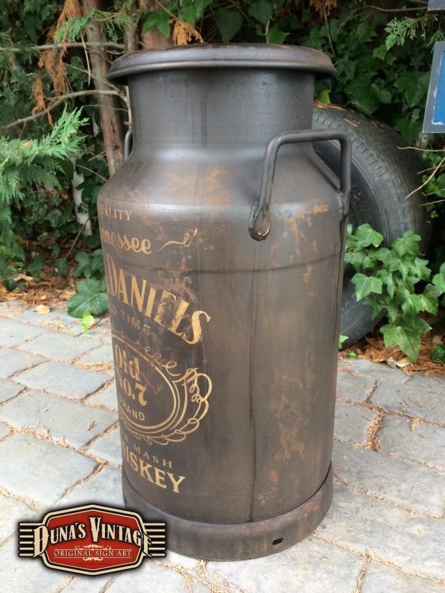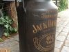 Lechera de aluminio de 30L pintada de Jack Daniels, esta lechera esta pintado con el efecto de oxidado que Duna´s Vintage emplea en sus carteles y se va para Alcorcón Madrid.