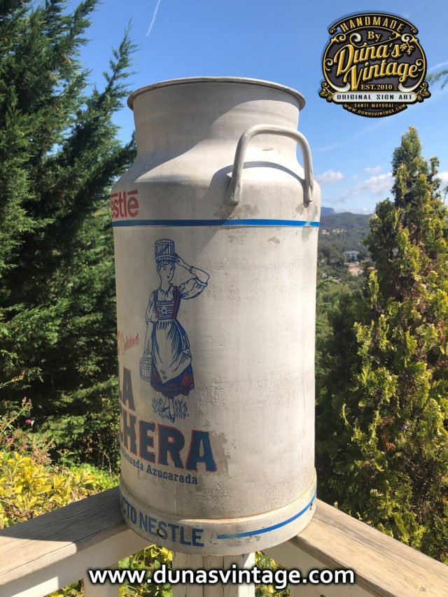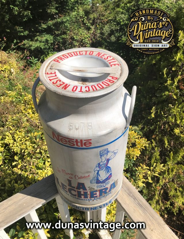 Lechera de Aluminio de 40L. personalizada de la marca La Lechera de Nestle con el acabado retro que Duna´s Vintage le da a sus trabajos.