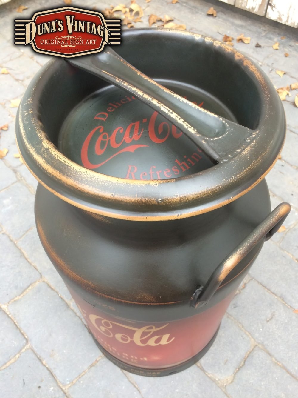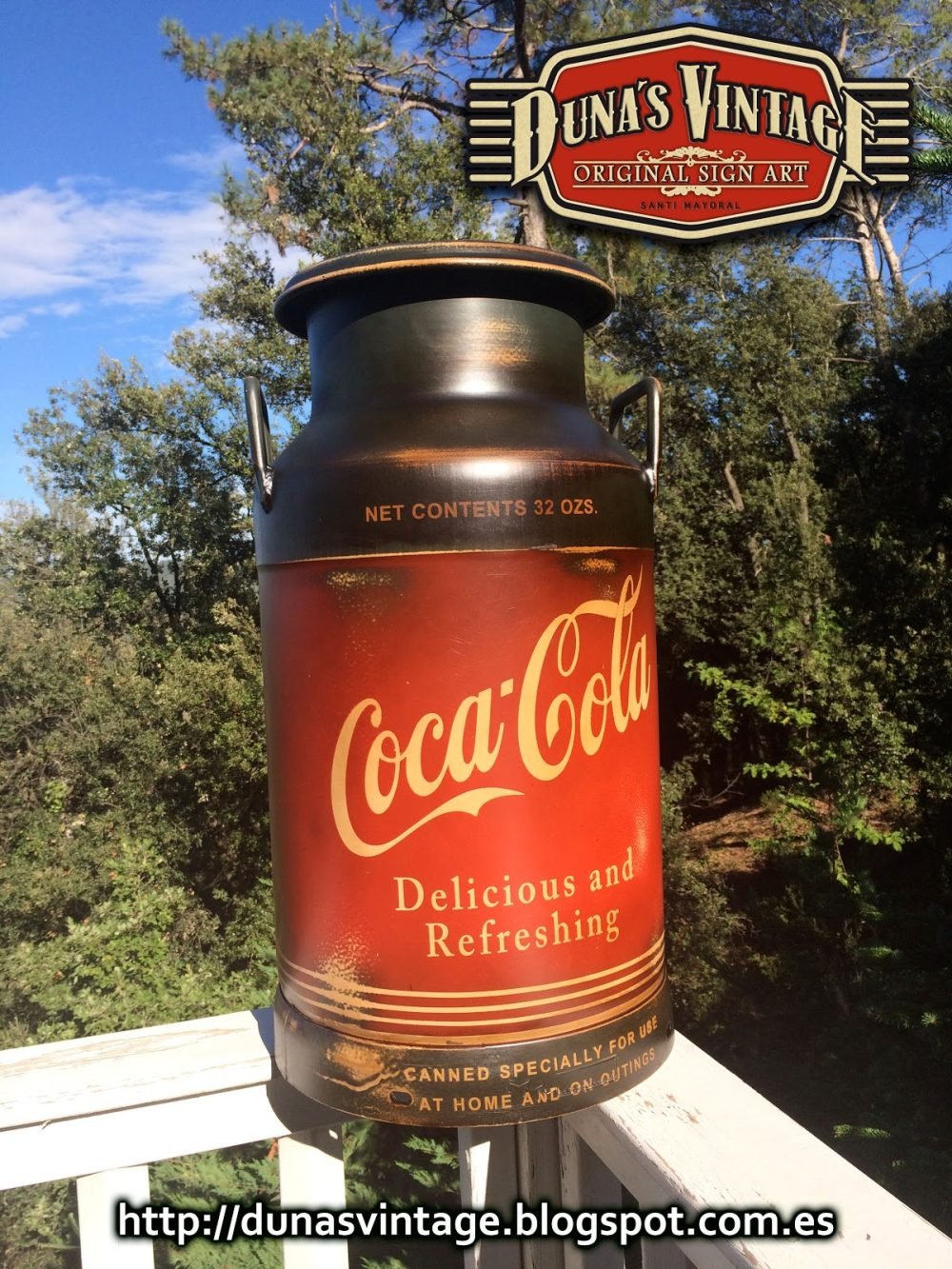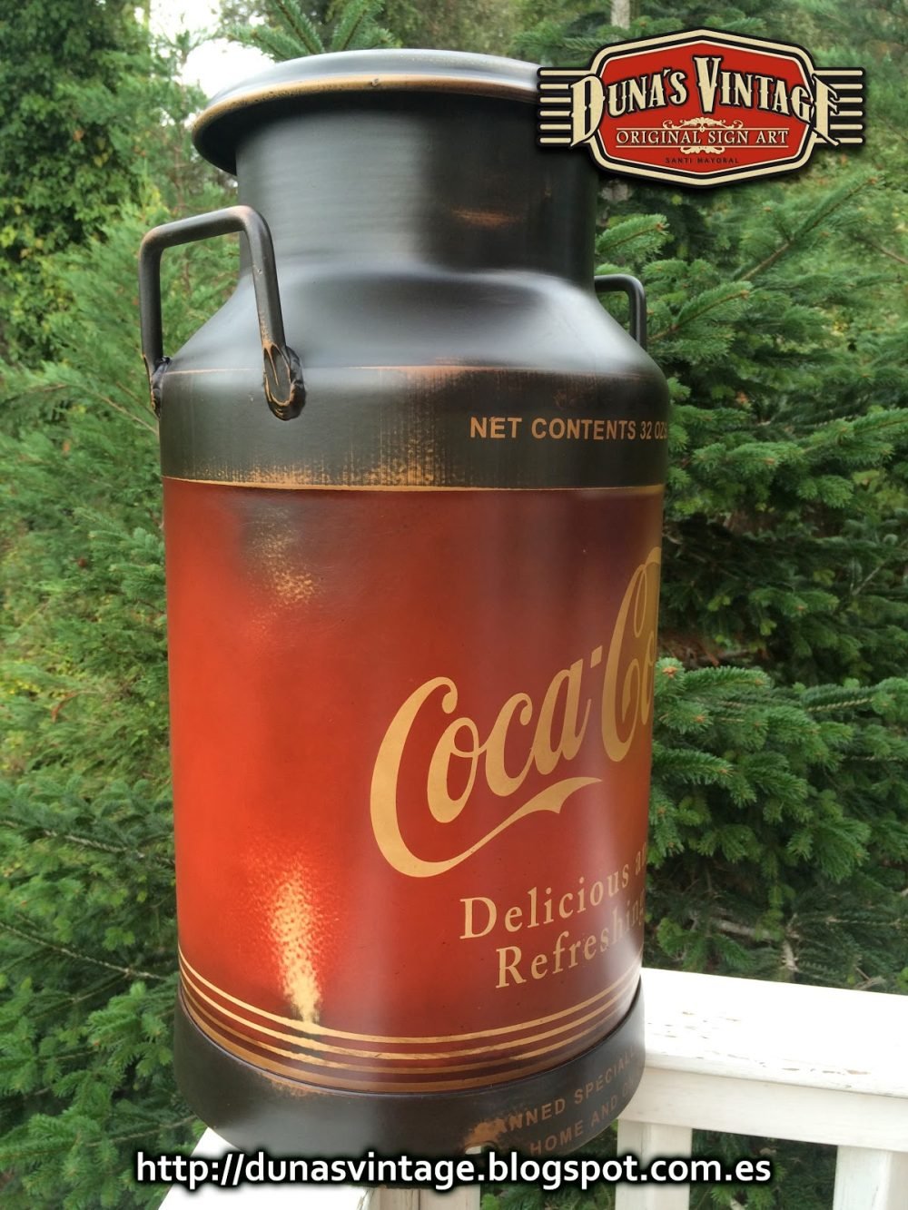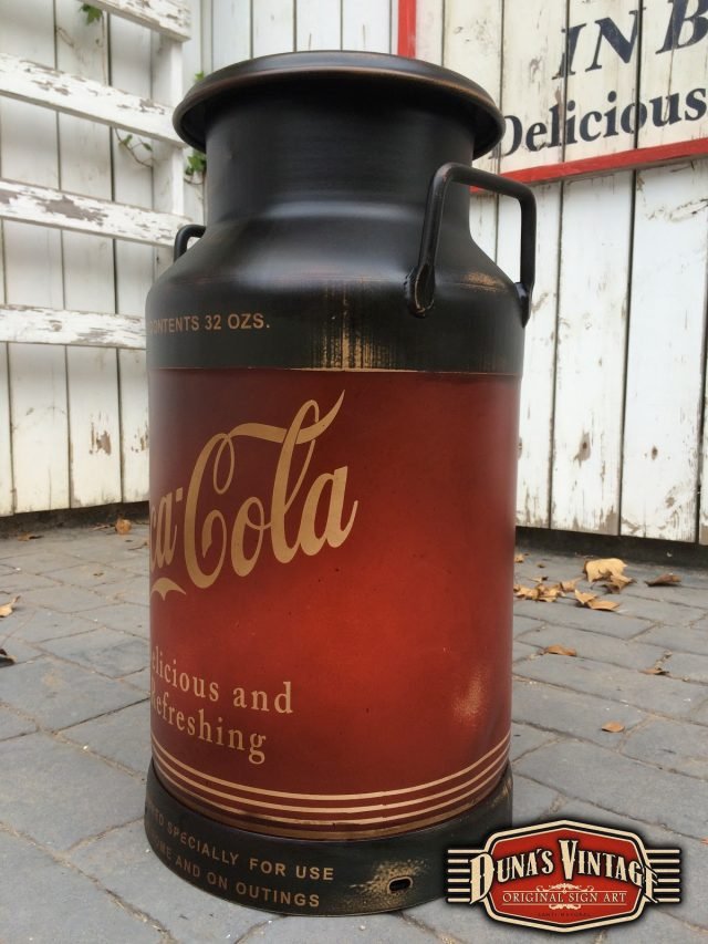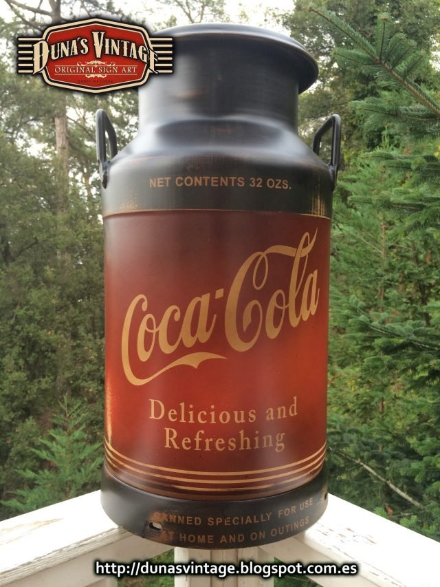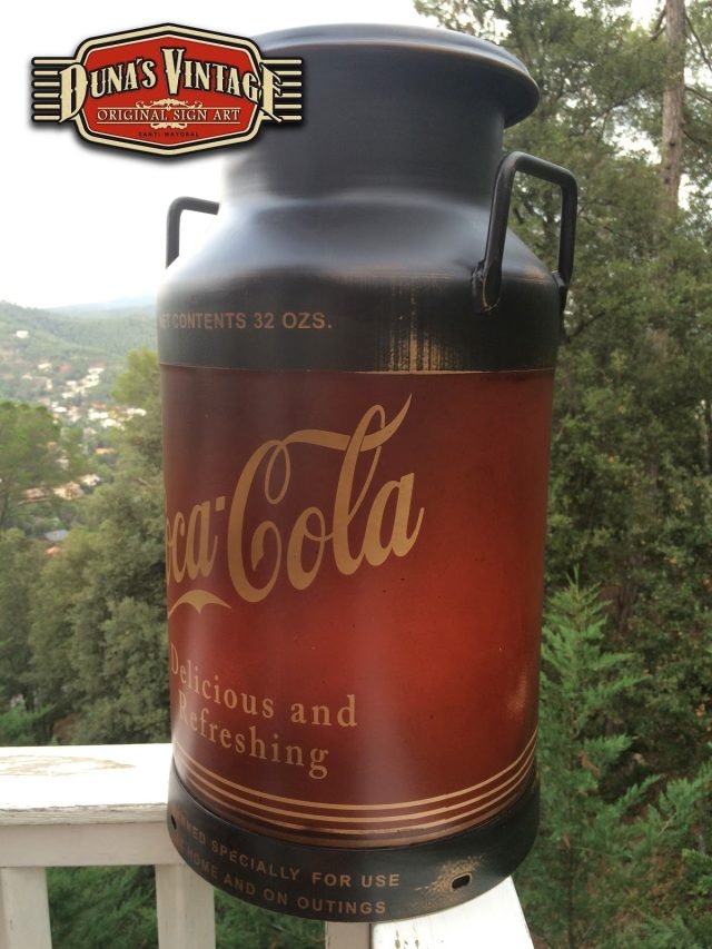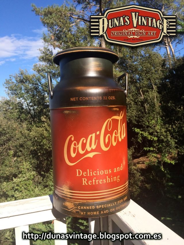Lechera pintada de Coca-Cola, esta lechera esta trabajada con las técnicas que Duna´s Vintage emplea en sus trabajos.