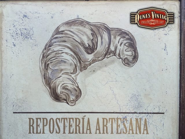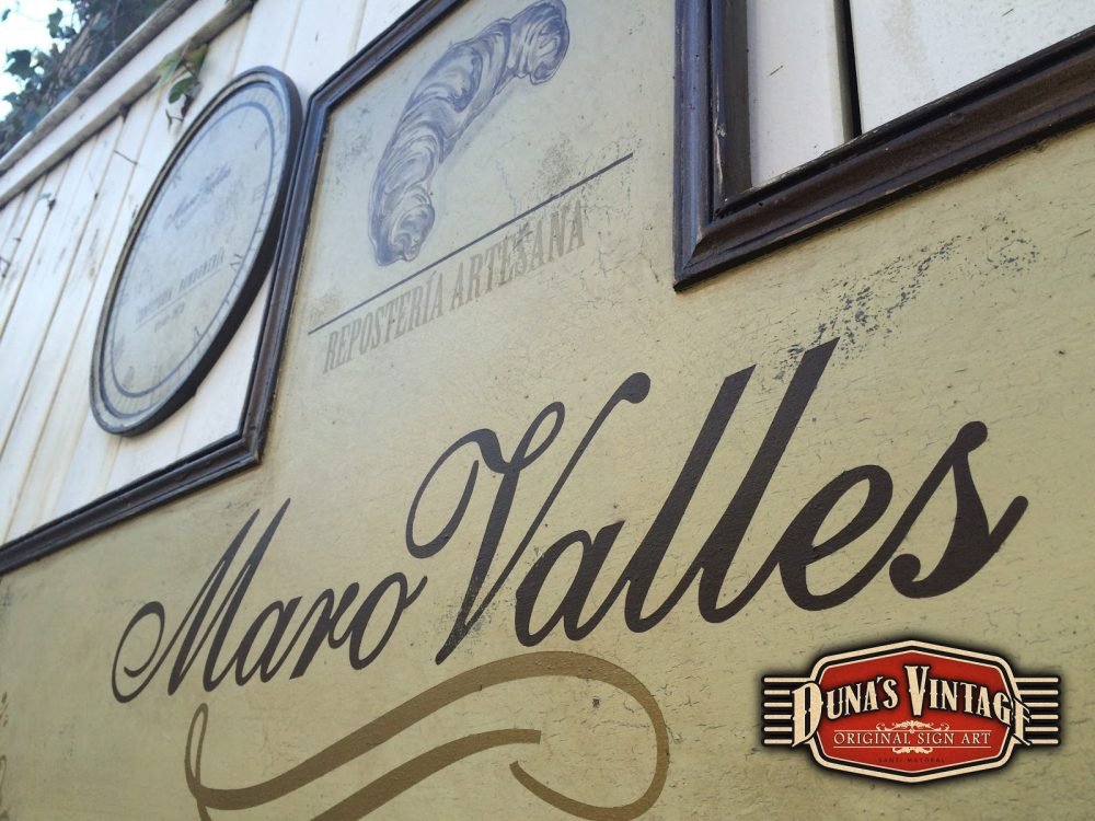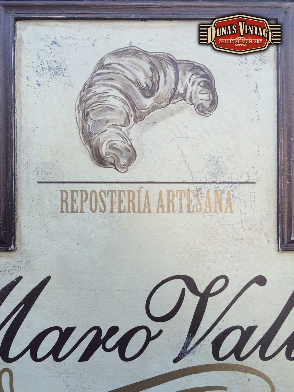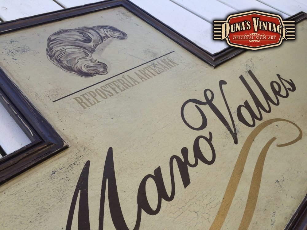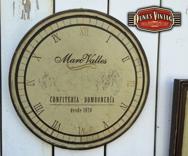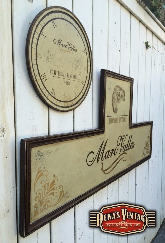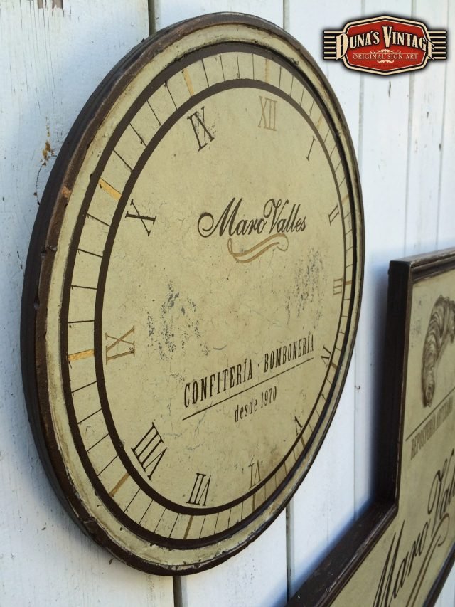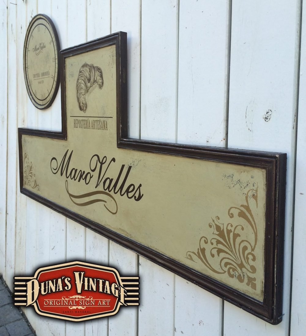 Cartel para Maro Valles Repostería Artesana (Valladolid), el tamaño del cartel es de 1400x620mm y el Reloj de 400mm de diametro, esta acabado con la técnica que Duna´s Vintage emplea en sus carteles.