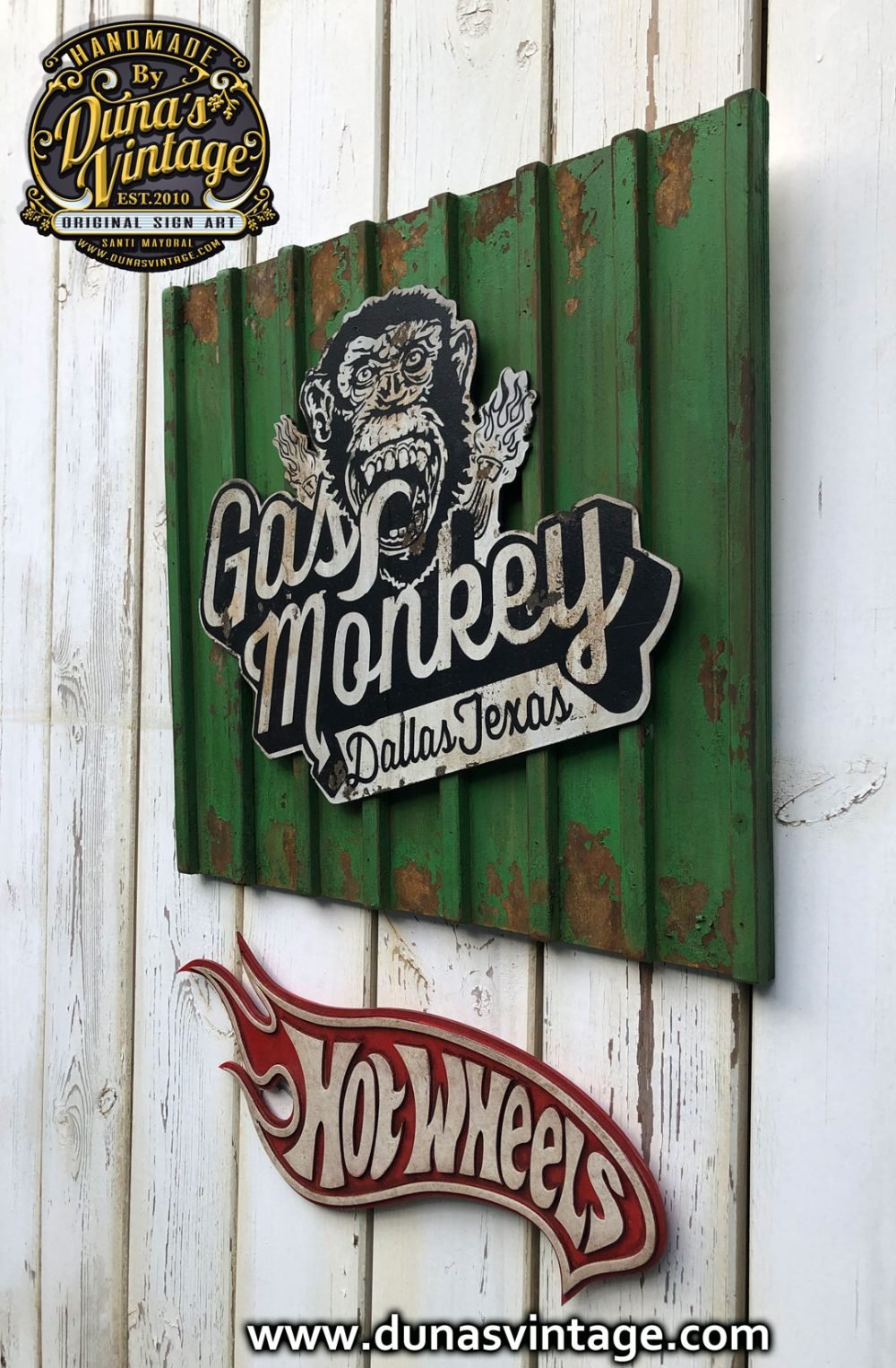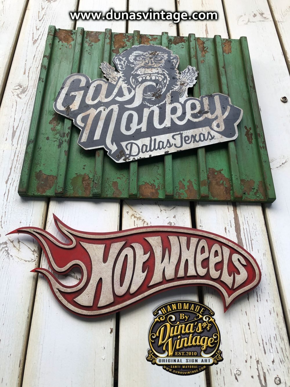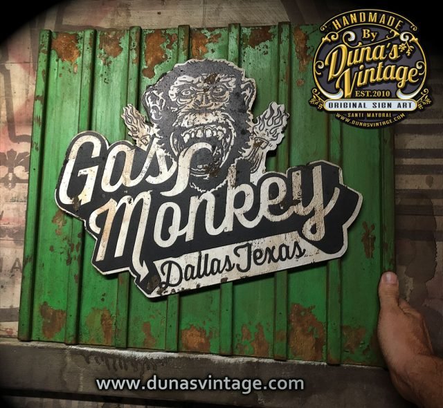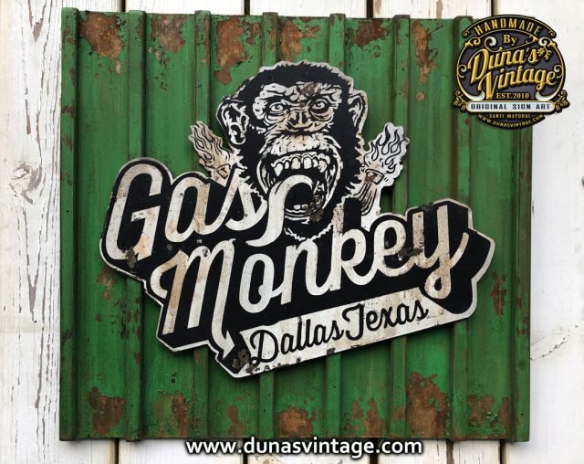 Encargo para Frederic del norte (Francia) Cartel de Gas Monkey tamaño 50x55cm trabajado en madera y con efecto oxido de la marca Owatrol y toques envejecido Vintage, Cartel Hot Wheels tamaño 50×18,5cm trabajado en madera cortado a laser y efecto envejecido Vintage.